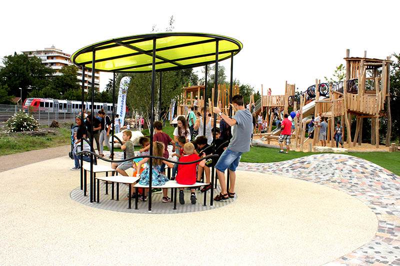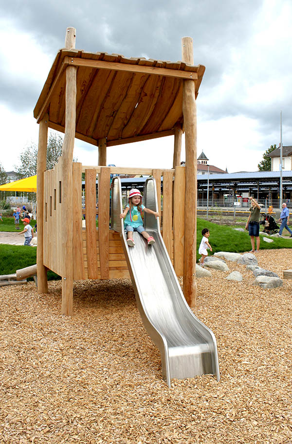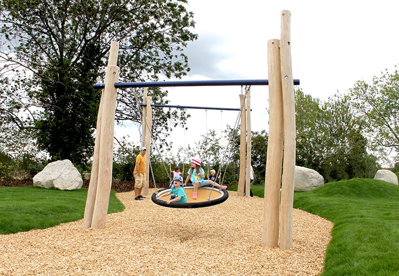 In mehreren Beteiligungsprozessen hat das Planungsbüro des Landschaftsarchitekten Dirk Schelhorn die Wünsche der künftigen Nutzer eruiert und weitgehend umgesetzt. Und so ist eine Anlage ganz nach dem Geschmack der Grünstaedter entstanden. Zu ihren Hauptattraktionen zählen die Rollsportanlage und der Boulderfelsen für Skater- und Kletterfreunde, die ausladende Spiel- und Kletterlandschaft aus Holz mit integrierter Rutsche sowie die Generationenschaukeln, der Balancierbalken und die aus Hölzern und Steinen bestehende Balancierstrecke, die beide Teile der langgestreckten Anlage miteinander verbindet.