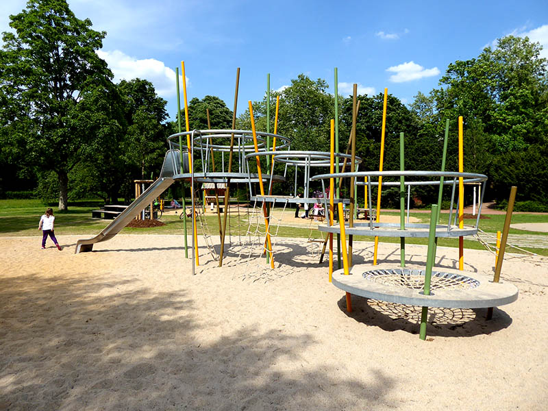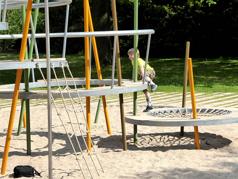 Die Ringespiele erlauben luftiges Klettern in ungewöhnlicher Form. Kreisrund mit schrägen Pfosten integrieren sie sich in die Gräserlandschaft und ermöglichen Klettern und Hangeln in moderner Form. Senkrechte Netze erlauben das Klettern in die Ringe, Netzböden federn oder dienen als Ruhepunkt.