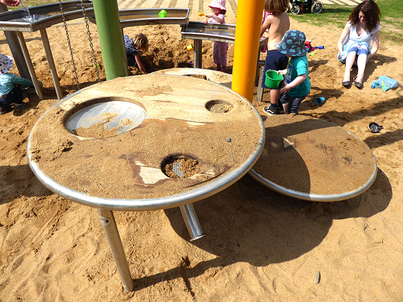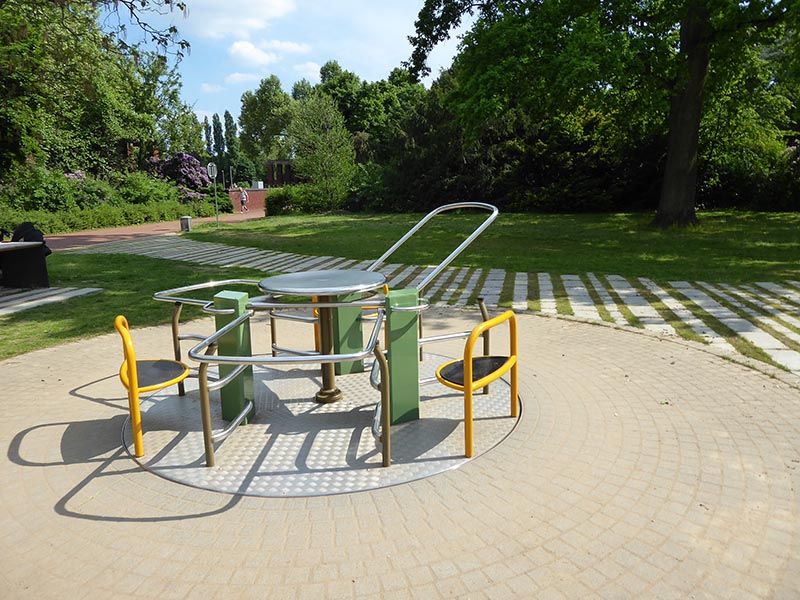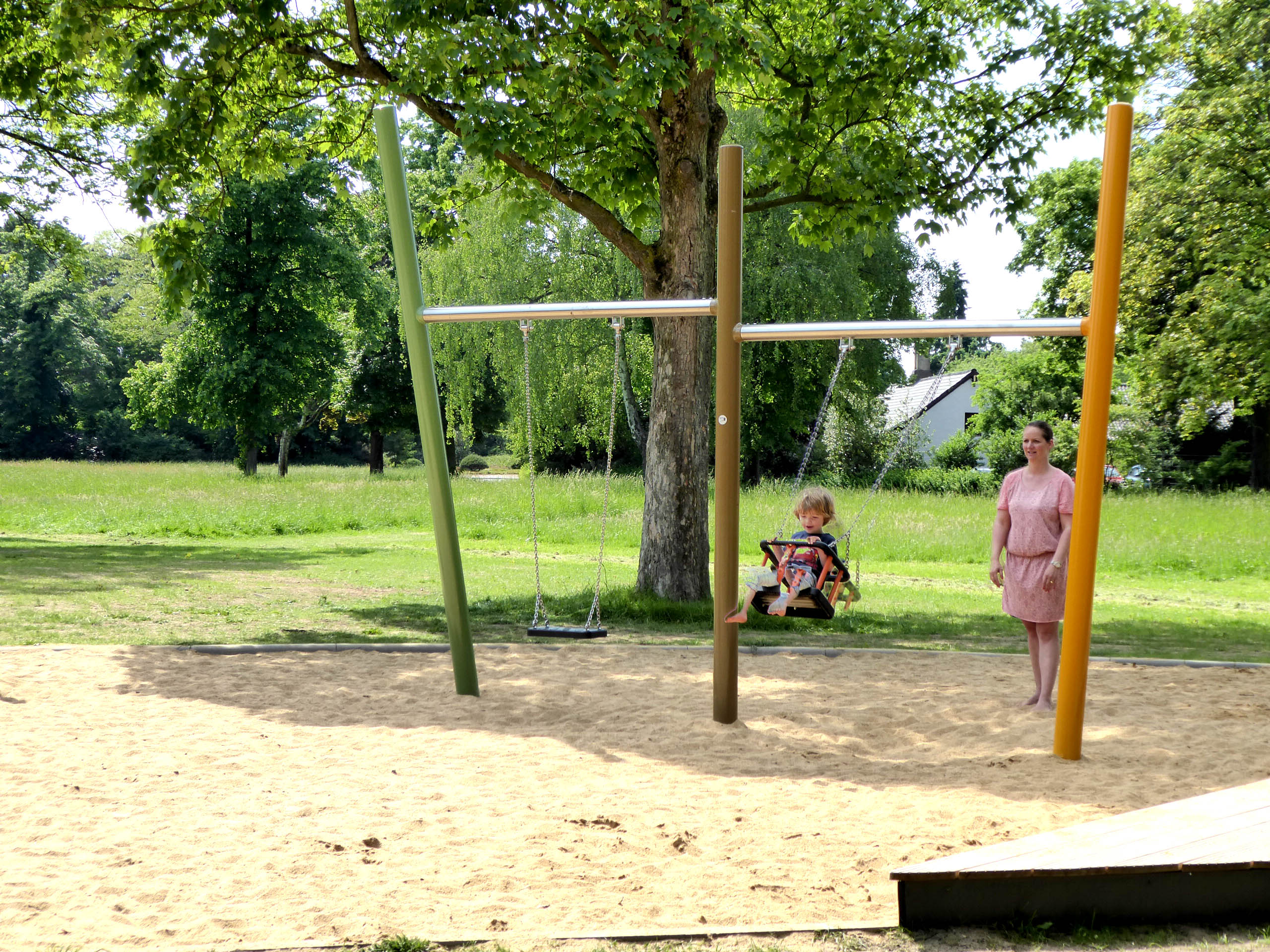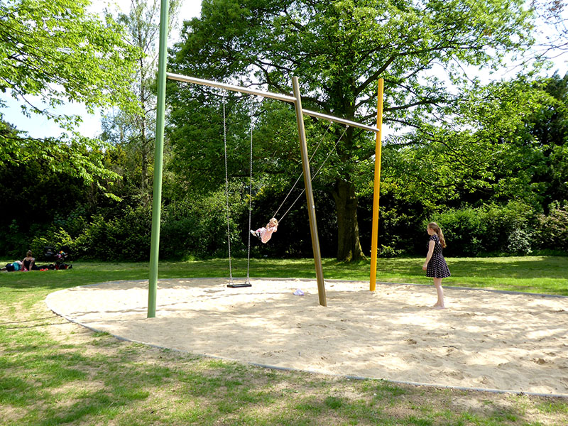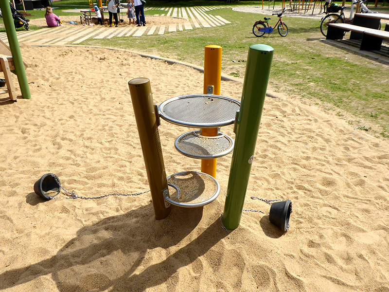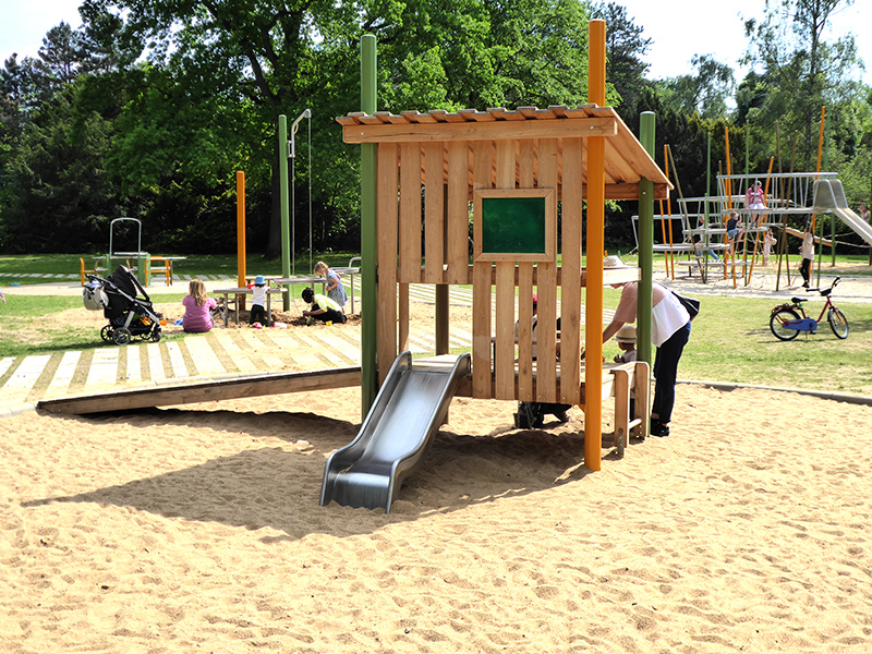 Himmelsschaukeln betonen die luftige Gestaltung, Matschspielanlage und Bauspielhäuschen erfreuen die Kleinen. Das Rollstuhlfahrerkarussell lässt alle teilhaben.