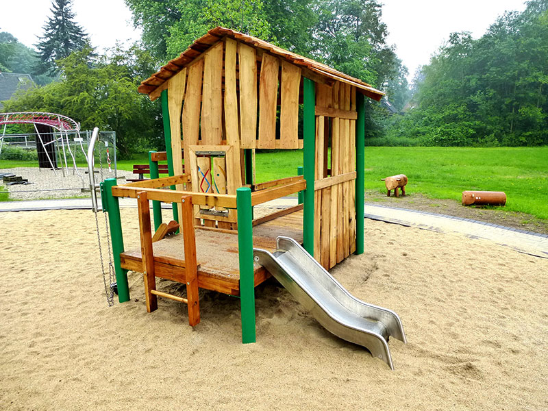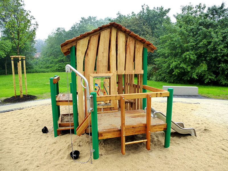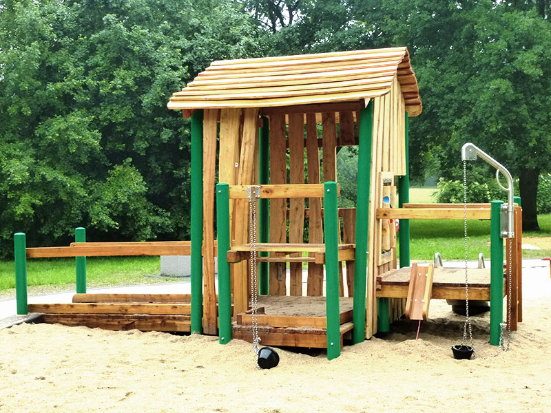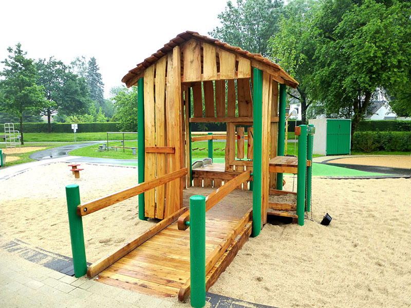 Bei einem ähnlichen Objekt in Krefeld, Am Flohbusch, kann ebenfalls gemeinsam im Sand gespielt werden. Zusätzlich gibt es die Möglichkeit, Dinge feinmotorisch zu erspüren oder auch die kleine Rutsche zu testen. Rollenspielmöglichkeiten bieten die für Kleine und Große gut zugänglichen Spielhäuser, die von allen Seiten bespielbar sind. Zum Testen der Fingerfertigkeit lassen sich Schiebespielwände einfach in vorhandene Spielplätze integrieren. So machen diese Spielpunkte es allen Kindern leicht, mittendrin zu sein und auf "Augenhöhe" miteinander zu spielen.