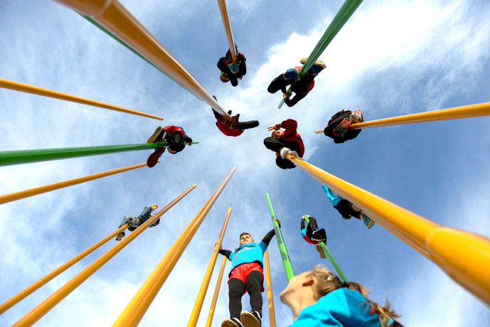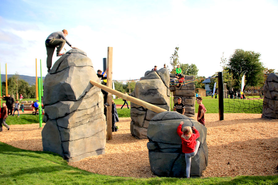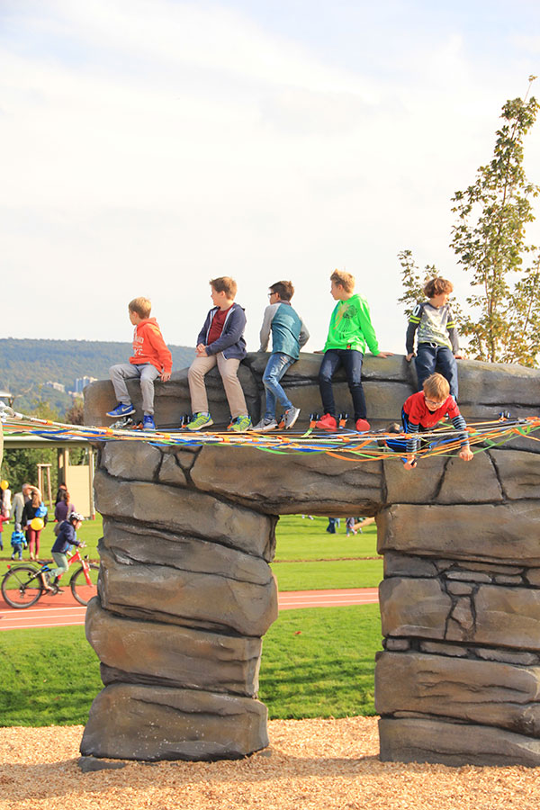 Ein Highlight ist der große Kletterfelsen mit Rutsche, der durch ein drei Meter hohes "Traumfängernetz aus Slacklingegurten" verbunden ist, auf
