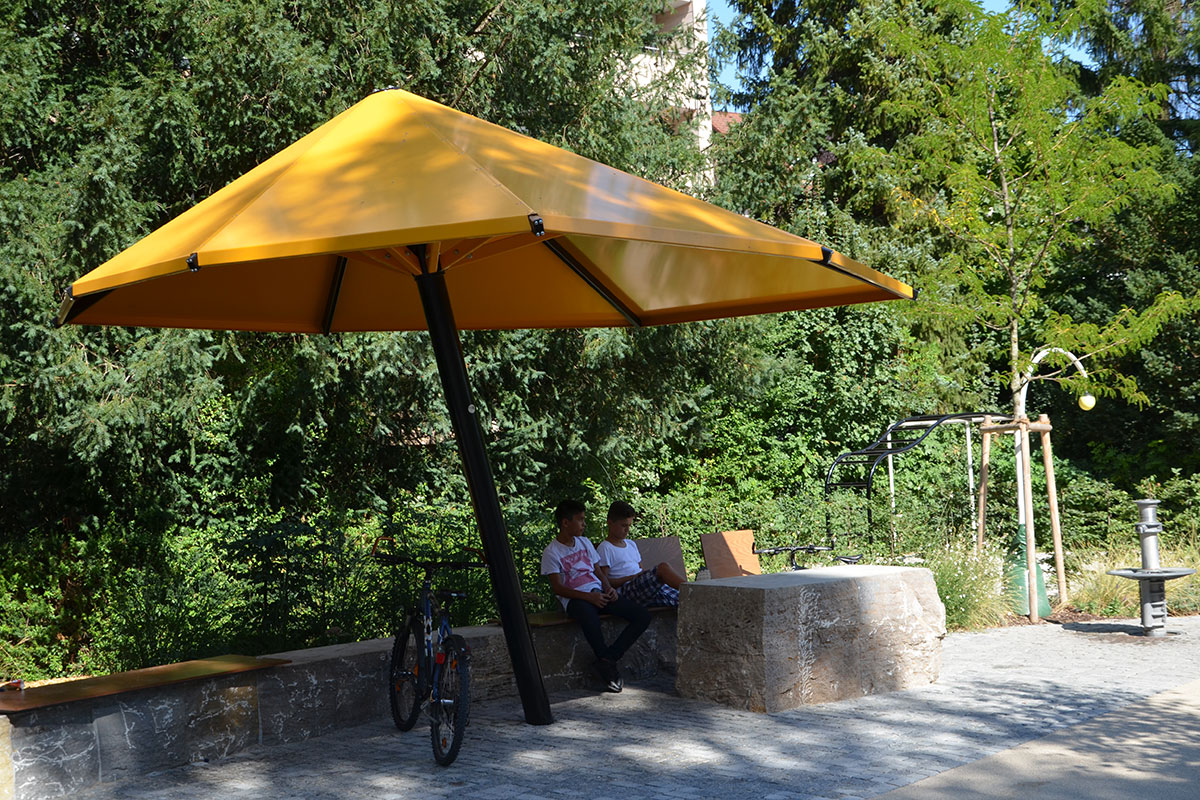 wiederkehrend sind bequeme und schattige Sitzmöglichkeiten für alle die eine Ruhepause möchten. Wer will kann sich auch an den fest verbauten