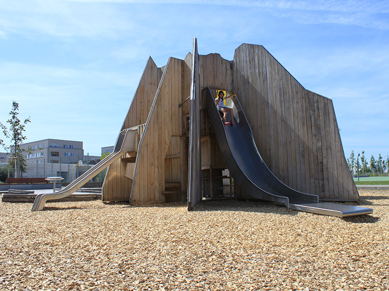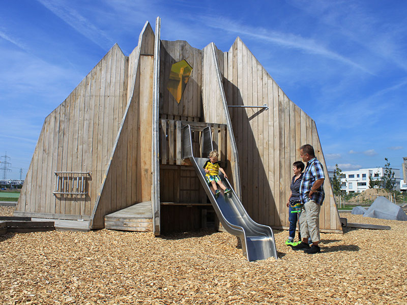 Abenteuer pur, danach sieht die Szenerie der neuen Spielanlage im Kätcheslachpark aus. Eine geheimnisvolle Vulkaninsel und davor ein gestrandetes Schiffswrack – was mögen sich dahinter für Abenteuer verbergen? Bei näherem Hinsehen entpuppen sich beide natürlich als spannendes Spieleparadies. Das Schiffswrack kann über Kletternetze, Balken, Seile und viele andere Wege geentert werden. Auf dem Schiffsdeck warten dann spannende Balancier- und Kletterwege, bevor man das Wrack schnell wieder über die Röhrenrutsche verlassen kann.