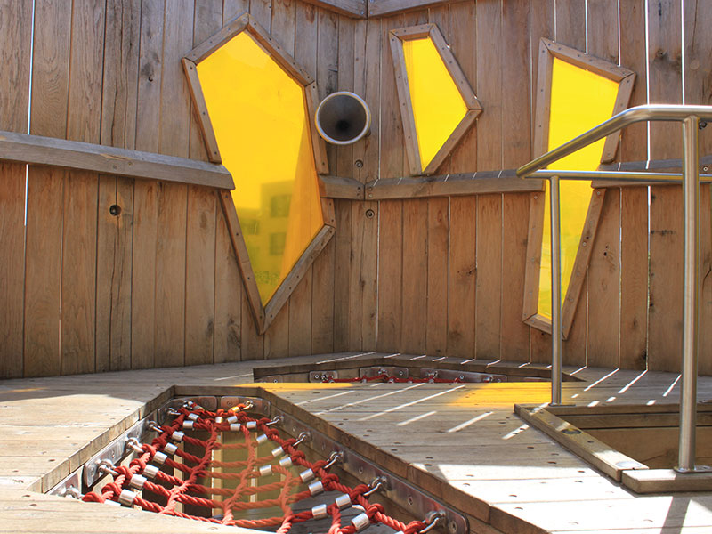 Ist das Schiff erkundet, kann man die geheimnisvolle Vulkaninsel erforschen: Sie ist über mehrere Zugänge, Rampen und auch einen barrierefreien Weg zu erreichen. In und an der Insel gibt es diverse Bereiche mit spannenden Spielmöglichkeiten: Per Signalspiegel und Trichtertelefon kann man Verbindung zum Wrack aufnehmen, es gibt ein Klangspiel, einen Balancierkompass und natürlich die verschiedensten Kletter-, Kriech- und Versteckmöglichkeiten. Bevor man den Vulkanfelsen jedoch über die kleine oder große Rutsche verlässt, sollte man bis zum Highlight vordringen: Im Inneren befindet sich die Schatzkammer, ein mit gelben und roten Fenstern versehener Raum, der mittels reflektierender Metallkugeln eine ganz besondere und geheimnisvolle Stimmung verbreitet. Wer als erstes zur Kammer vordringt findet vielleicht noch einen Schatz, oder ist er doch im Wrack? Das können die Kinder auf einer spannende Entdeckungstour herausfinden.