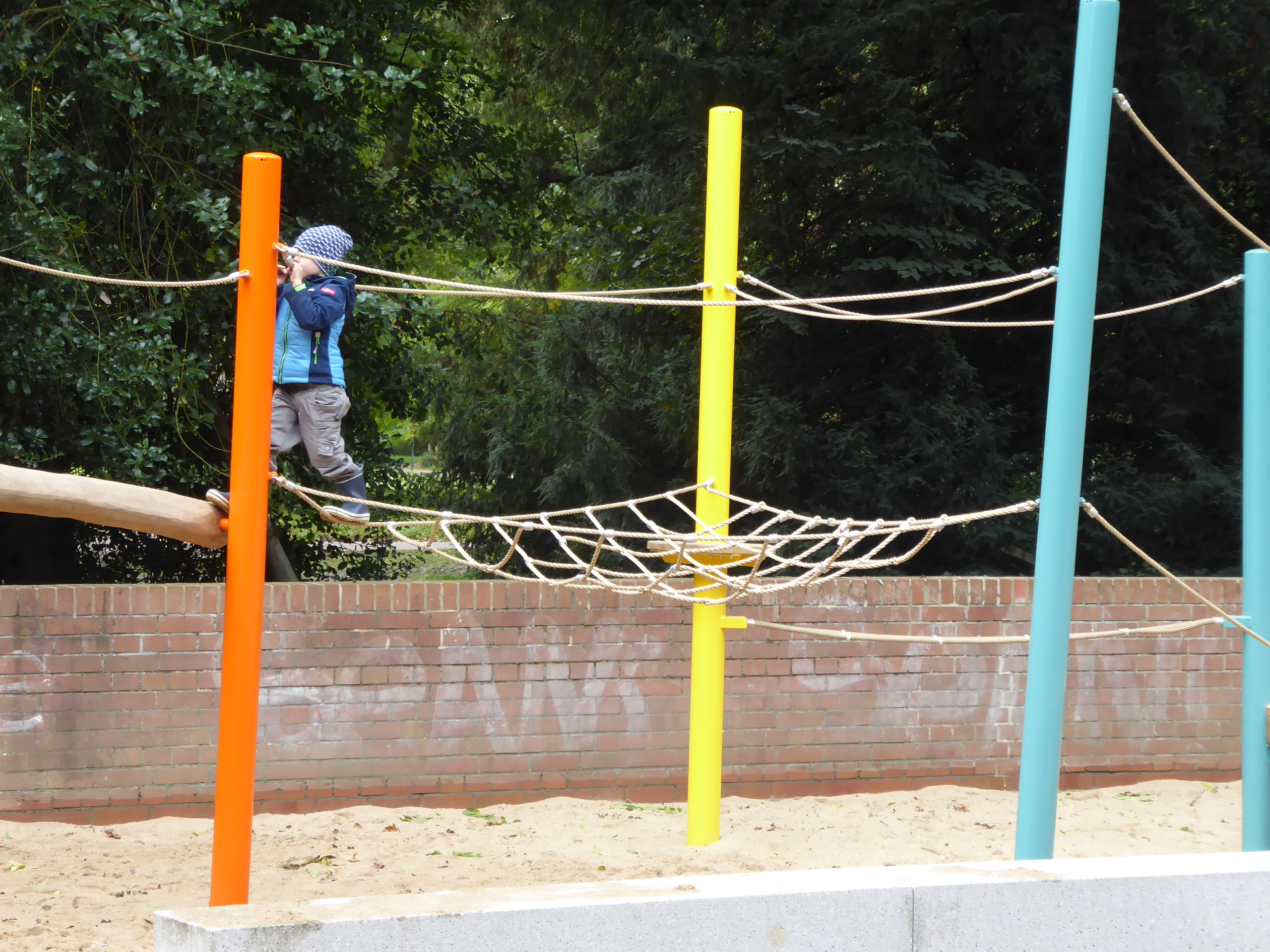 Die besondere Kletter- und Balancieranlage mit ihren farbigen Stahlpfosten fällt den kleinen und großen Besuchern des neuen Spielplatzes in der Düsseldorfer Emmastraße sofort ins Auge.