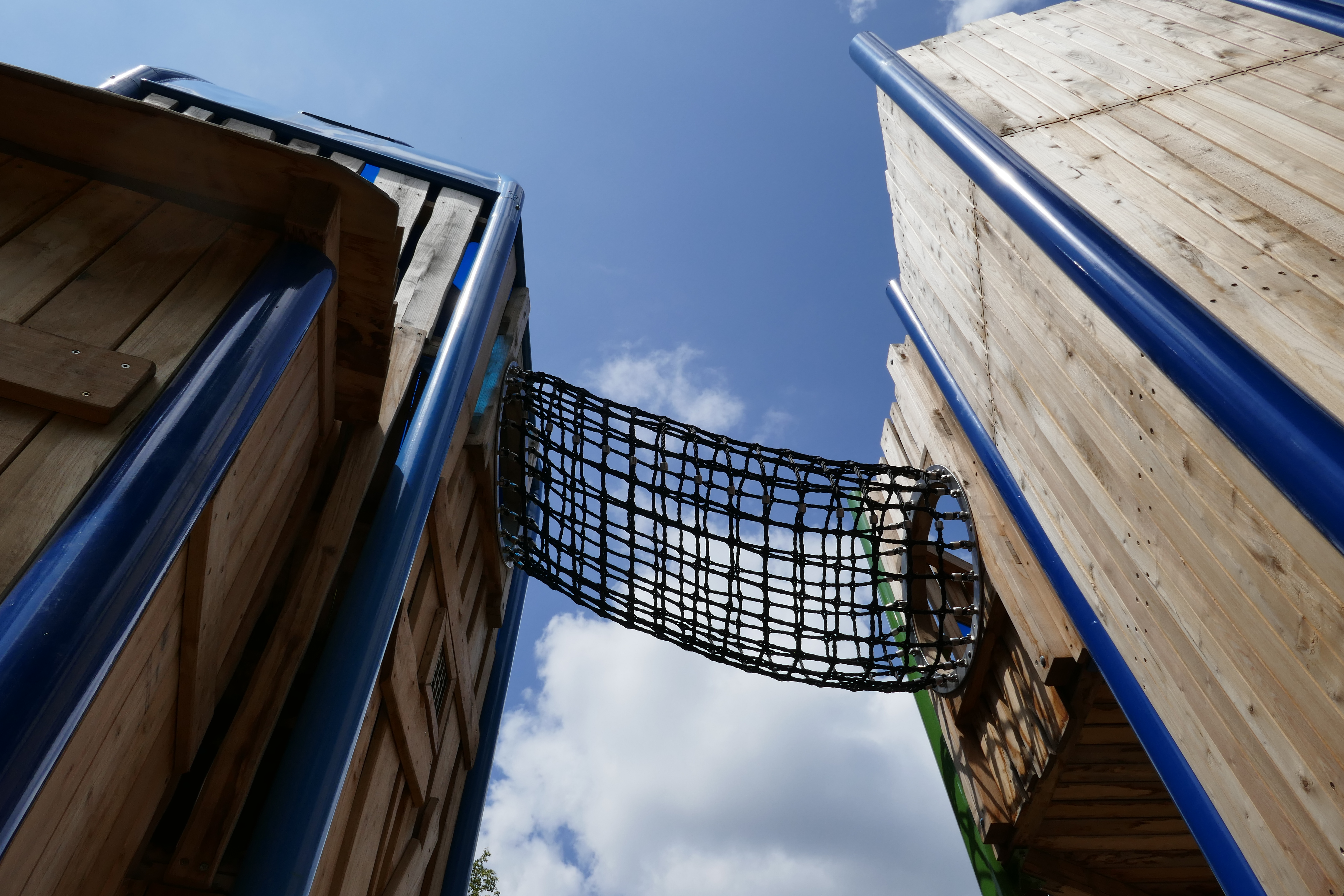 Über die Balancieranlage mit Trittschlaufen, Balancierbalken und Lauftellerpfosten geht's hoch hinauf auf den ersten Turm, der über einen Netztunnel mit dem großen Turm verbunden ist. Viele kleine Dekoelemente und farbige Fenster lassen den Turm besonders spannend erscheinen.