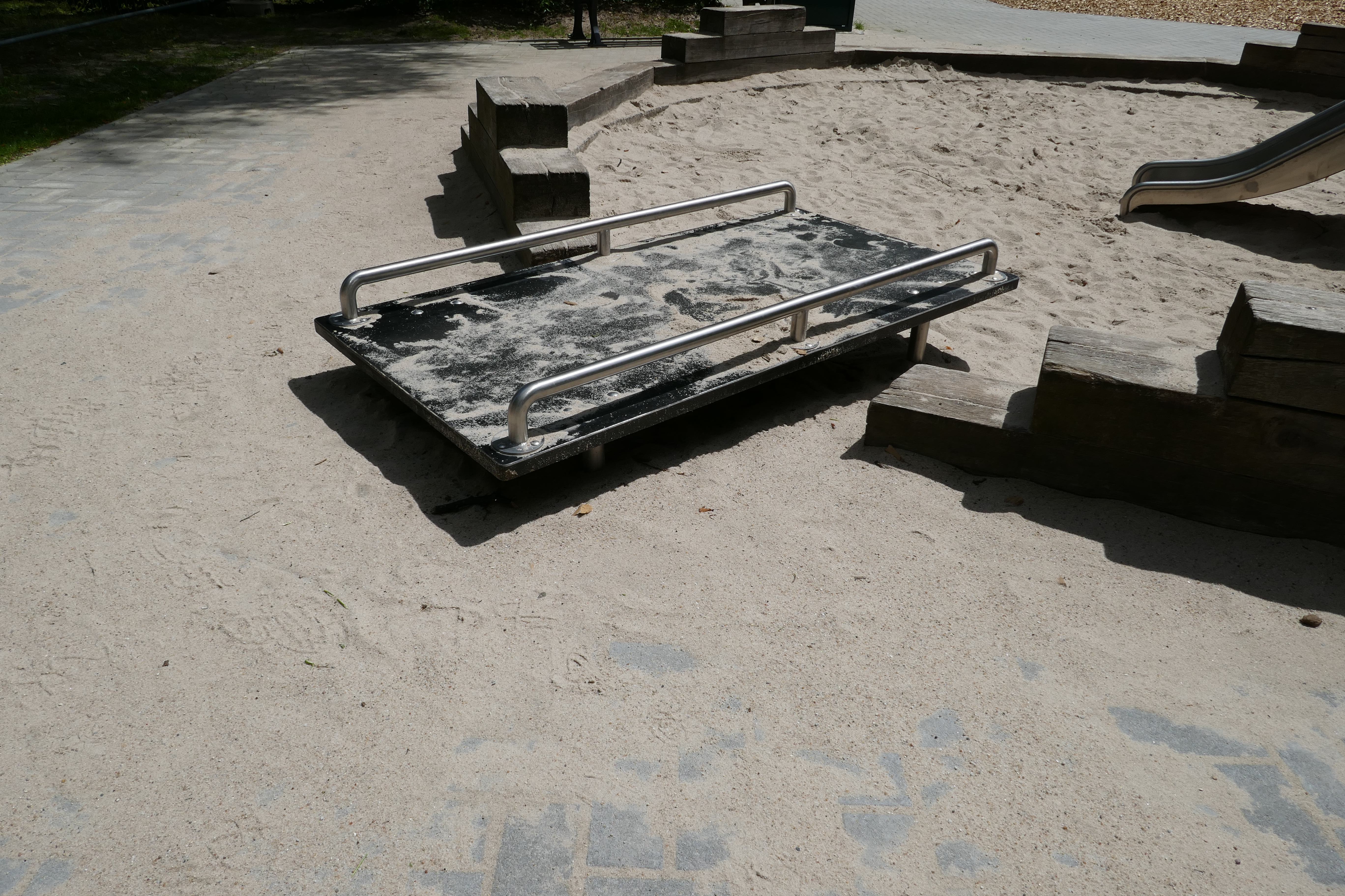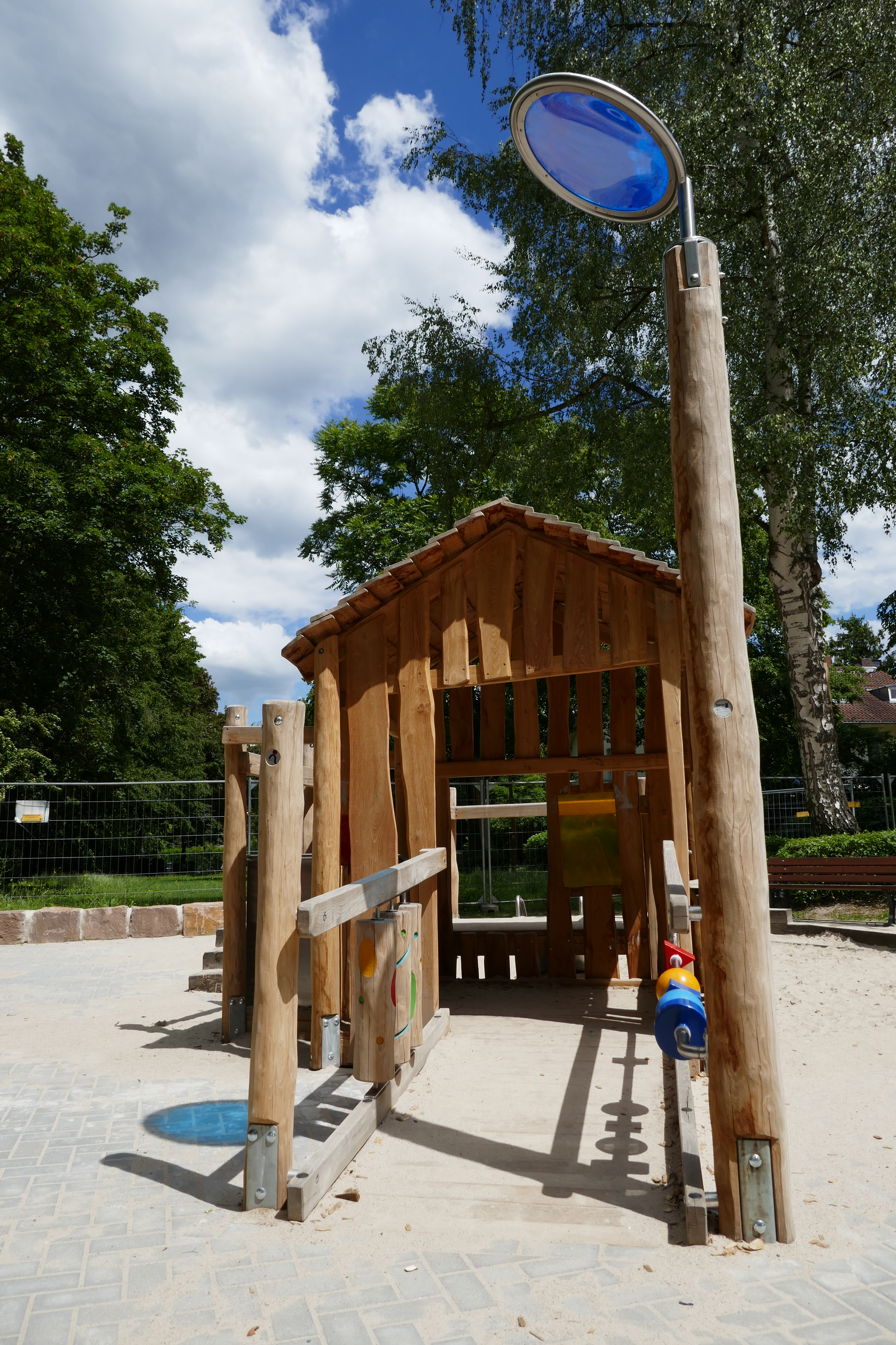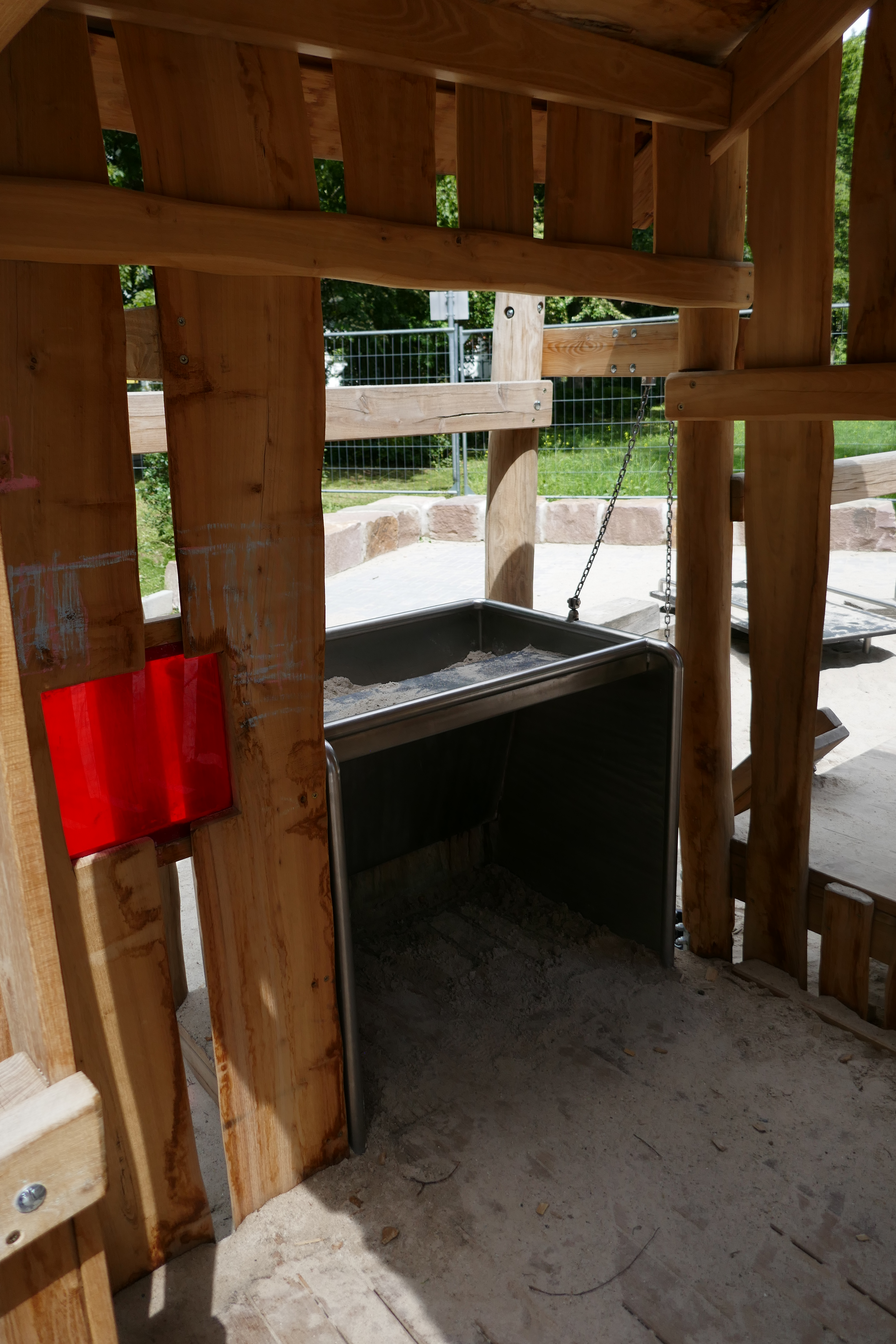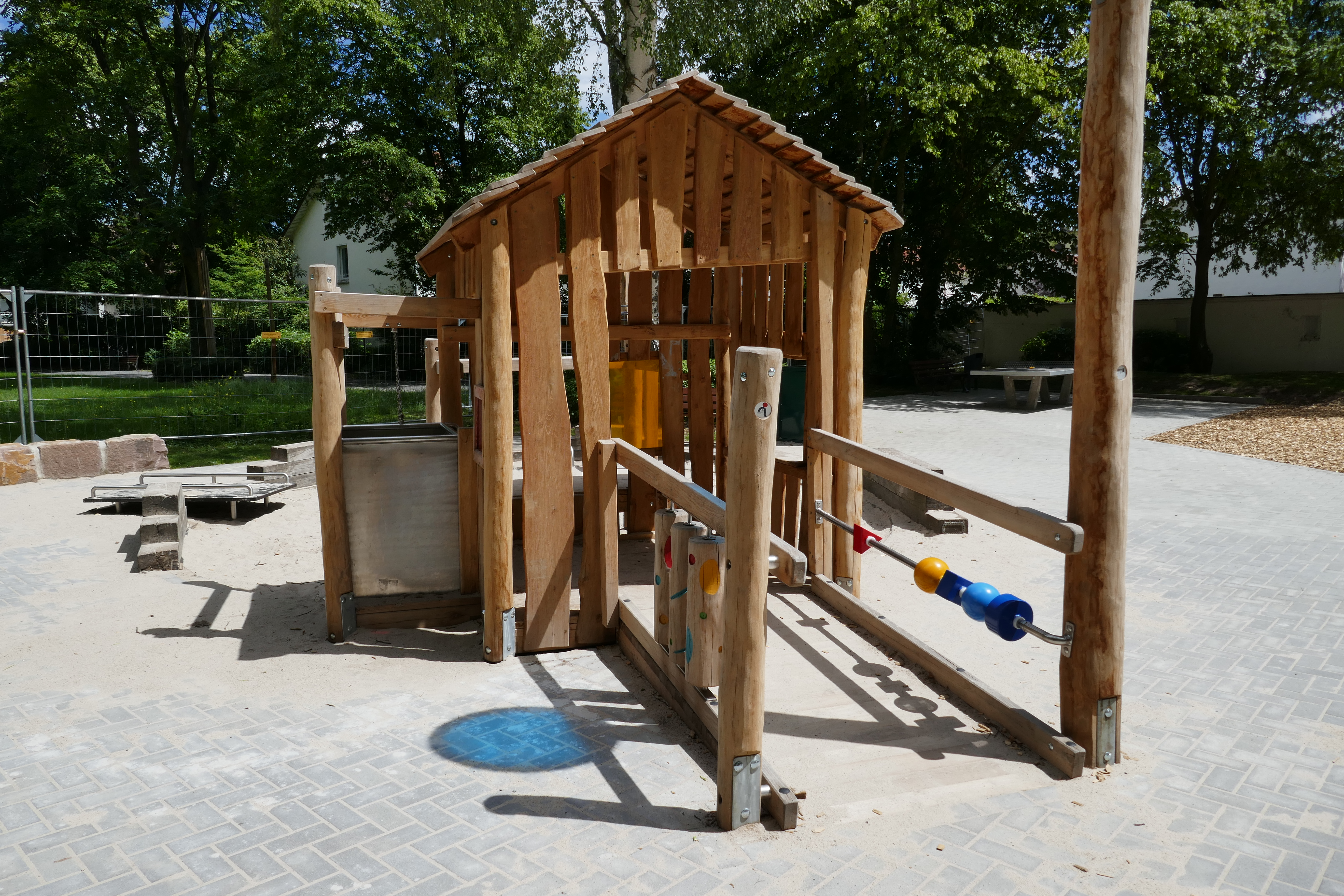 Der Tante-Emma-Laden mit seinen verschiedenen Möglichkeiten gibt auch Menschen mit Beeinträchtigungen die Möglichkeit des Mitspielens. Eben diese kommen auch bei der kleinen Spielanlage auf ihre Kosten, die mit vielen Kleinigkeiten, wie z.B. einer Schiebespielwand und einem unterfahrbaren Sandspieltisch ausgestattet ist. Auch hier sorgt das Topelement für farbige Akzente beim Spielen.