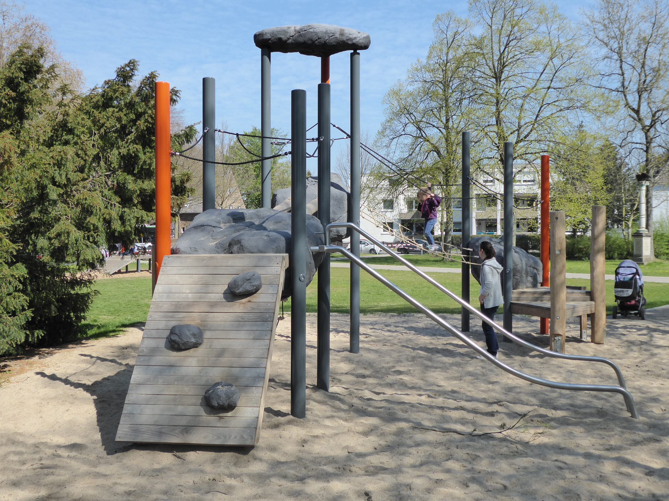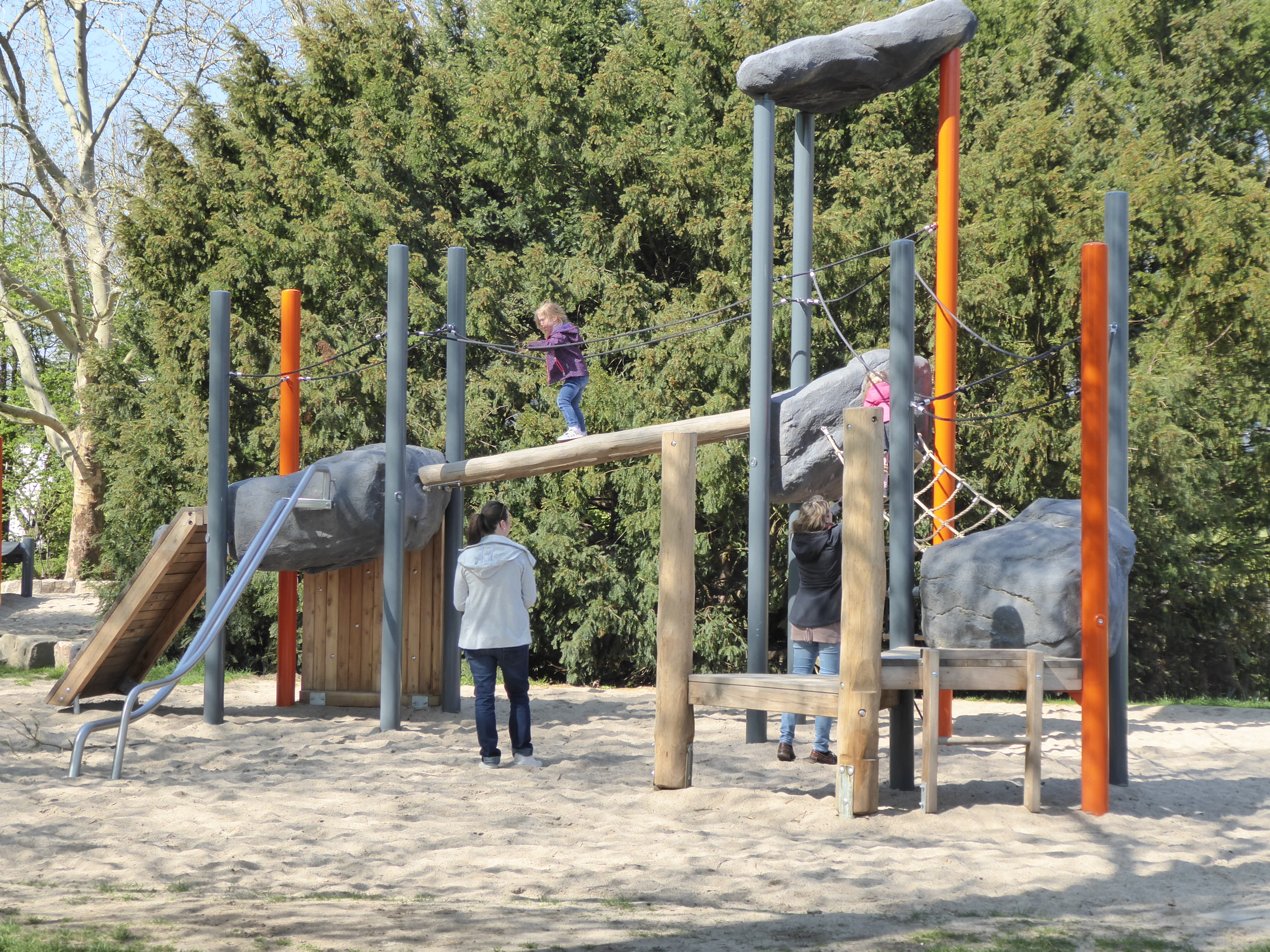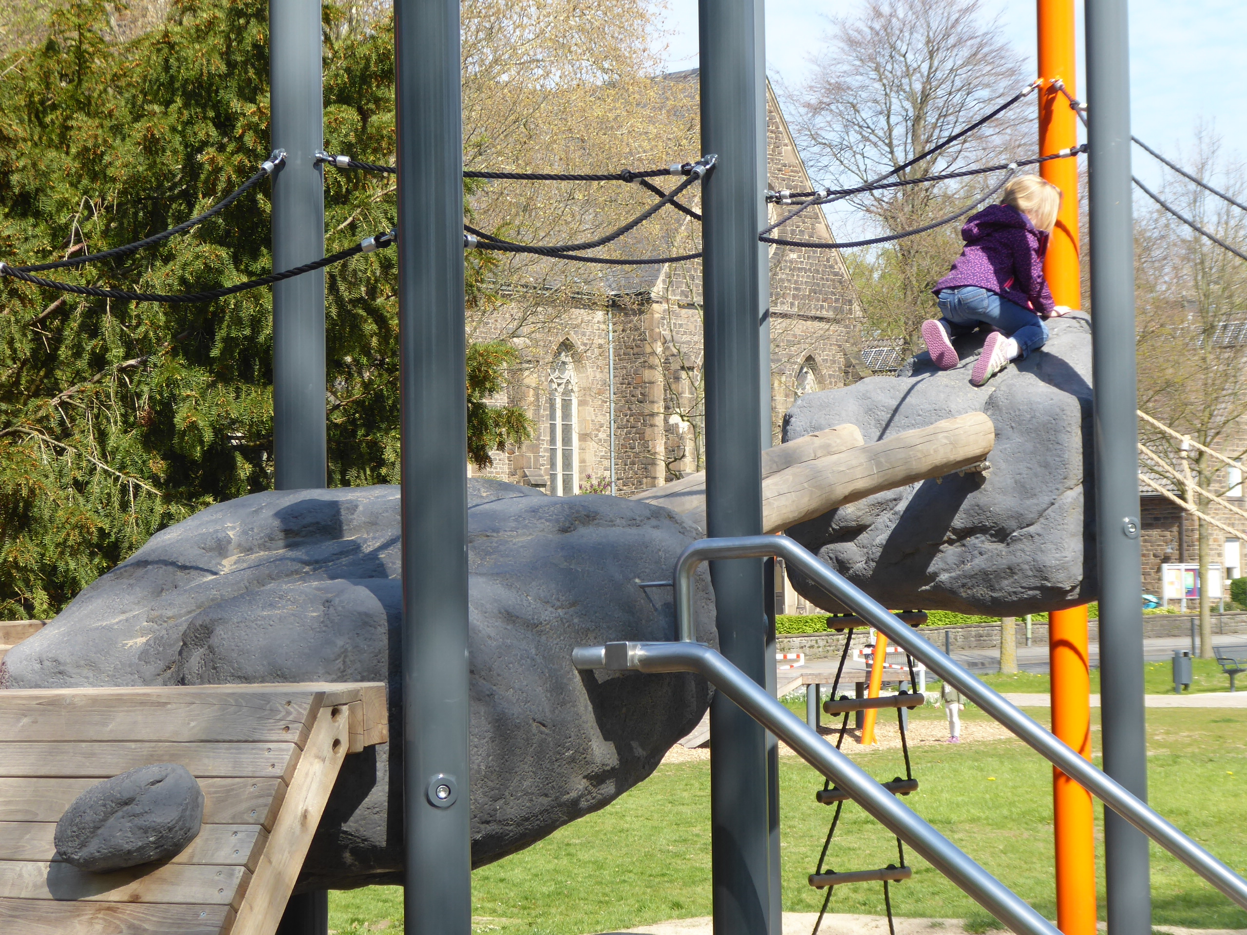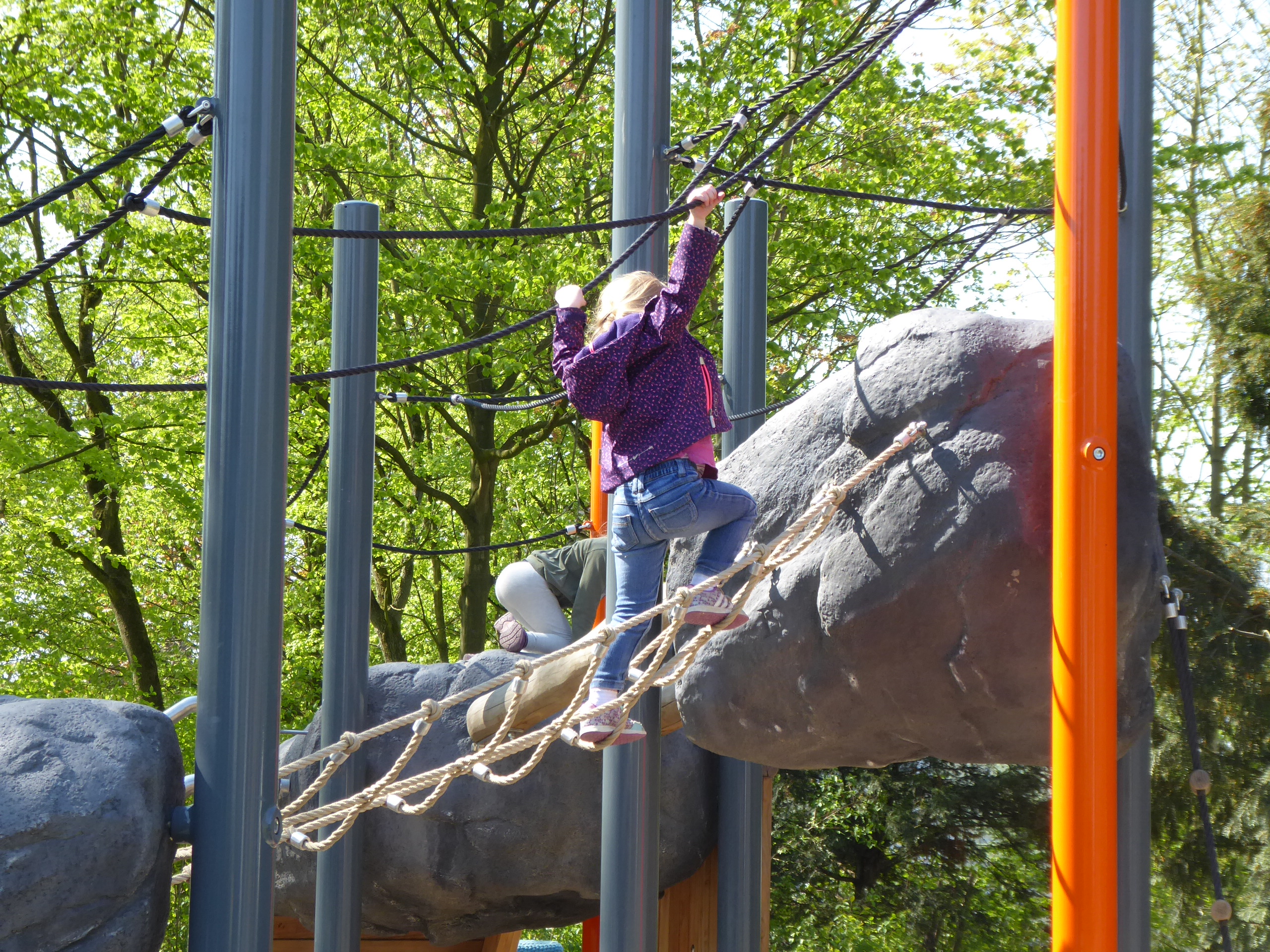 Die mit unterschiedlichen Aufstiegen, Netzen und einer Rutschstange ausgestattete Moduludus-Spielanlage wird durch die schwebenden Steine zu einem absoluten Highlight. Die Anlage ist nicht nur visuell, sondern durch seine besondere Oberfläche der Felsen auch taktil eine besondere Erfahrung für die kleinen Kletterer.