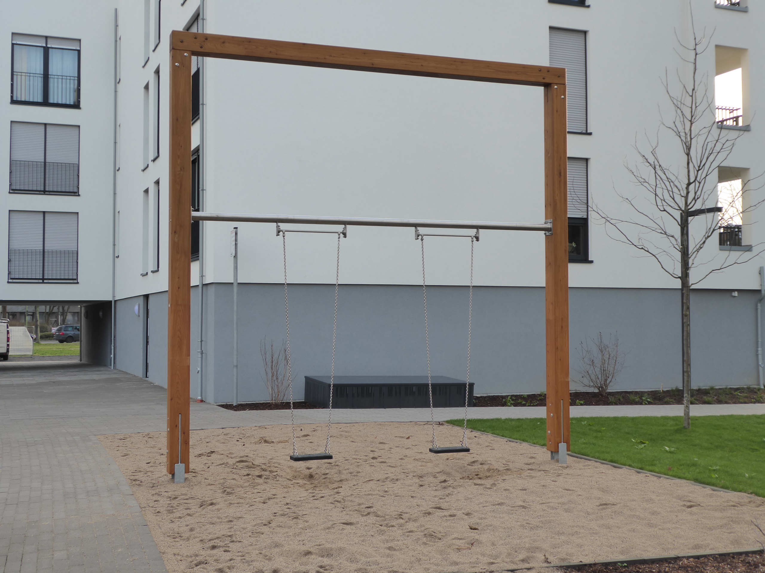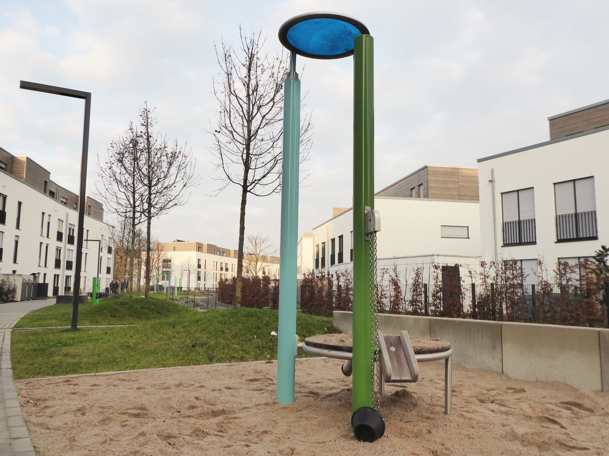 Alle Spielgeräte wie der Stangenkreisel, die Hängematte und die Sandspielanlage mit farbigem Lichtlolli entlang des Bachlaufs wurden auf einer Tiergarage montiert.