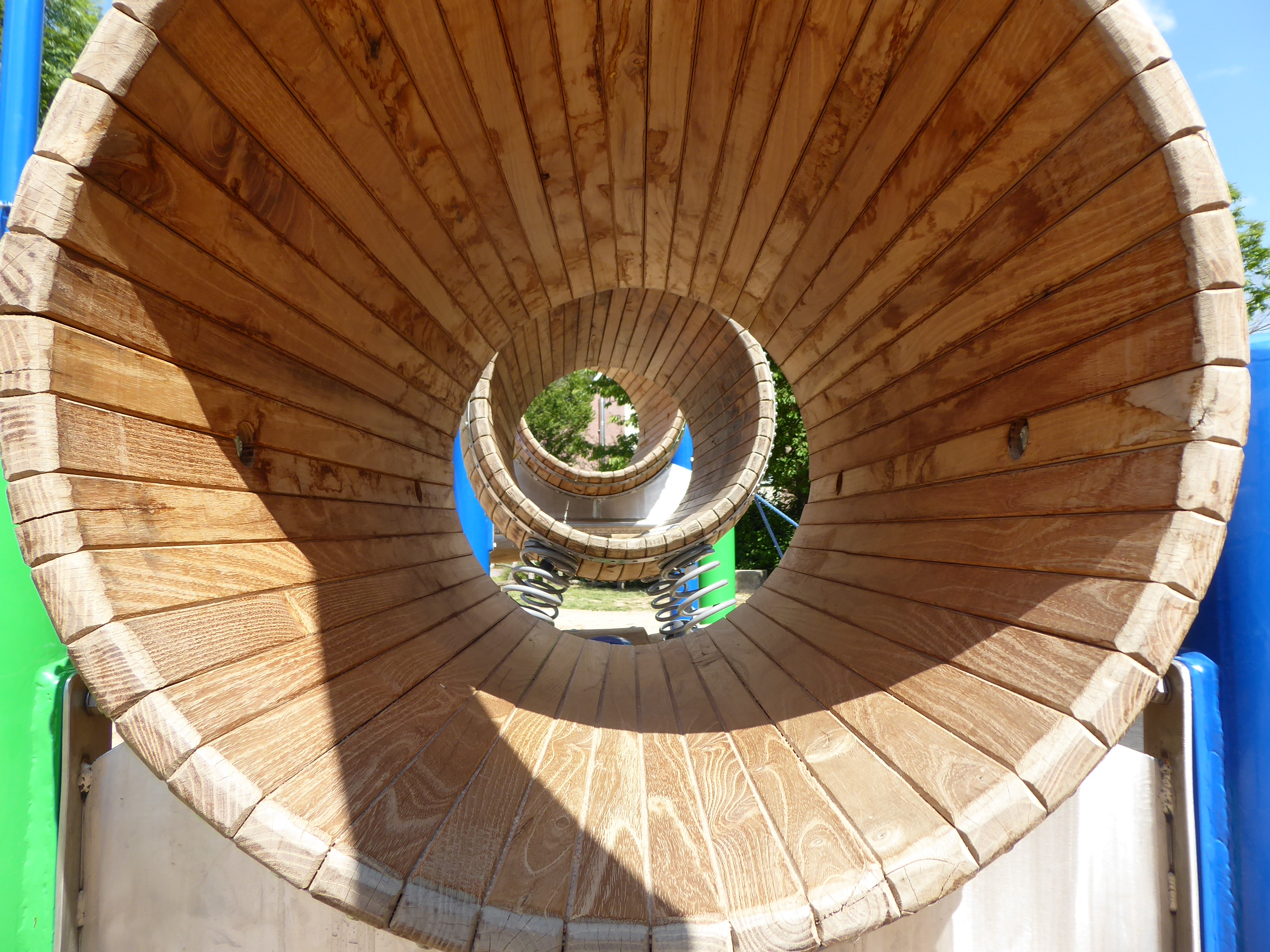 Neben der Vogelnestschaukel gelangen die Kinder über die schwebenden Kletterfelsen mit Hangelseil auf das erste Podest, von dem aus sie über eine Slalomstrecke, Balancierrohren und Bändern zur Fässerbrücke gelangen. Das mittlere Fass wurde auf Federn montiert, damit das klettern durch diese Besonderheit noch spannender gestaltet wird.