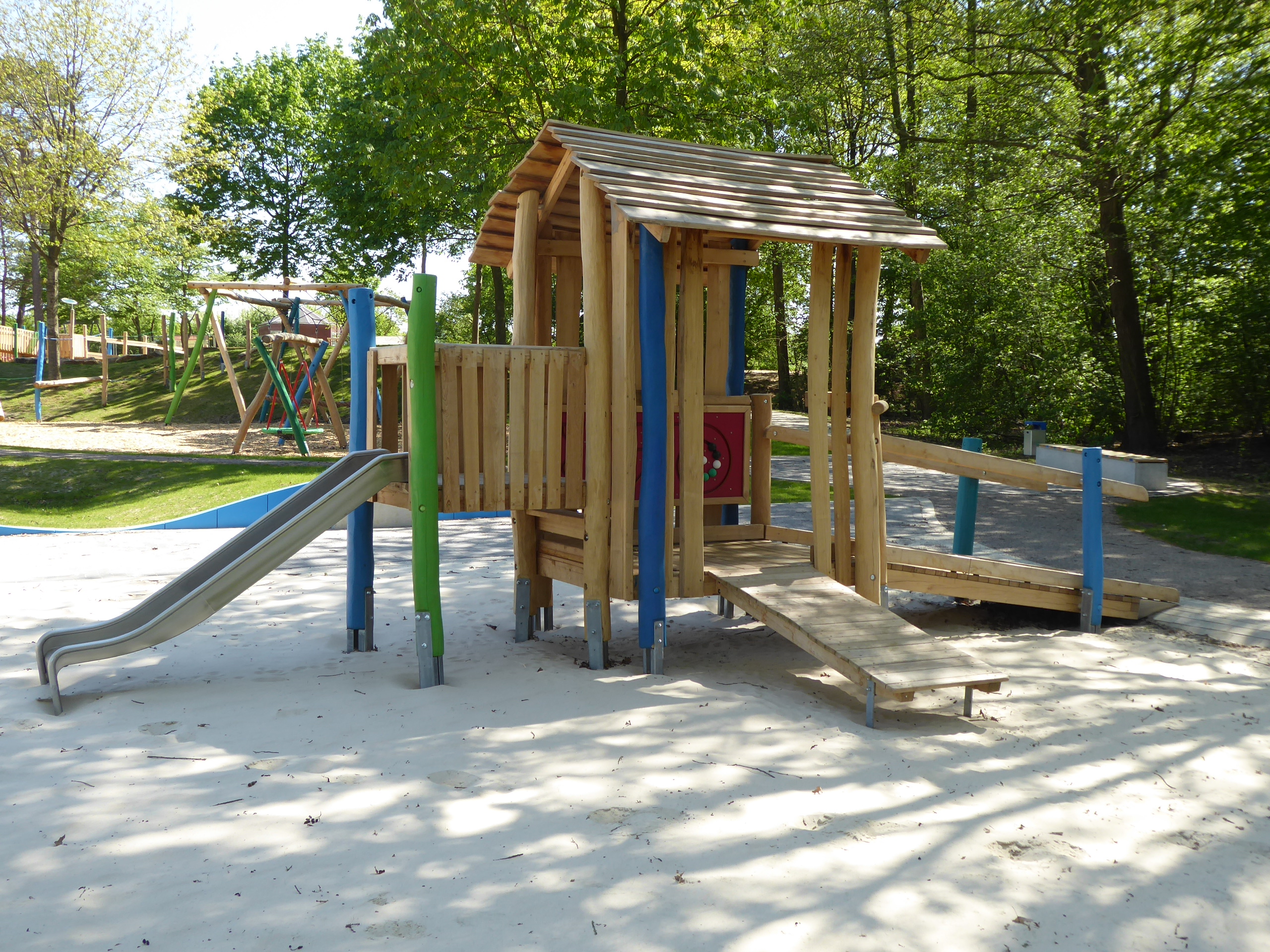 Die Anlage ist beispielsweise mit einer Rollstuhltreppe versehen, die auch Menschen mit Beeinträchtigung das Mitspielen möglich macht. Auf dem Boden sind Edelstahlhindernisse und Gitterböden eingebracht worden, die einen zusätzlichen Anreiz bieten und ein abwechslungsreiches Spiel möglich machen.