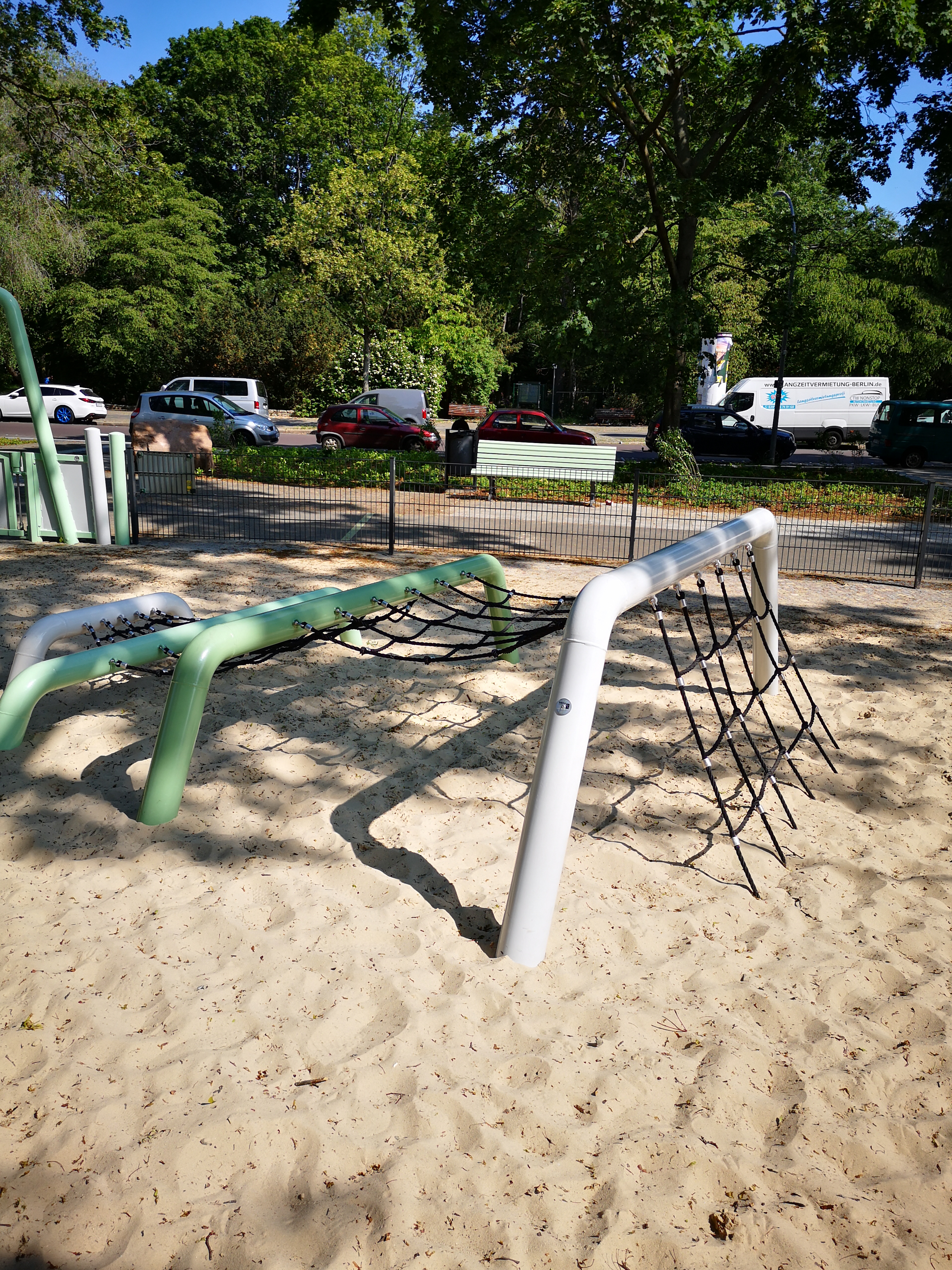Die großen Netzbögen in kräftigen Grüntönen vermitteln sofort das Gefühl "da will ich hoch klettern". Die Kinder können dabei an einer Seite hochklettern und über ein Kletternetz, das zwischen die Bögen gespannt worden ist, zum nächsten Bogen rüber klettern.