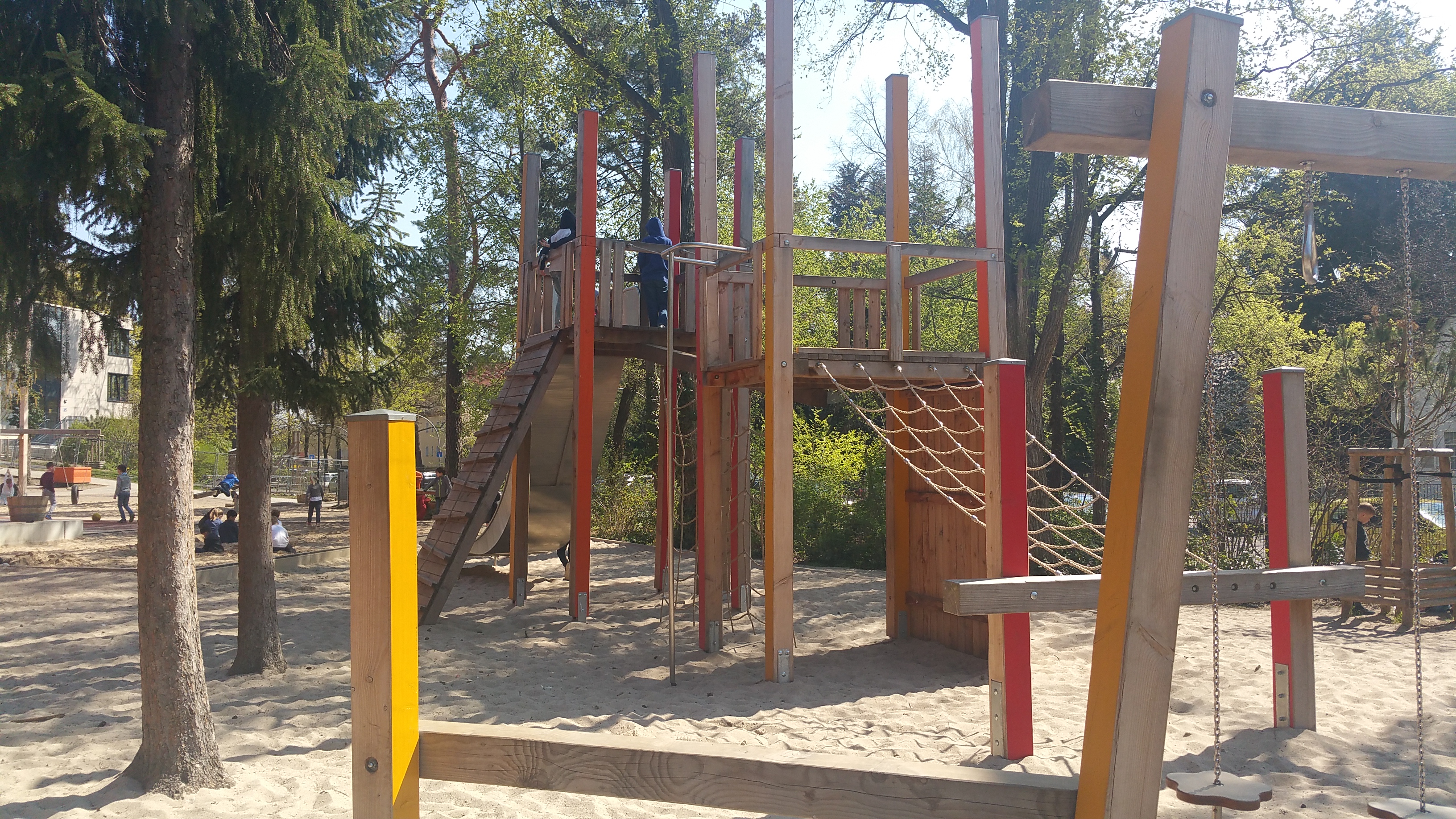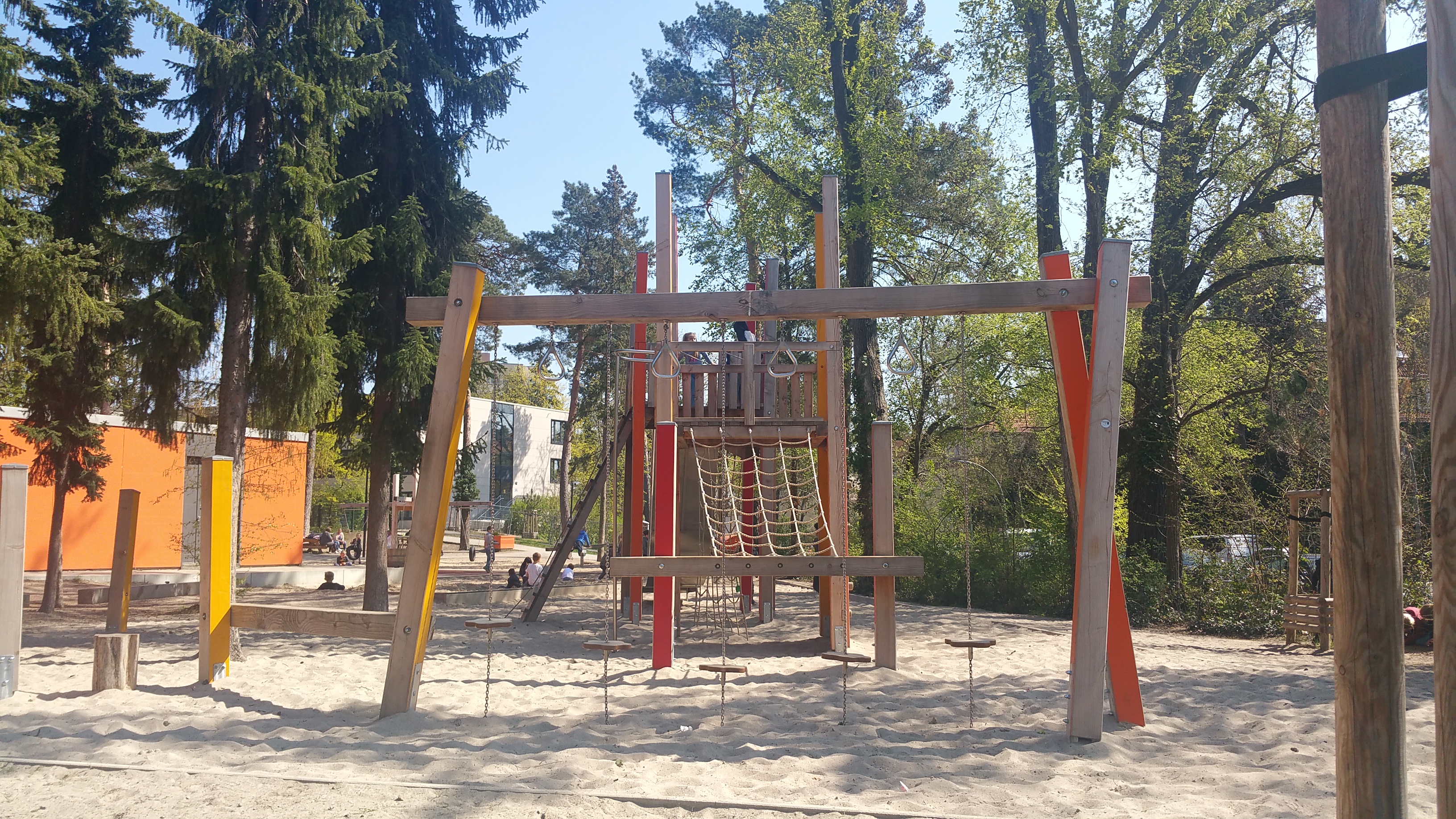 Der Spielparcours aus lasierten Douglasien-Kanthölzern, Kletterwänden, Netzen und zahlreichen Balanciermöglichkeiten laden die Schüler und bestimmt auch die eine oder andere Lehrkraft zum klettern, balancieren und spielen ein. Die spektakuläre Freifallrutsche sorgt dabei für zusätzlichen Nervenkitzel.