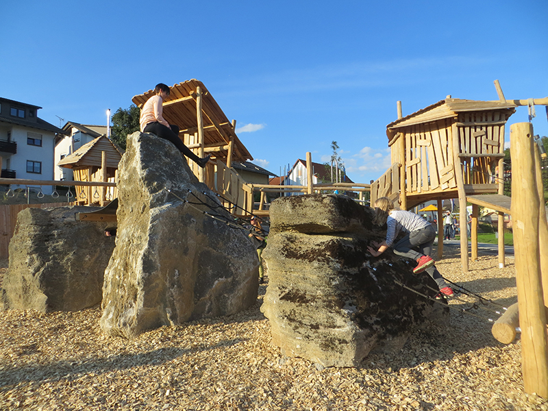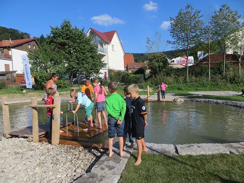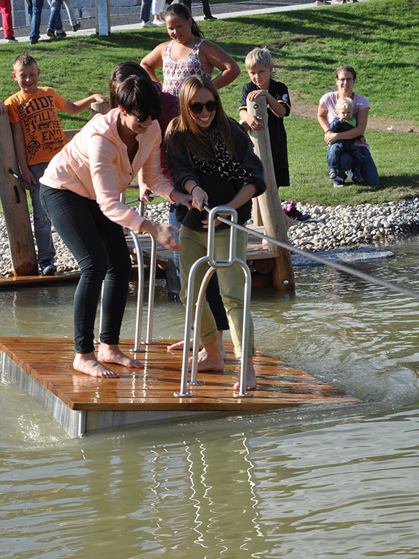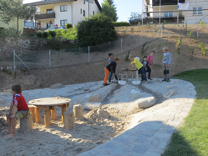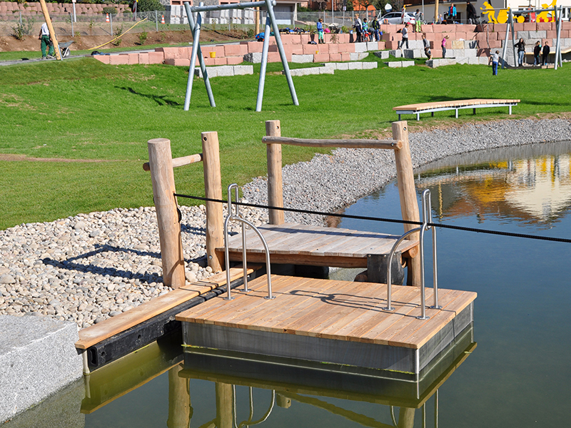The constructions here include: rocks and towers connected with suspension bridges, which require dexterity when being climbed; mechanical games that produce sounds when turned; and a carousel for all generations that is built into the ground and turns when the playmates activate it. The water games are the central feature. Here, water can be redirected, dammed and used in many ways, thus enabling a playful interaction with this natural element.