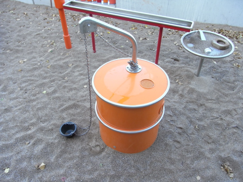 The clever pump with water-flumes and mud-table in the sand play area, is further enhanced with a sand-hoist, fitted on a barrel, with an integrated sand-chute.