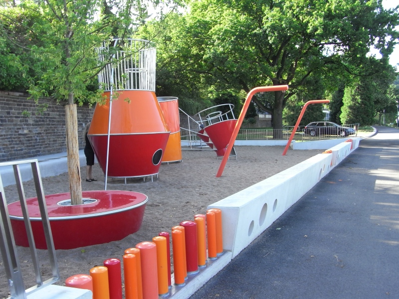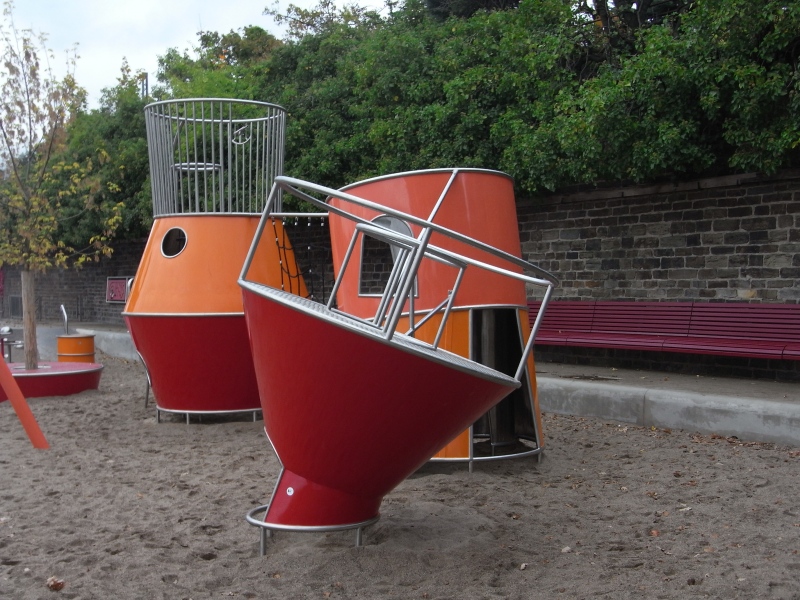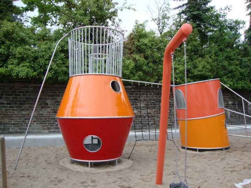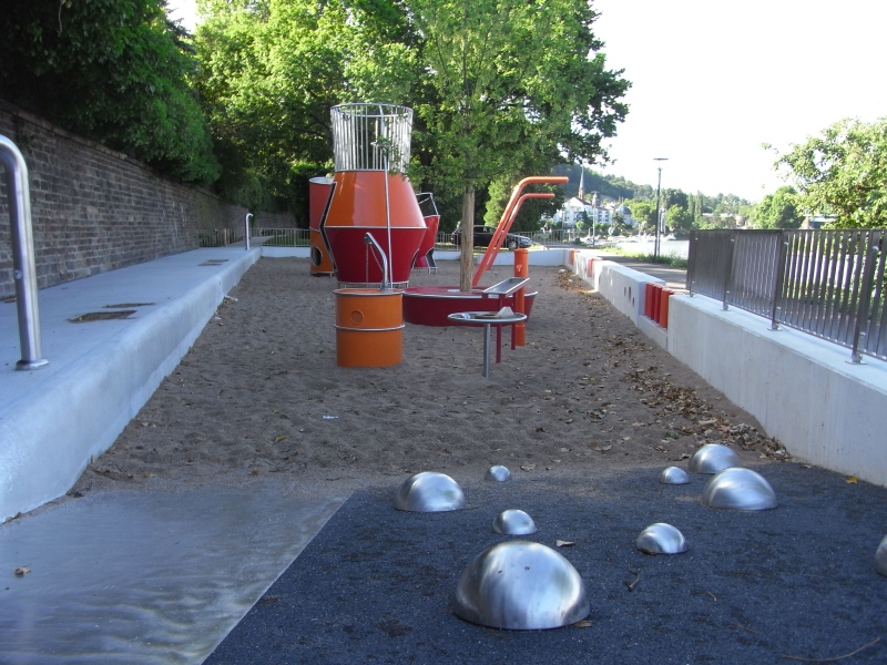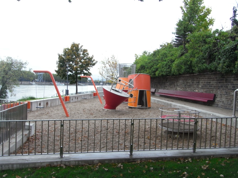 The theme of the playground equipment was "shipping and ship parts". In line with the maritime atmosphere of the Rhine embankment, buoys, lookout platforms and portholes were created.