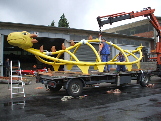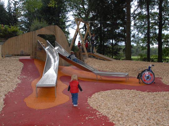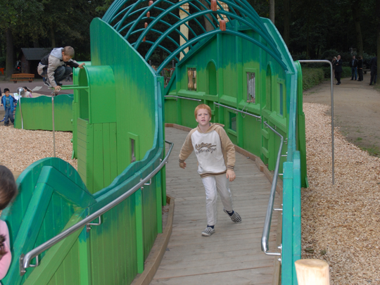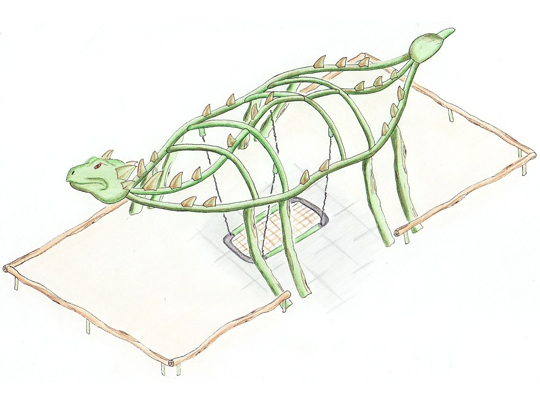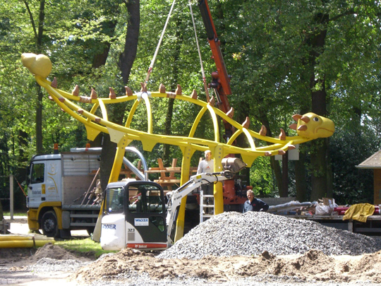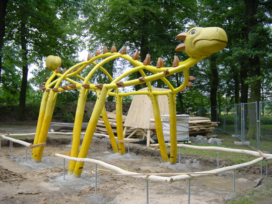 The theme of the playground is: Dinosaurs. This playground boasts a volcano landscape, a DINO netting swing and a play Brontosaurus - manufactured by Kinderland Emsland Spielgeräte.