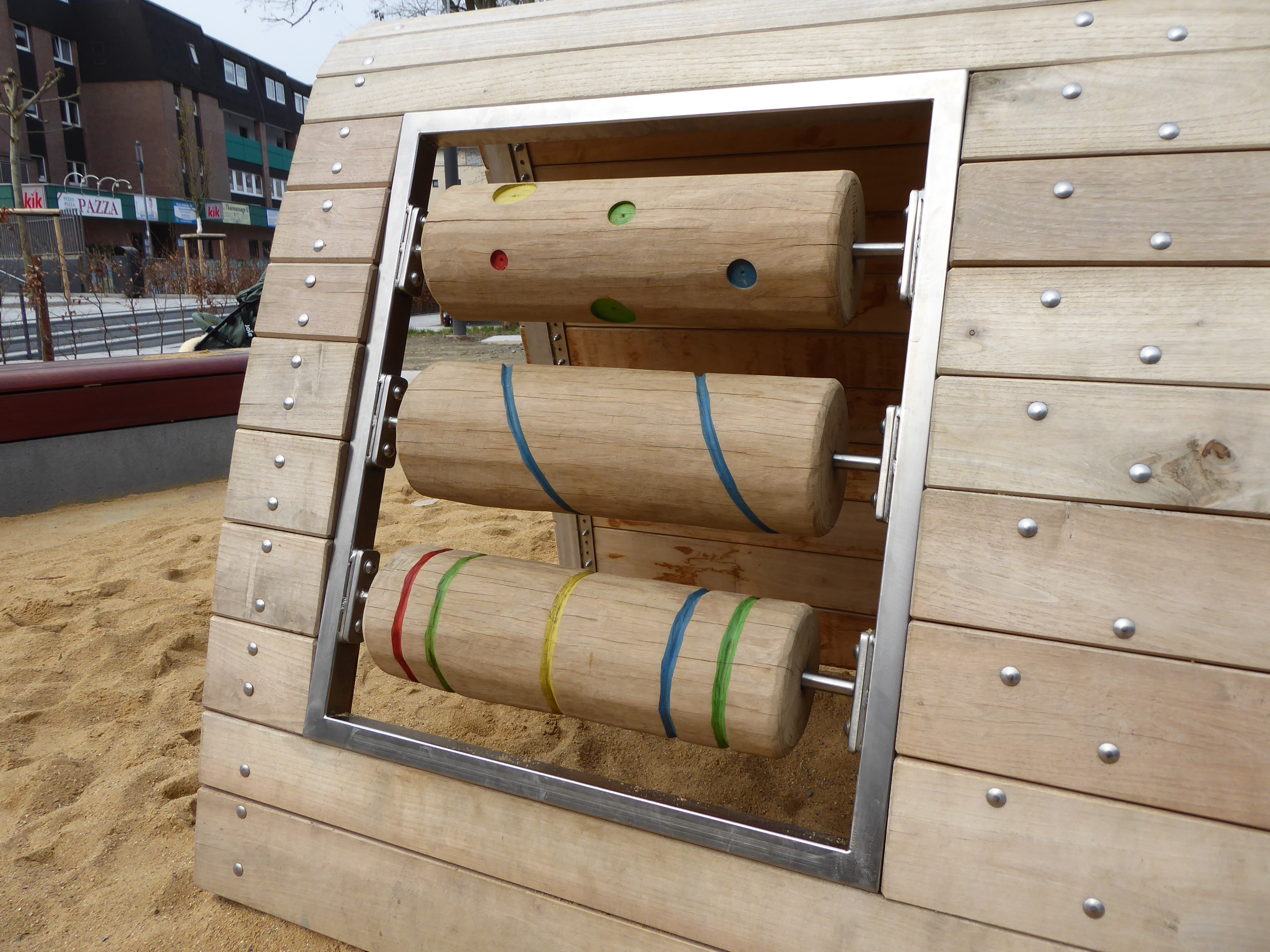 Weiter geht es in den dritten Tunnel. Das Augenmerk liegt hier auf Drehen und Schieben und somit auf der Motorik. Die unterschiedlich eingesetzten Materialien erzeugen jeder für sich seine eigene einzigartige Erfahrung. Drehhölzer mit Einkerbungen und aufgemalten Mustern erzeugen beim Drehen fantasievolle Bilder. Eine ganz andere haptische Erfahrung bietet das Schiebespiel mit Stahlkörpern in verschiedenen Formen und Größen sowie zwei drehende Steine.