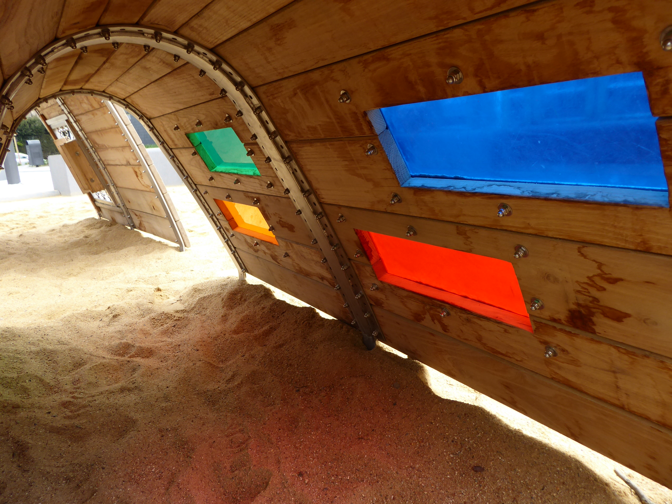 Im ersten Tunnel sind 8 bunte Fenster verbaut. Bei Sonneneinstrahlung werden faszinierende Farben und Formen auf den Sandboden projiziert. Ein Farbenspiel aus Rot, Orange, Grün und Blau ist hier zu beobachten.