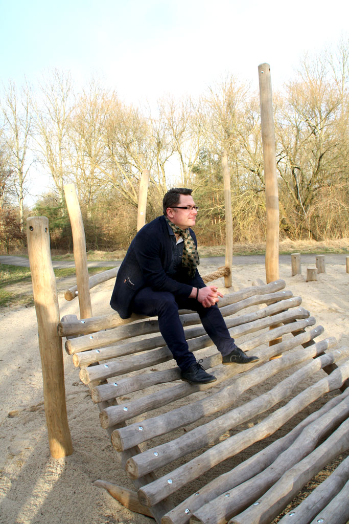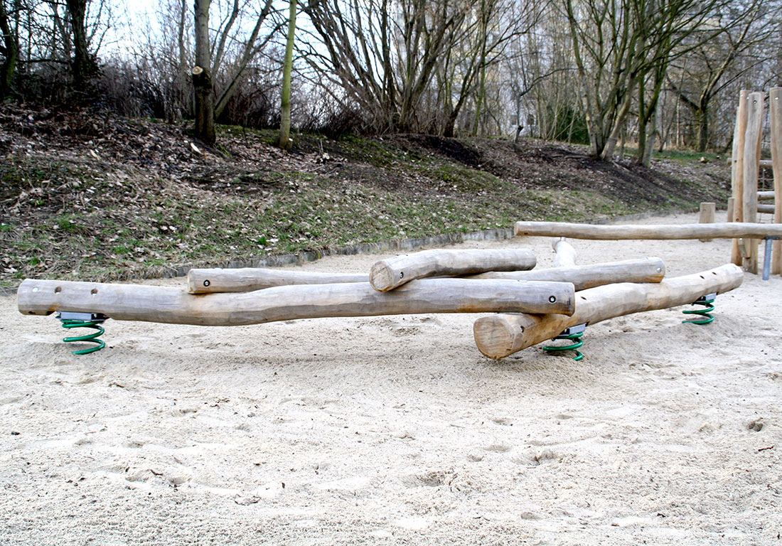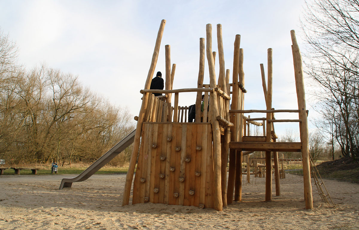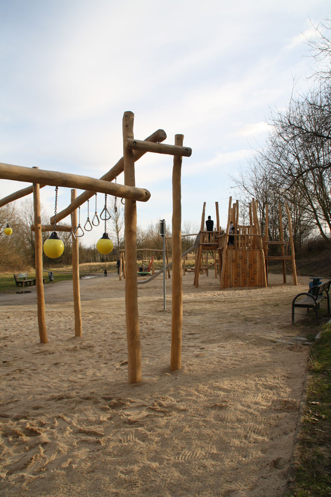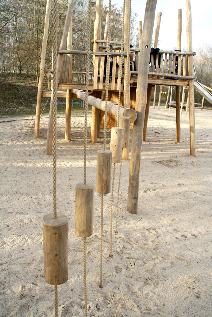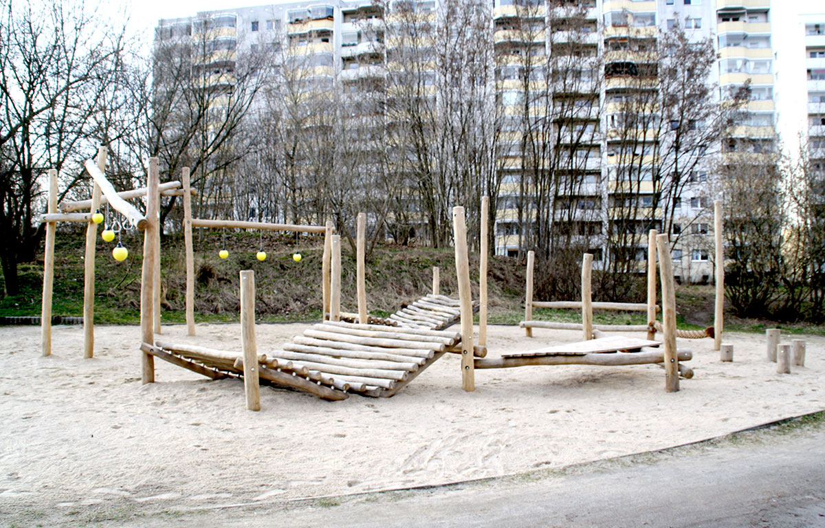 Ein neue großzügige Spielanlage mit vielen Holzgeräten, wurde jetzt in Berlin errichtet. Es gibt mehrere Podeste, die auf verschiedensten Wegen per Leiter, Kletternetz oder über eine Kletterwand erklommen werden können. Nach dem Genießen des Blicks über den Platz wartet als Belohnung eine schnelle Edelstahlrutsche. Ansonsten gibt es reichlich Möglichkeiten sich hangelnd und kletternd fortzubewegen, z.B. an senkrechten Seilen, Balken mit hängenden Griffen, Steigstämmen oder einem Balanciermikado aus 6 Holzbalken.