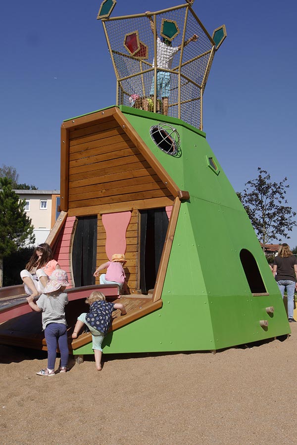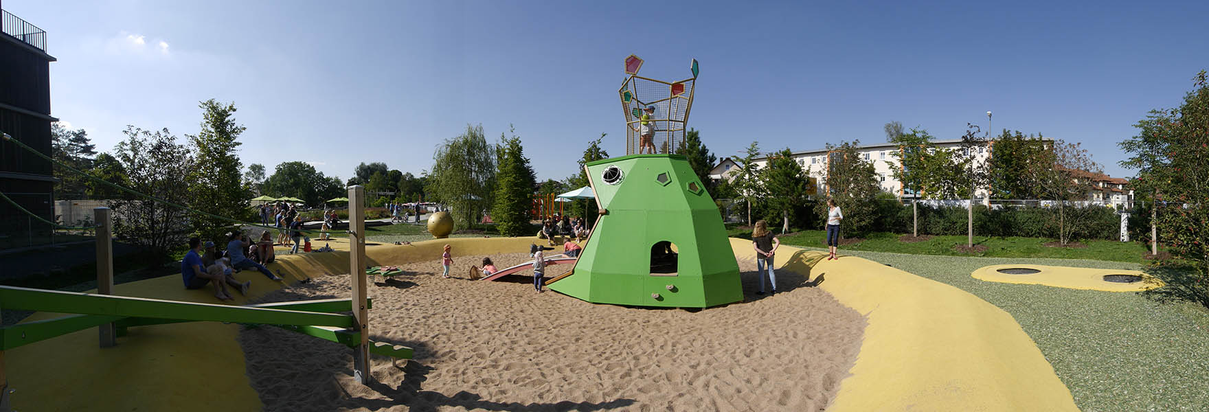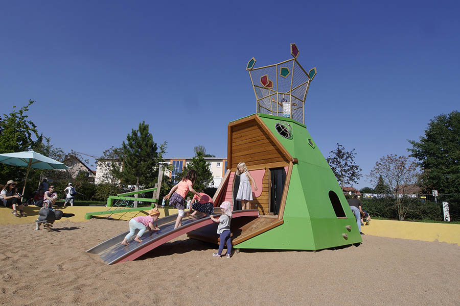 Ein Froschkönig so groß, dass die Spielenden sich klein wie Fliegen vorkommen können, lädt zum Spielen ein. In der Landesgartenschau Pfaffenhofen haben wir diese Märchenspielszene zum Leben erweckt. Der Frosch ist von Innen bekletterbar und die Krone mit ihren gefärbten „Diamanten“ lässt die Spielenden die Umwelt farbig sehen.