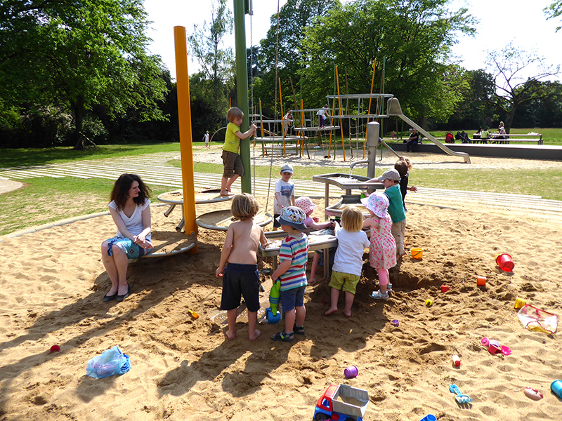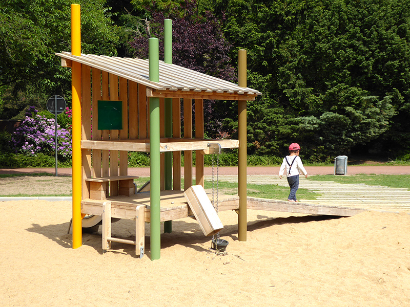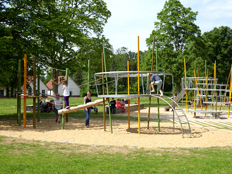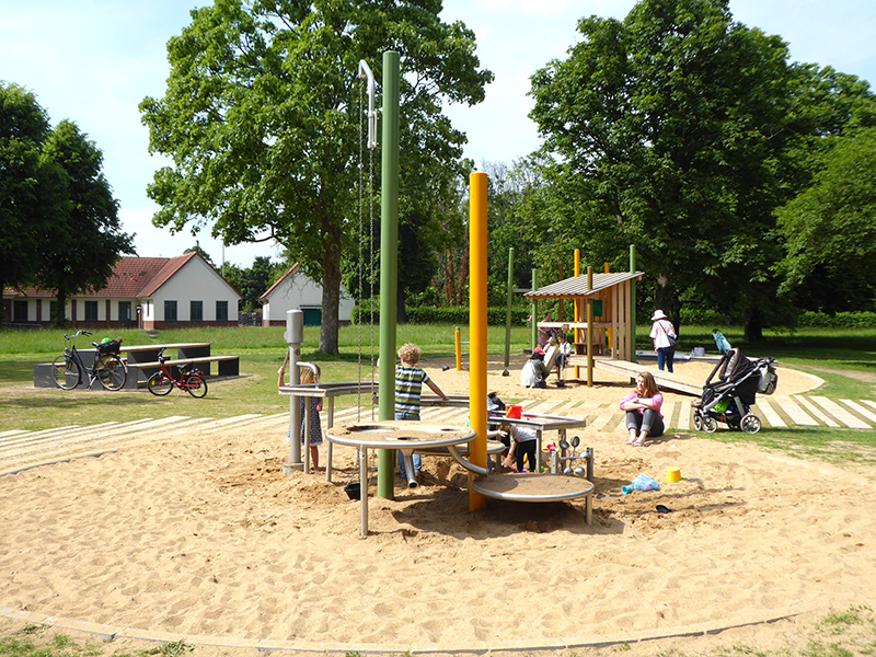 Himmelsschaukeln betonen die luftige Gestaltung, Matschspielanlage und Bauspielhäuschen erfreuen die Kleinen. Das Rollstuhlfahrerkarussell lässt alle teilhaben.