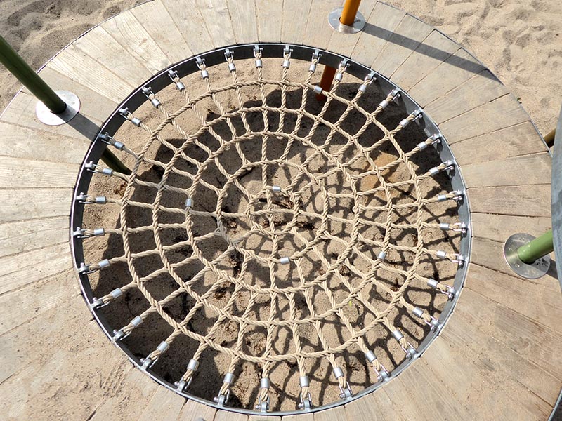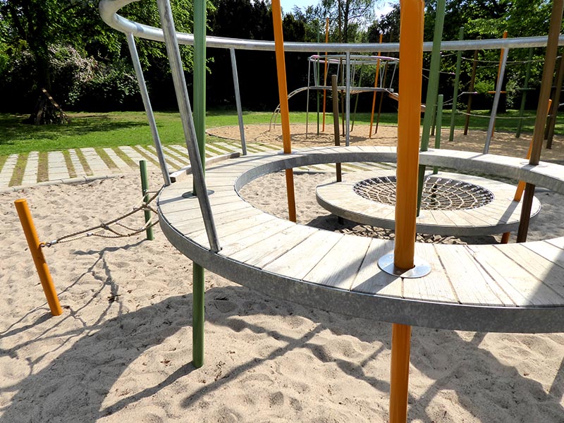 Die Ringespiele erlauben luftiges Klettern in ungewöhnlicher Form. Kreisrund mit schrägen Pfosten integrieren sie sich in die Gräserlandschaft und ermöglichen Klettern und Hangeln in moderner Form. Senkrechte Netze erlauben das Klettern in die Ringe, Netzböden federn oder dienen als Ruhepunkt.