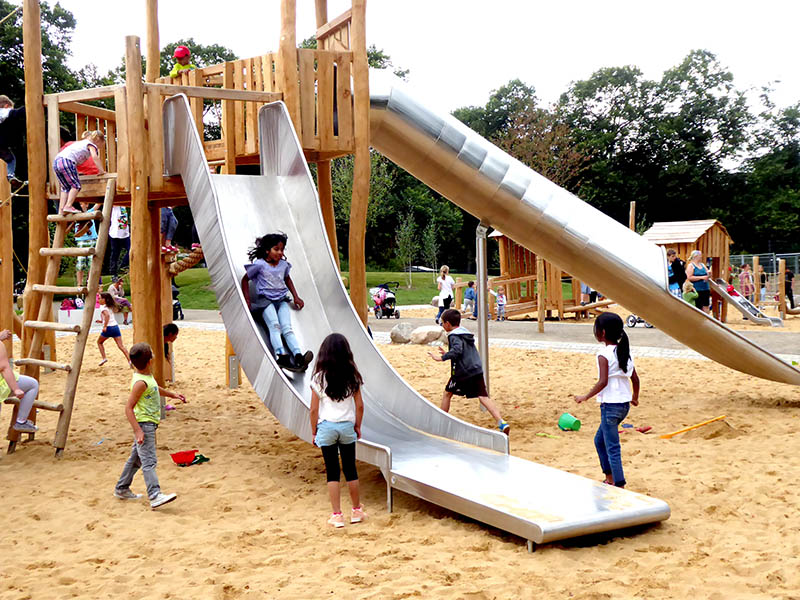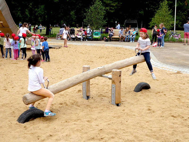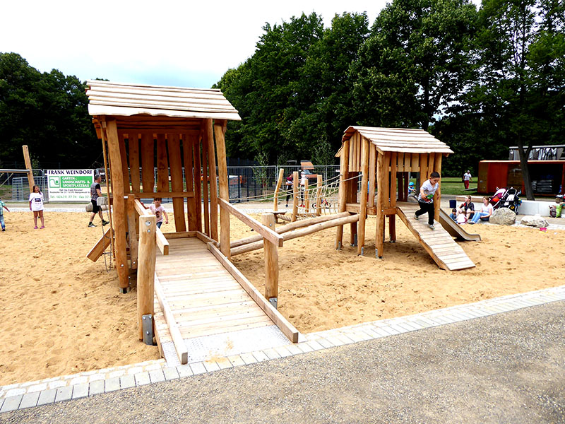 Entstanden ist eine große Kletterlandschaft mit unterschiedlichen Schwierigkeitsgraden, die auf einen Turm hinaufführt. Hier wartet das Highlight einer langen Röhrenrutsche sowie einer Freifallrutsche. Wer genug geklettert hat auf den warten Wippe und Schaukel: Besondereres Highlight hier der Kinderland Schaukelsitz Groß und Klein®. Hängematten und ein barrierefreier Kleinkindbereich runden das spannende Spielangebot im Park Holzbenden ab.