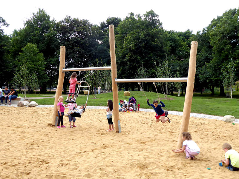 Naturnahe Optik, viele Robinienstämme, die kreuz und quer liegen und an das alte „Holzbenden“ erinnern: dies waren grob die Vorgaben nach einer Kinderbefragung und den Vorstellungen der Landschaftsarchitekten.