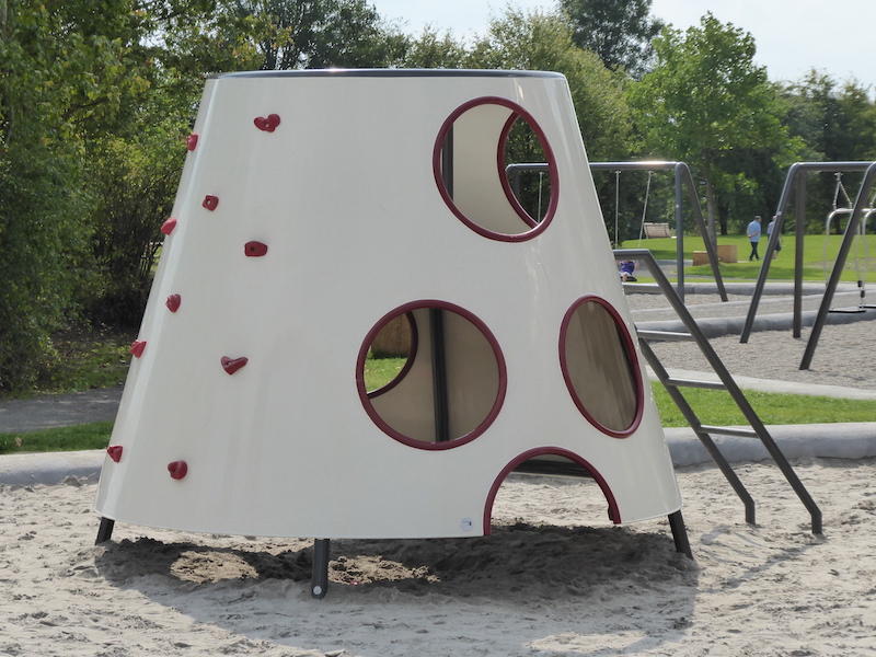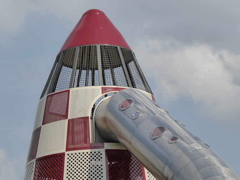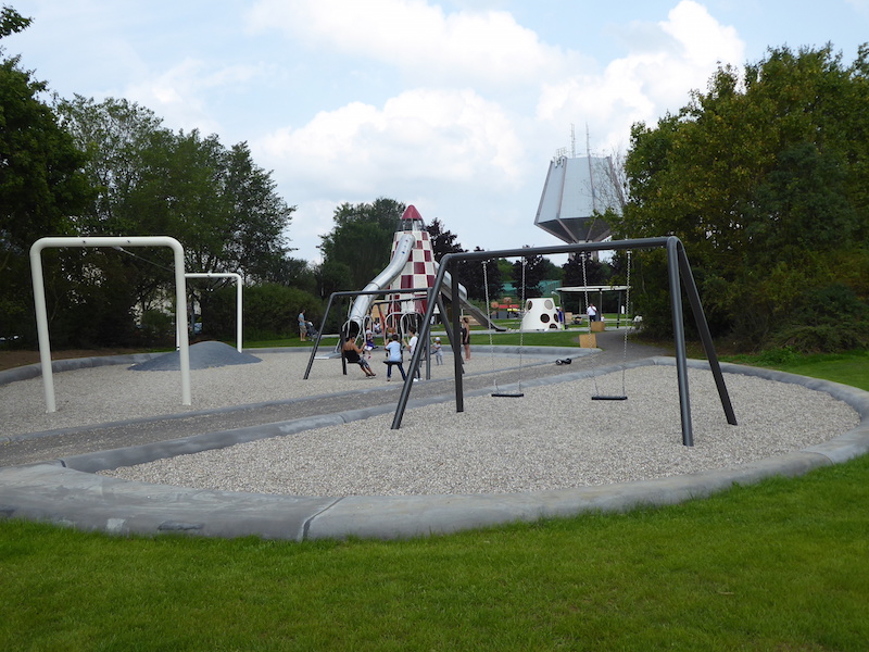 Das Landschaftsarchitekturbüro Förder aus Essen hat diese planerisch umgesetzt. Unteranderem sind dabei zwei Spielplätze, die sich an dem Thema Raumfahrt orientieren, entstanden. Hier prägen ein Rutschenturm in Raketenform und verschiedene Raumkapseln zum Klettern und Spielen das Bild.