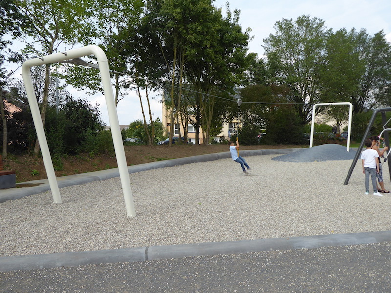 Verschiedene Schaukeltypen, eine Seilbahn und ein Sandbereich für kleine Kinder runden den Spielbereich ab.