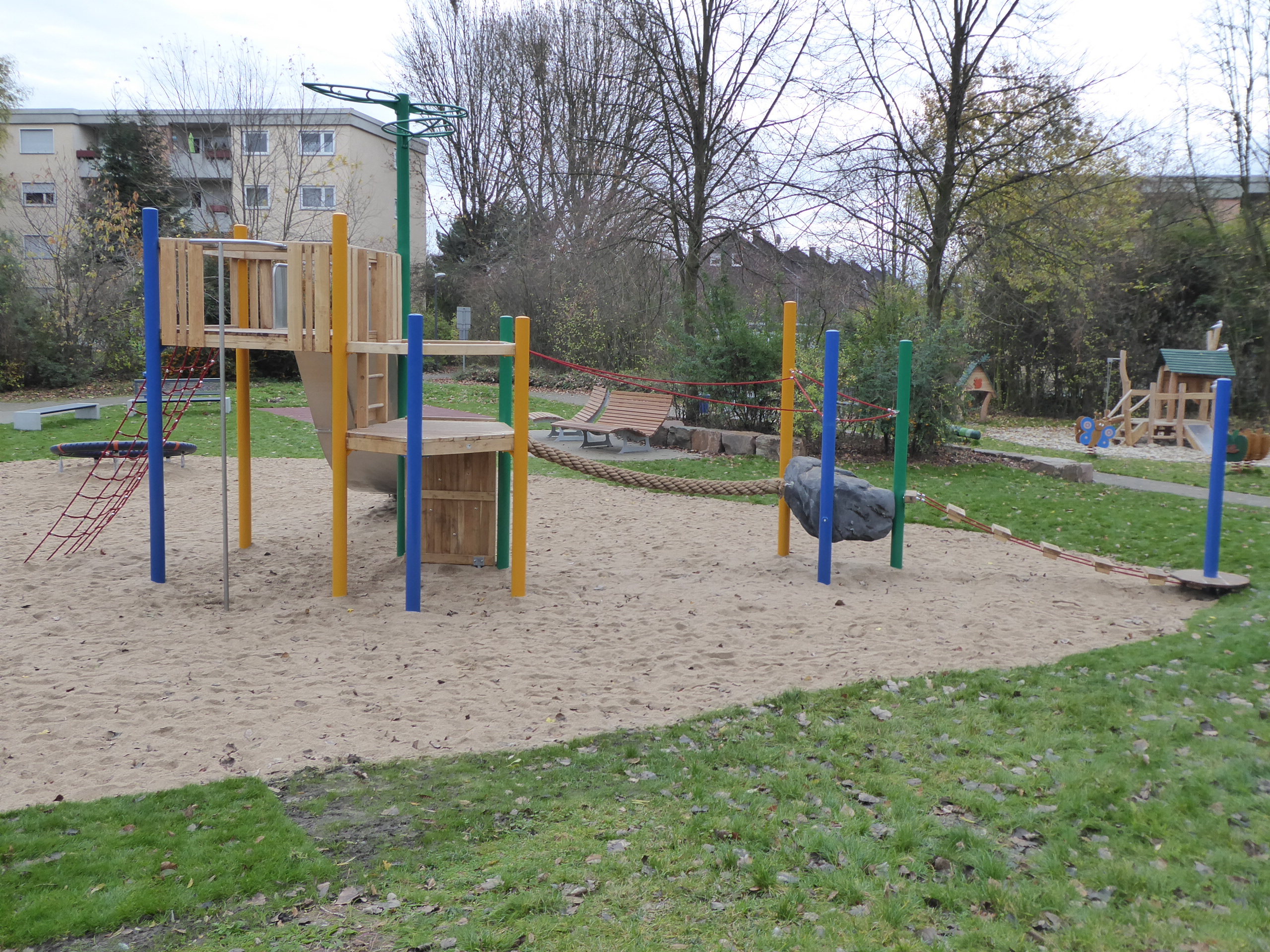 Um die neue Spielanlage dem Thema des vorhandenen Kleinkinderbereiches "Raupe Nimmersatt" anzupassen, haben wir zusammen mit der Stadt Herten eine farbenfrohe und ganz besondere Spielanlage entwickelt.
