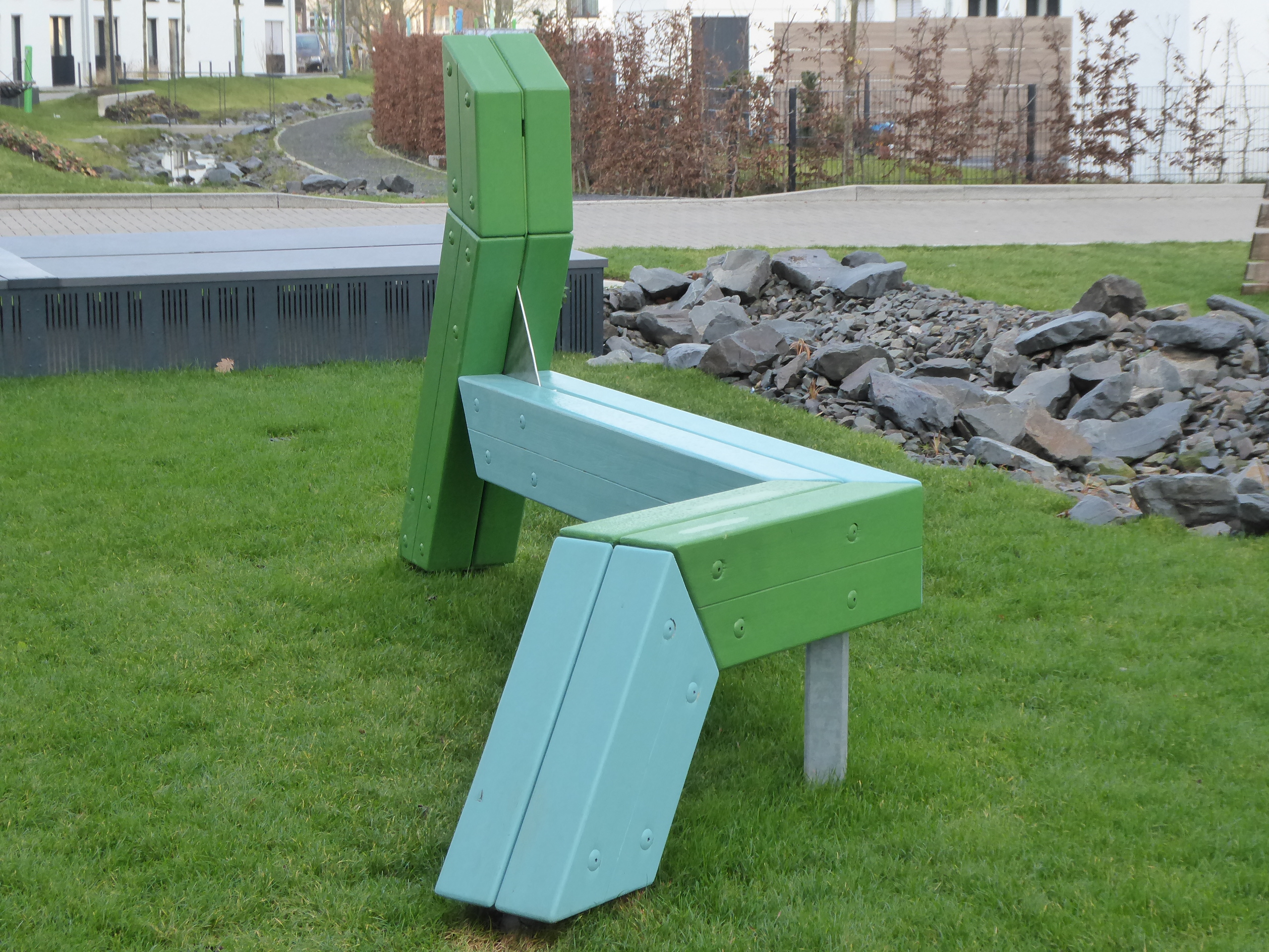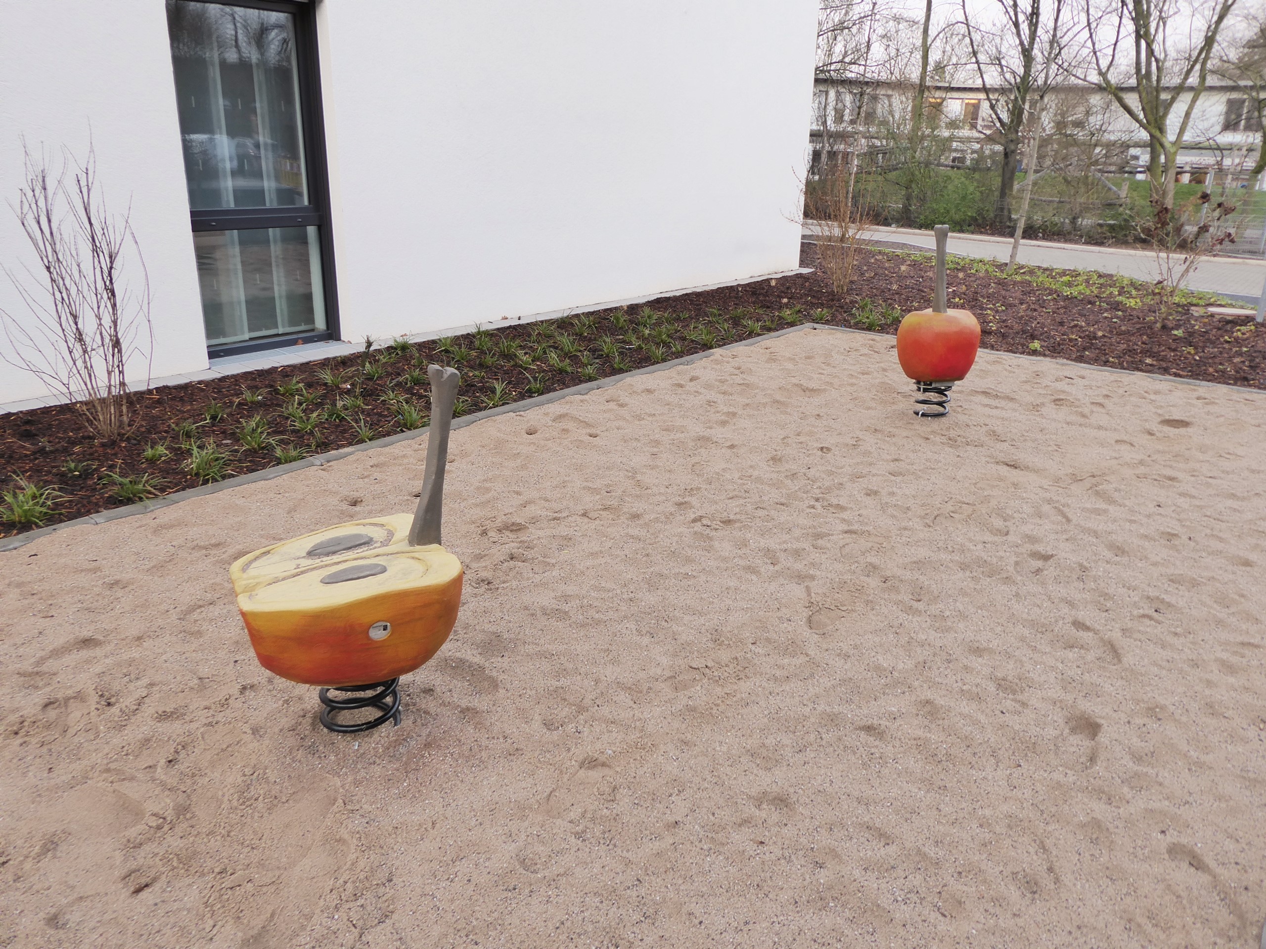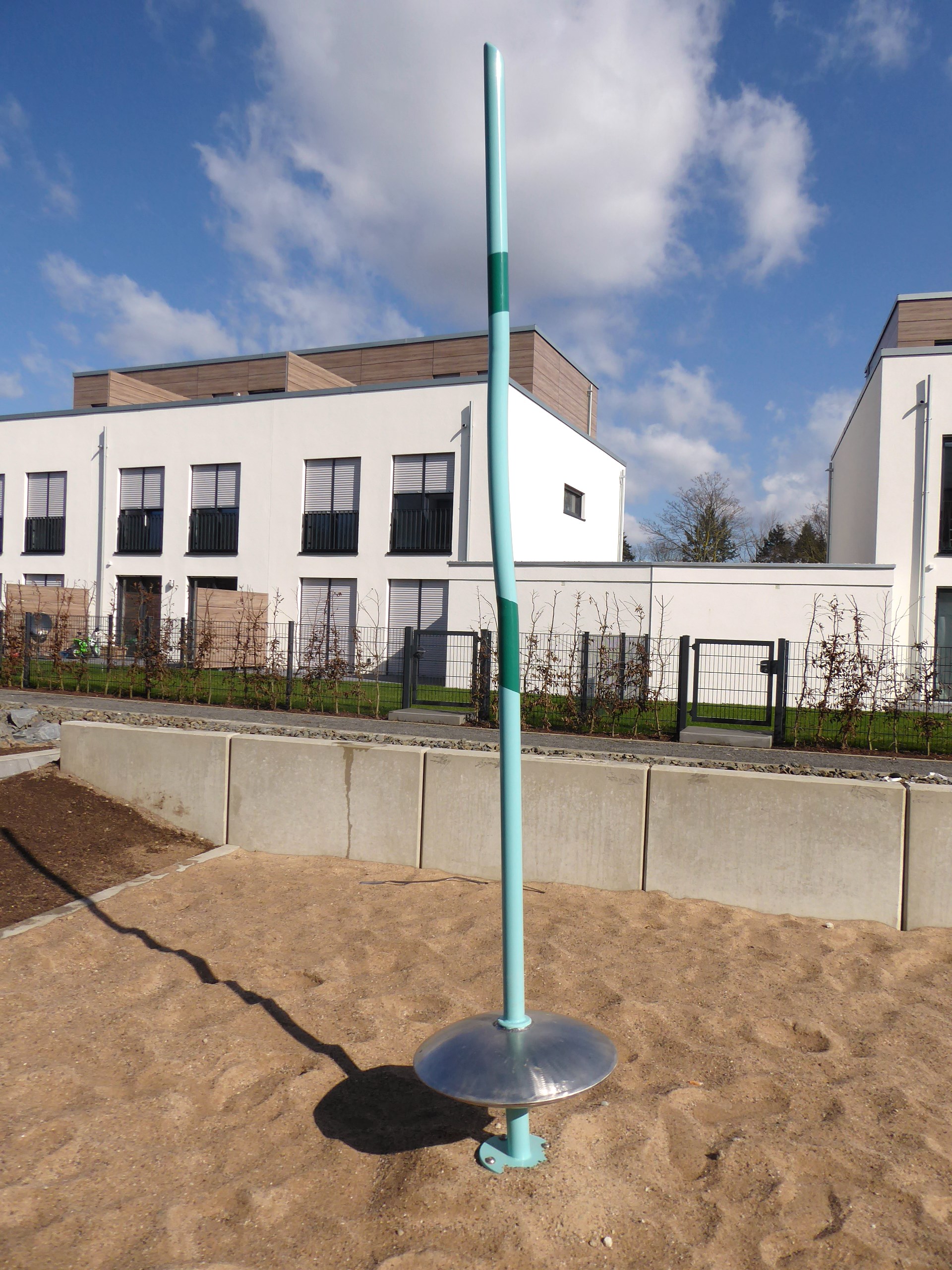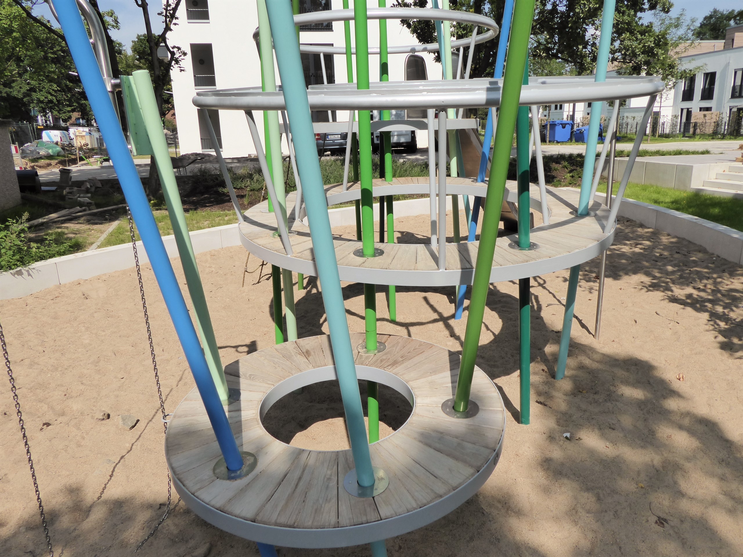 Alle Spielgeräte wie der Stangenkreisel, die Hängematte und die Sandspielanlage mit farbigem Lichtlolli entlang des Bachlaufs wurden auf einer Tiergarage montiert.