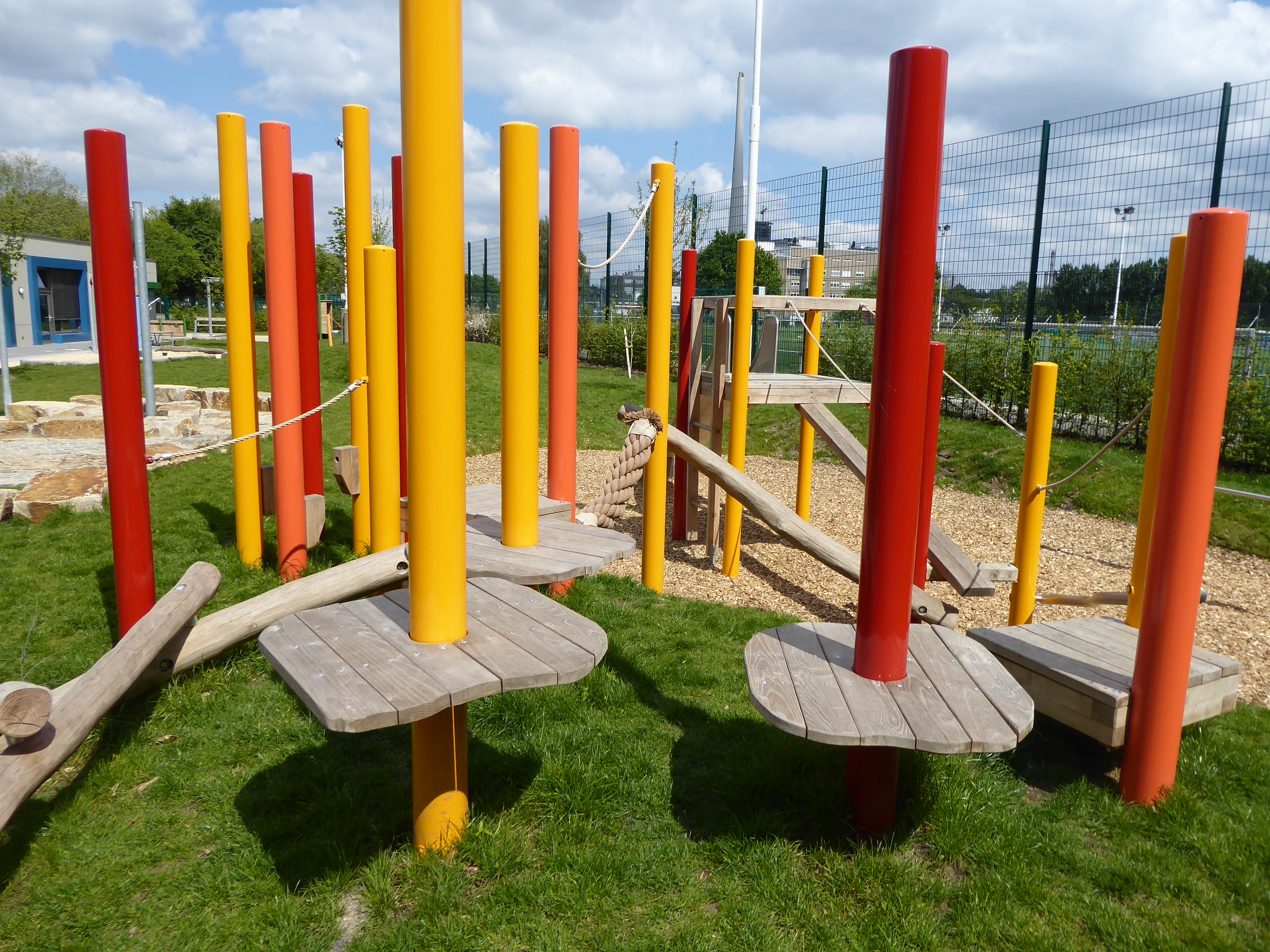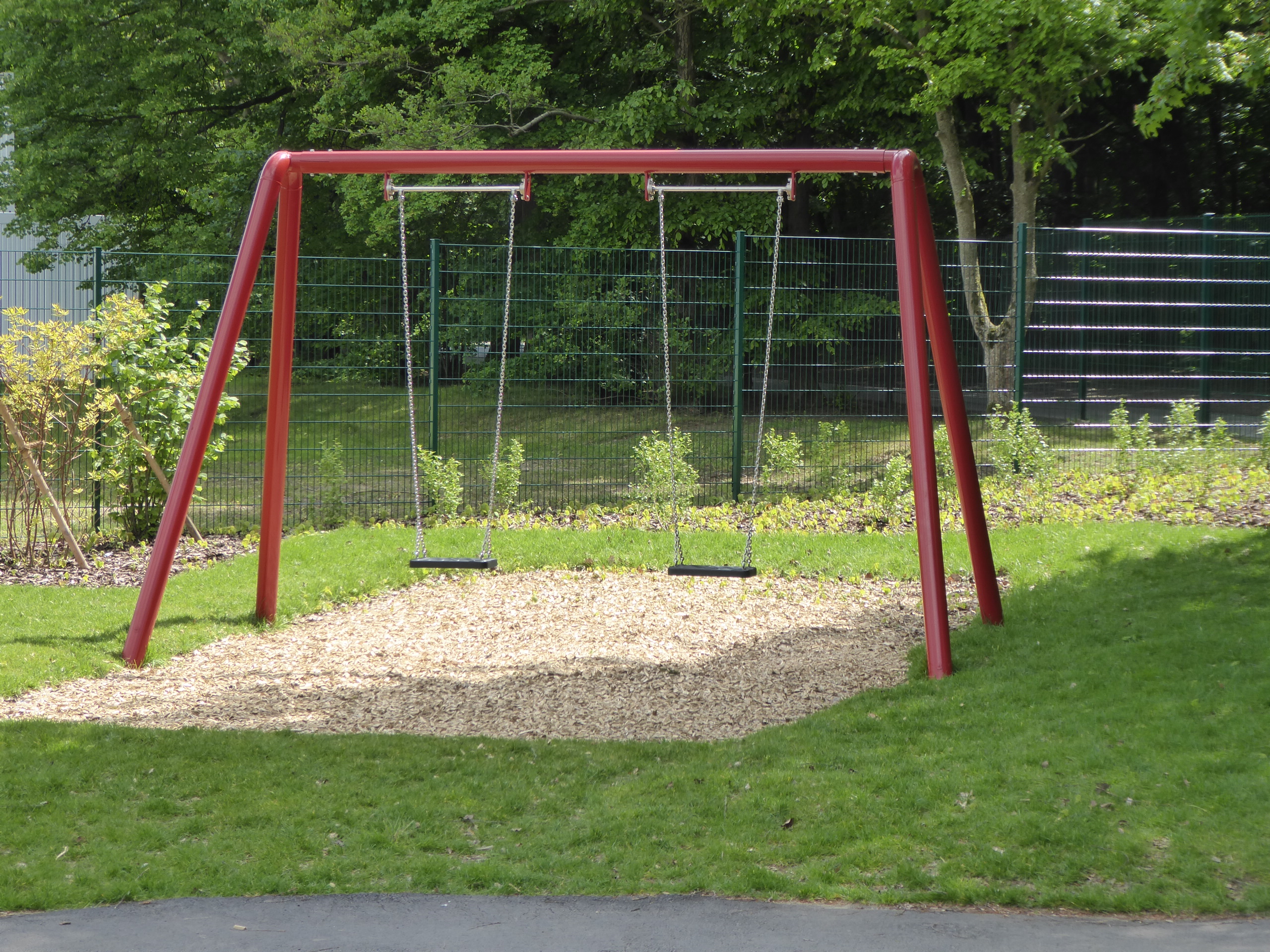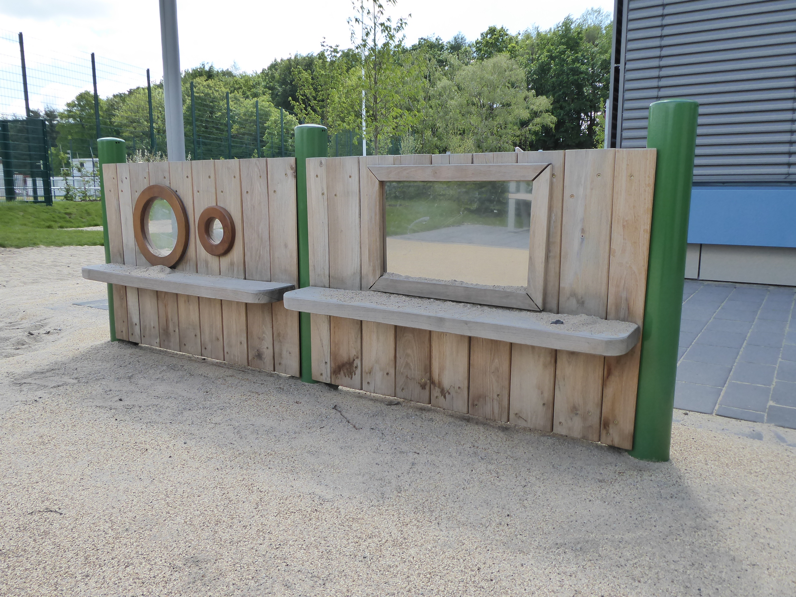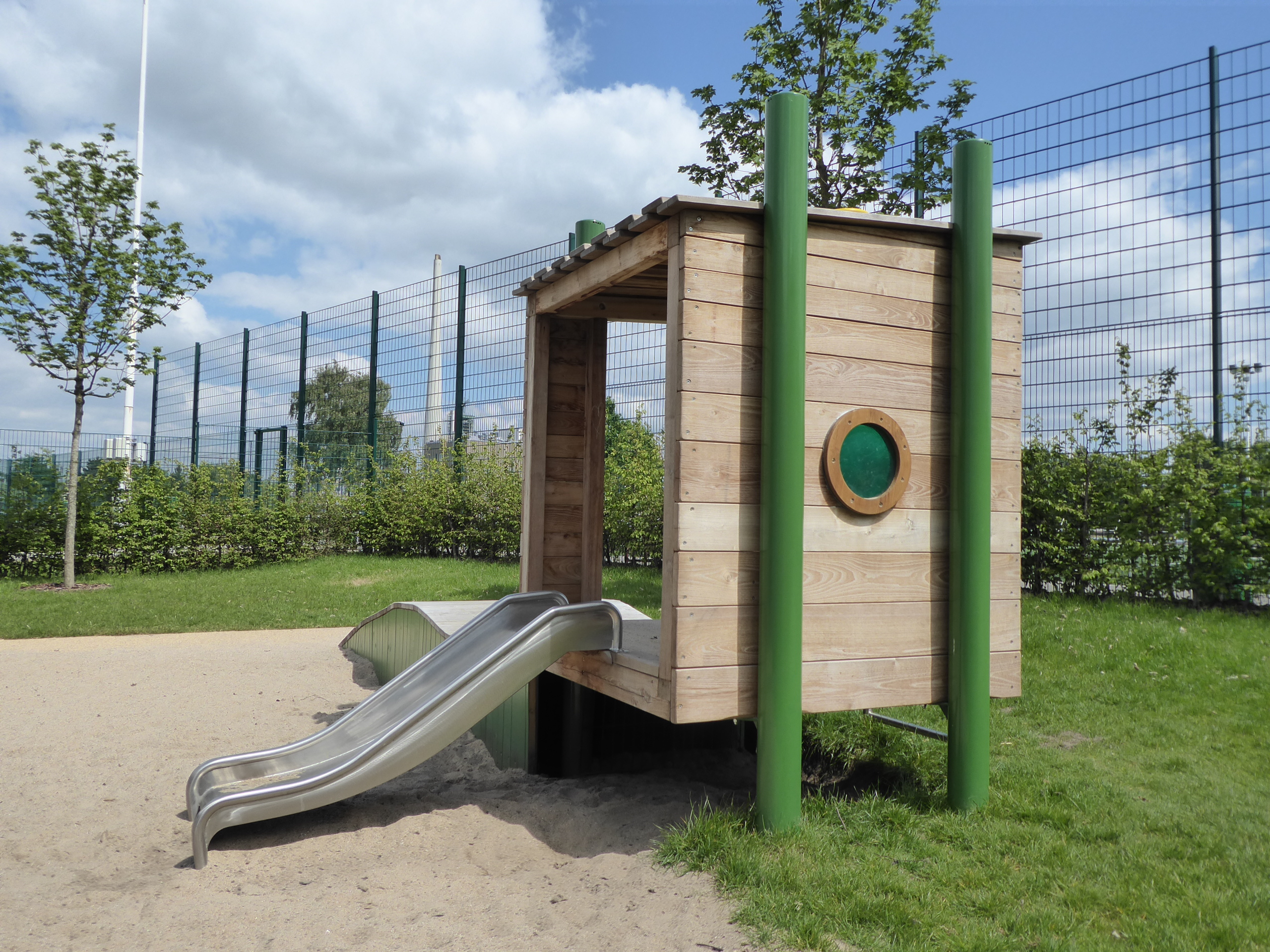 Die Spielgeräte passen sich mit ihren rechteckigen Formen perfekt in ihr Umfeld ein, dass ebenfalls sehr gradlinig gestaltet ist.