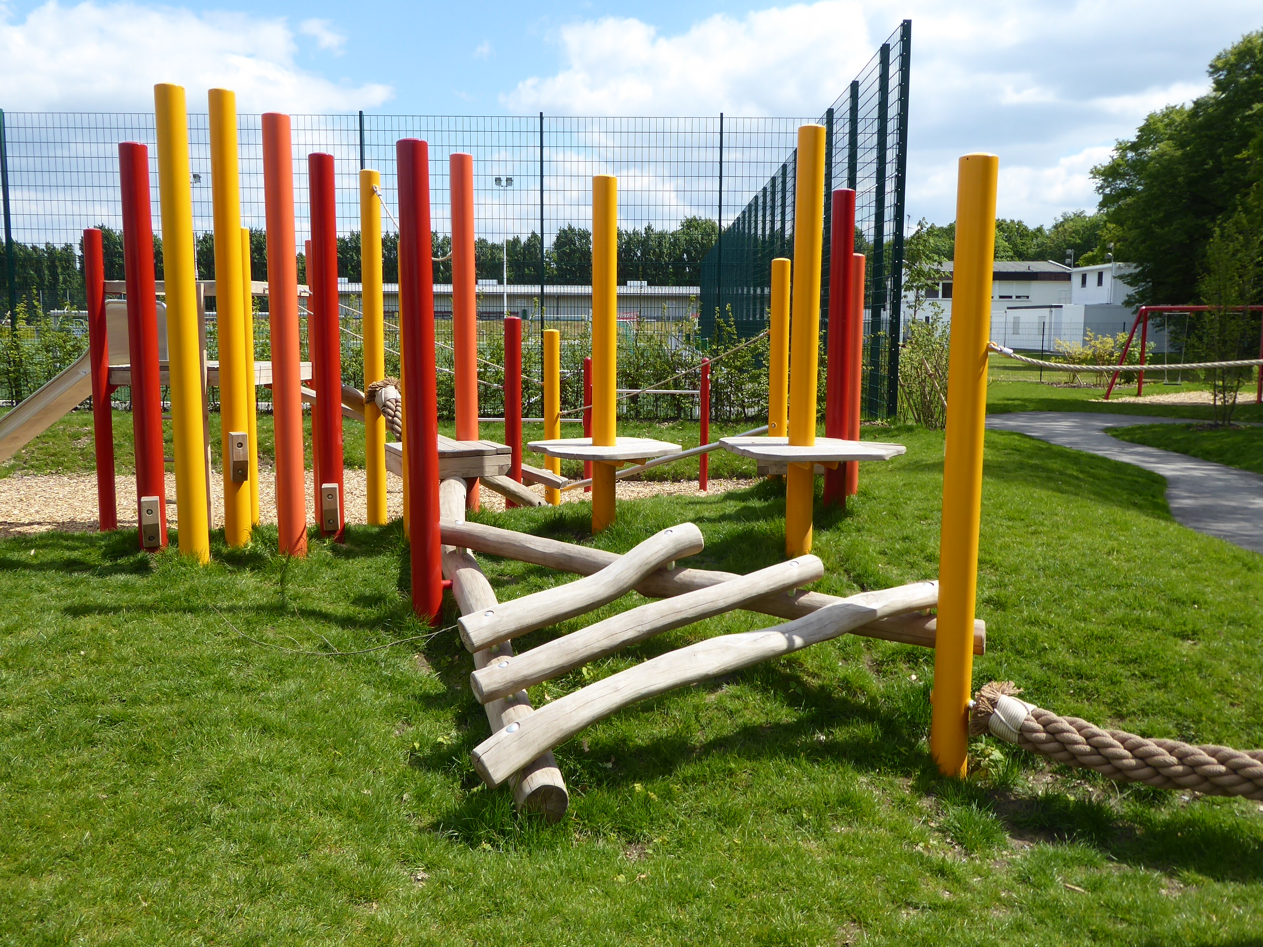 Ein blaues Sandspiel, ein rot-orangenes Rutschenpodest mit Balancieranlage und viele weitere Farbakzente sorgen für ein spannendes Durcheinander.