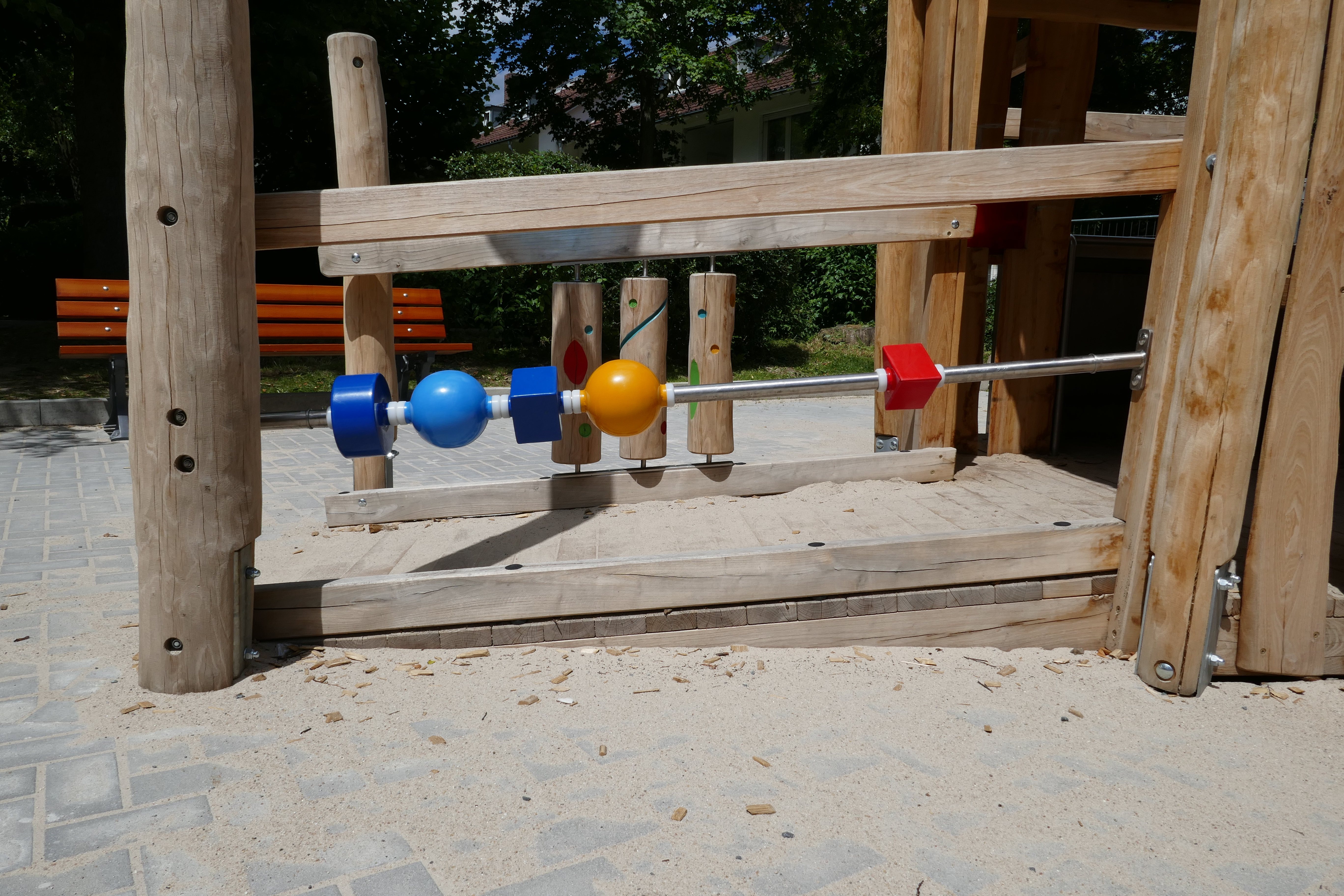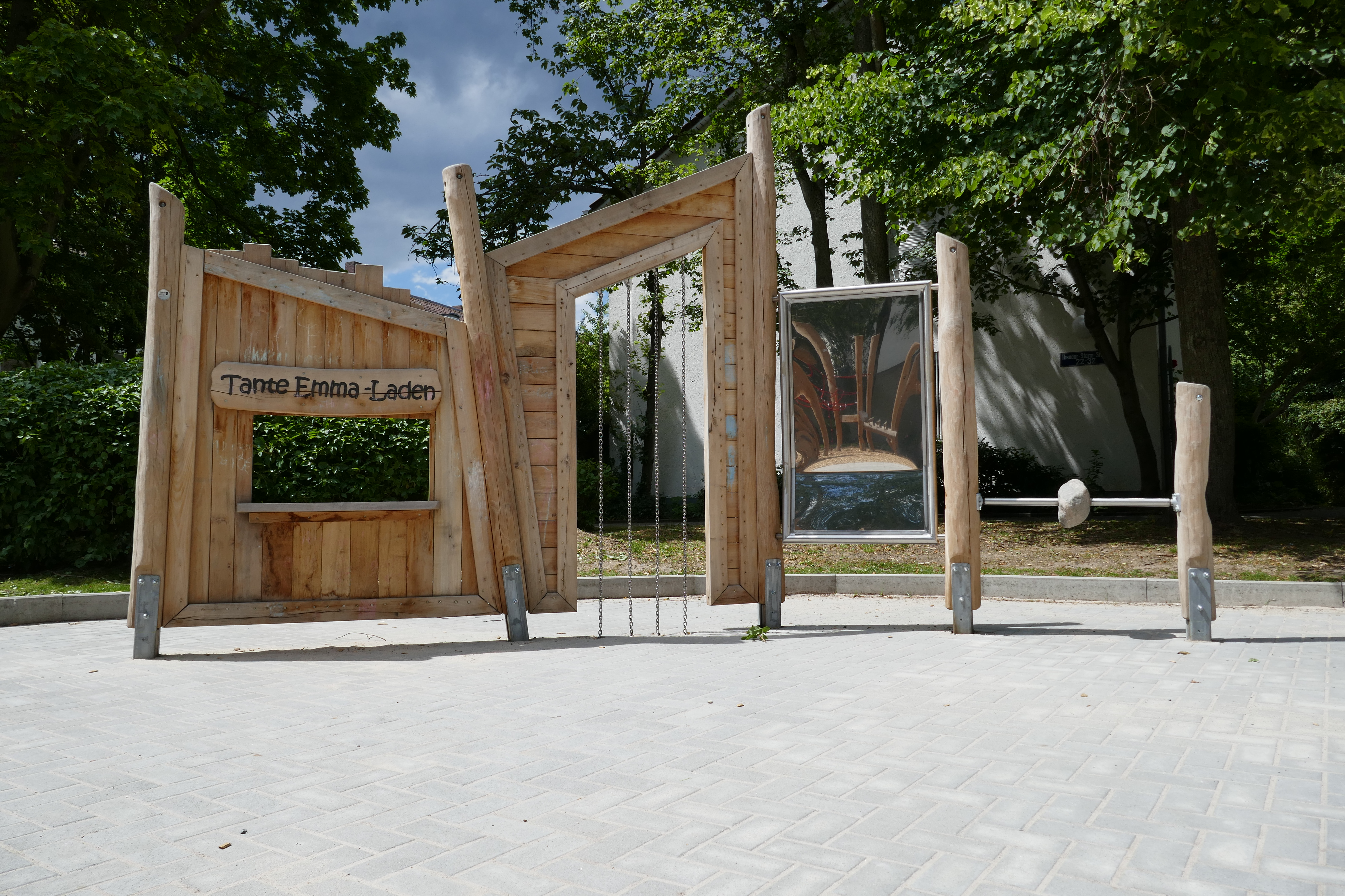 Der Tante-Emma-Laden mit seinen verschiedenen Möglichkeiten gibt auch Menschen mit Beeinträchtigungen die Möglichkeit des Mitspielens. Eben diese kommen auch bei der kleinen Spielanlage auf ihre Kosten, die mit vielen Kleinigkeiten, wie z.B. einer Schiebespielwand und einem unterfahrbaren Sandspieltisch ausgestattet ist. Auch hier sorgt das Topelement für farbige Akzente beim Spielen.