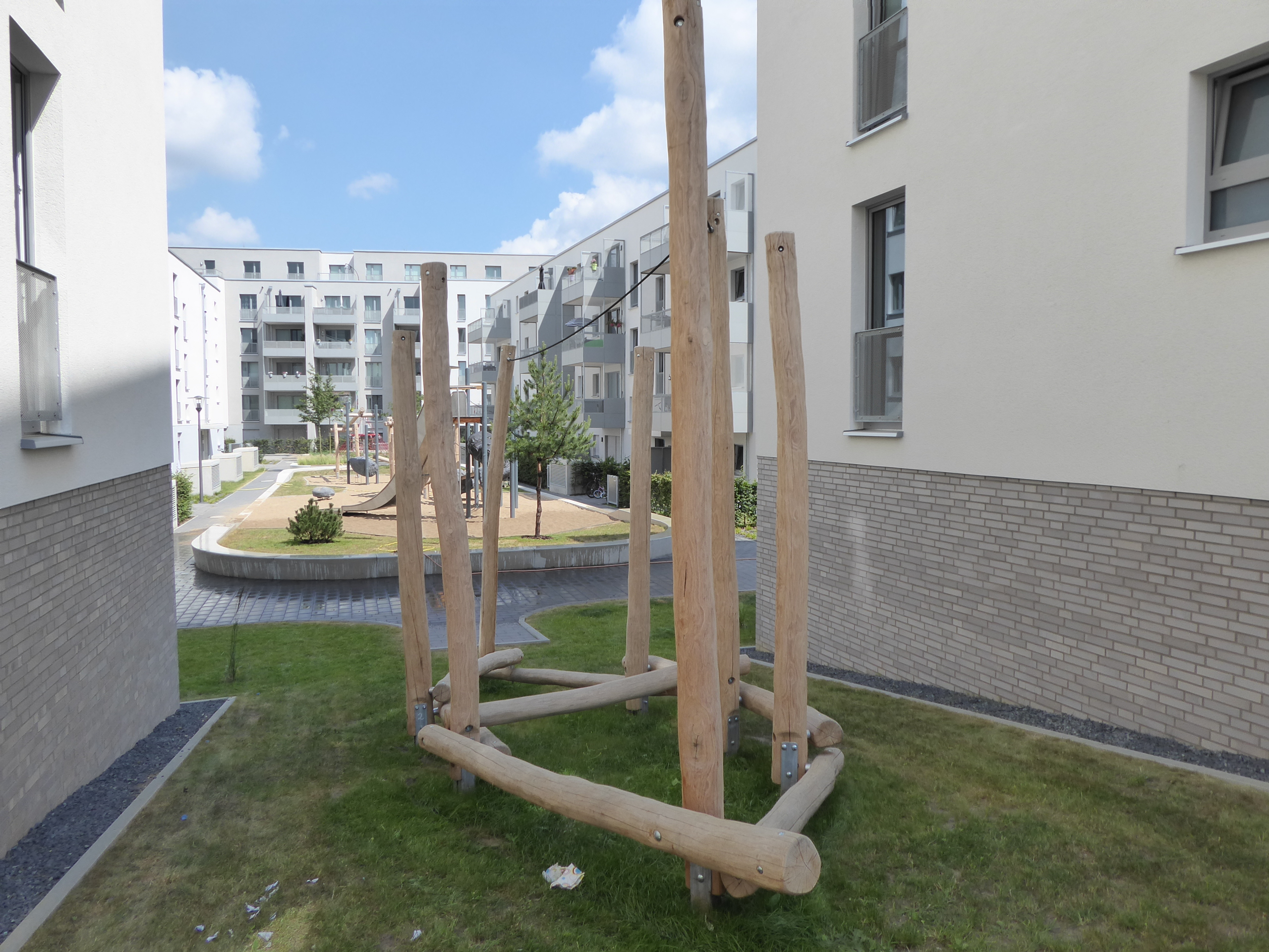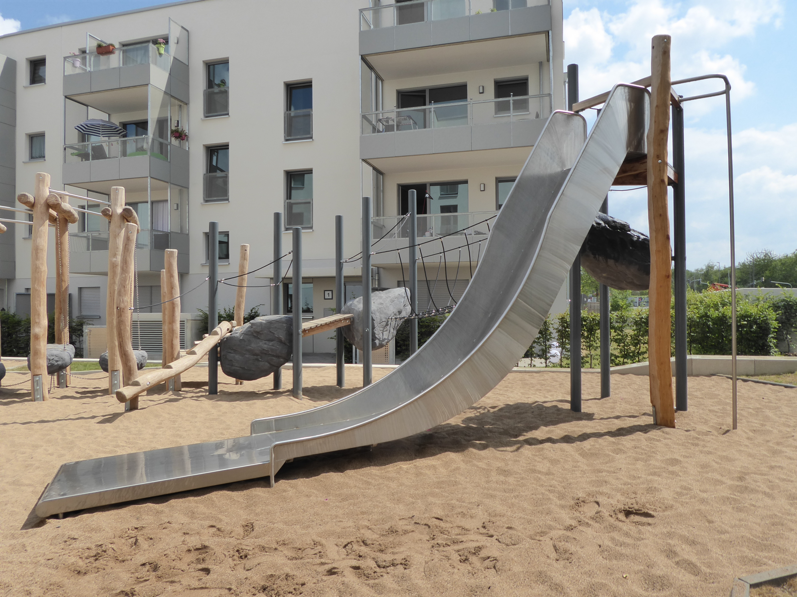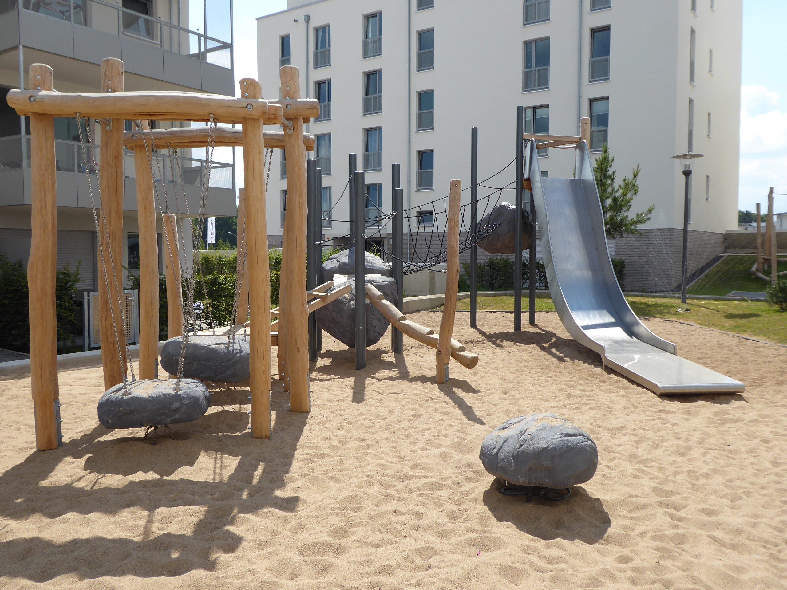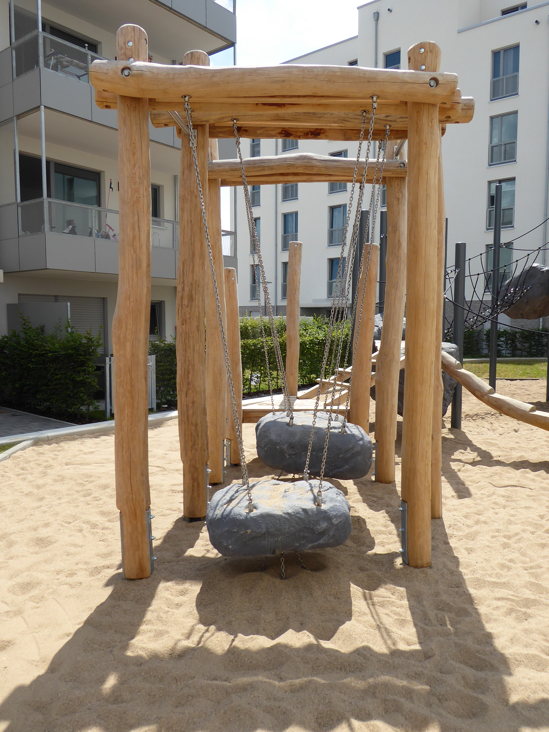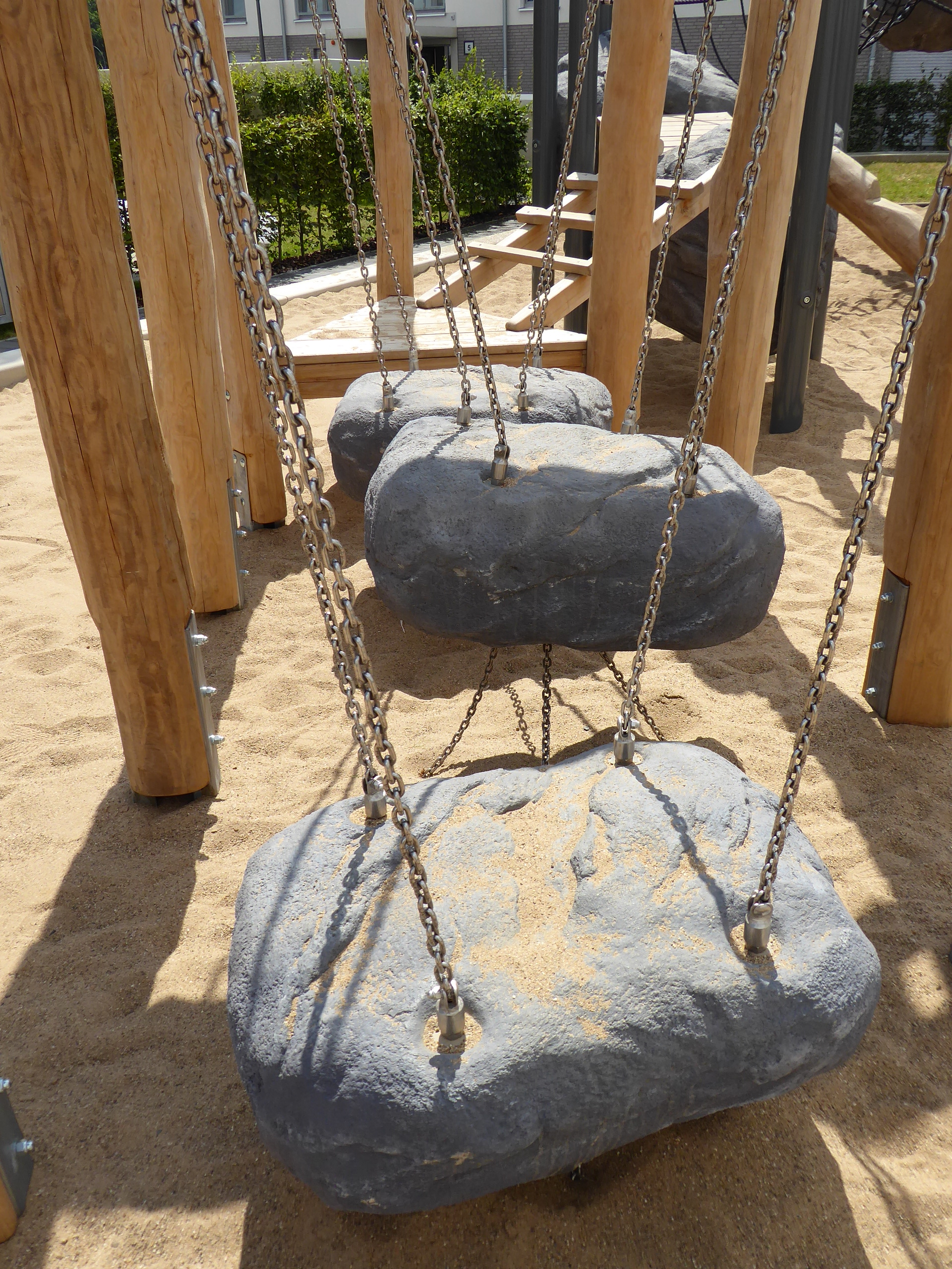 Die schwebenden Felsen haben wir bei diesem Spielplatz im Butzweilerhof in Köln auf unterschiedlichen Arten und Weisen eingebracht. Mal als einzelner Kletterfelsen, als Elemente in einer Wackelbrücke und als natürlich als separaten Felsen auf einer Feder, der jeden Besucher in Schwung bringt.