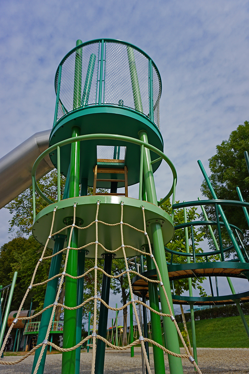 und abwärts kann es über Tunnelrutsche, Rutschstange, Kletternetz oder Leiter