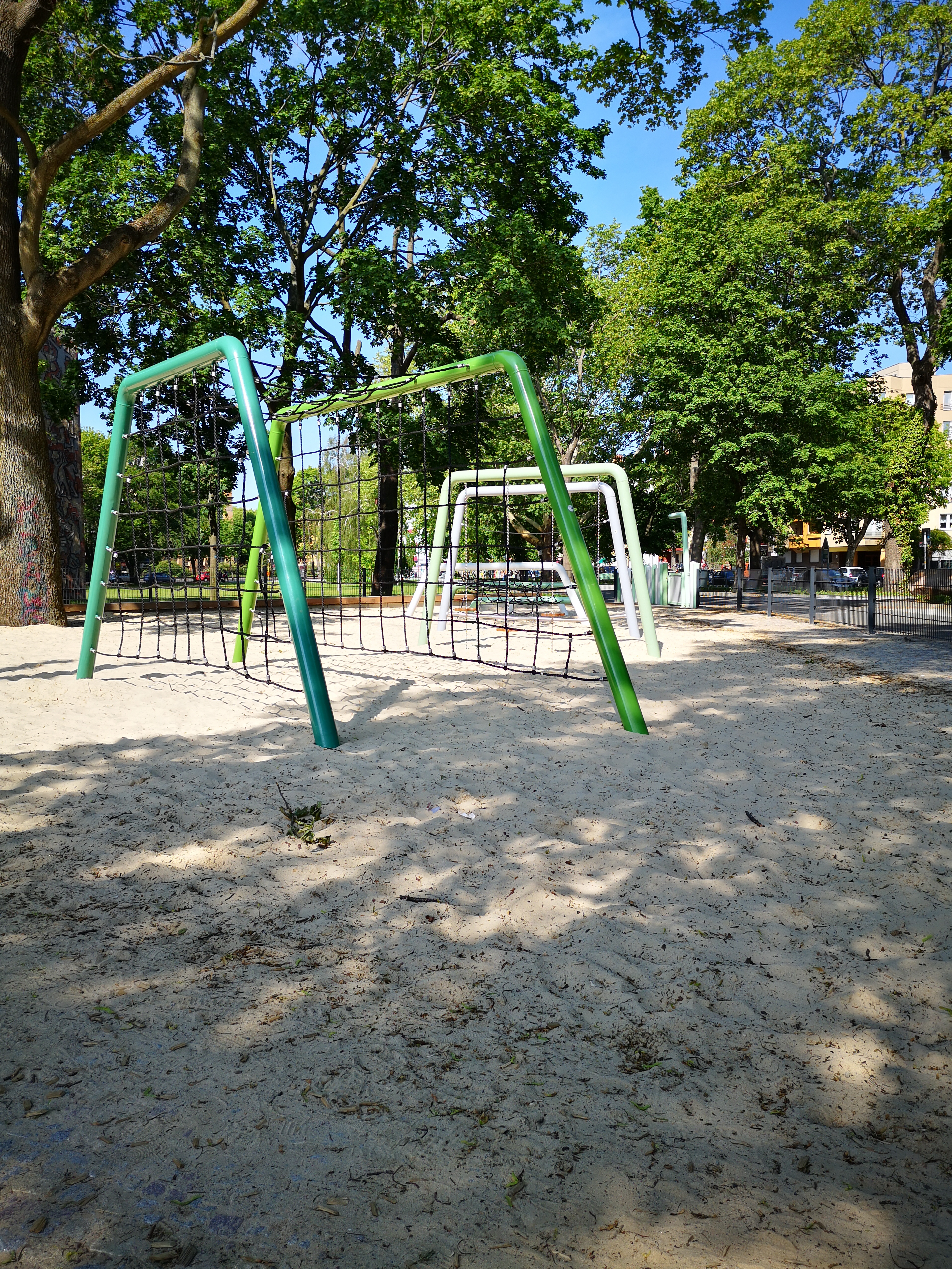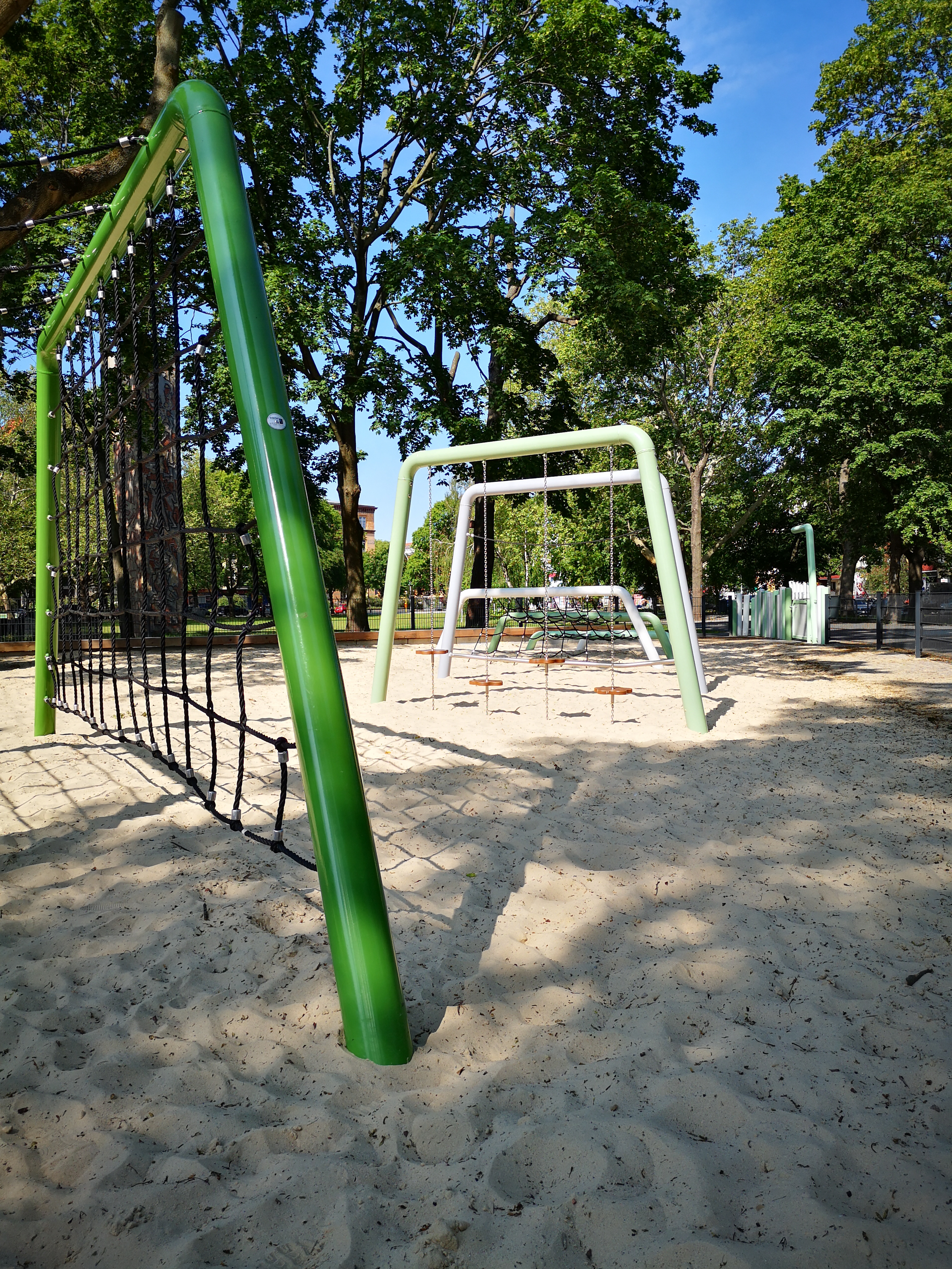 Die großen Netzbögen in kräftigen Grüntönen vermitteln sofort das Gefühl "da will ich hoch klettern". Die Kinder können dabei an einer Seite hochklettern und über ein Kletternetz, das zwischen die Bögen gespannt worden ist, zum nächsten Bogen rüber klettern.