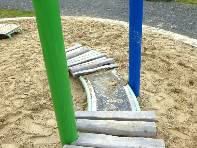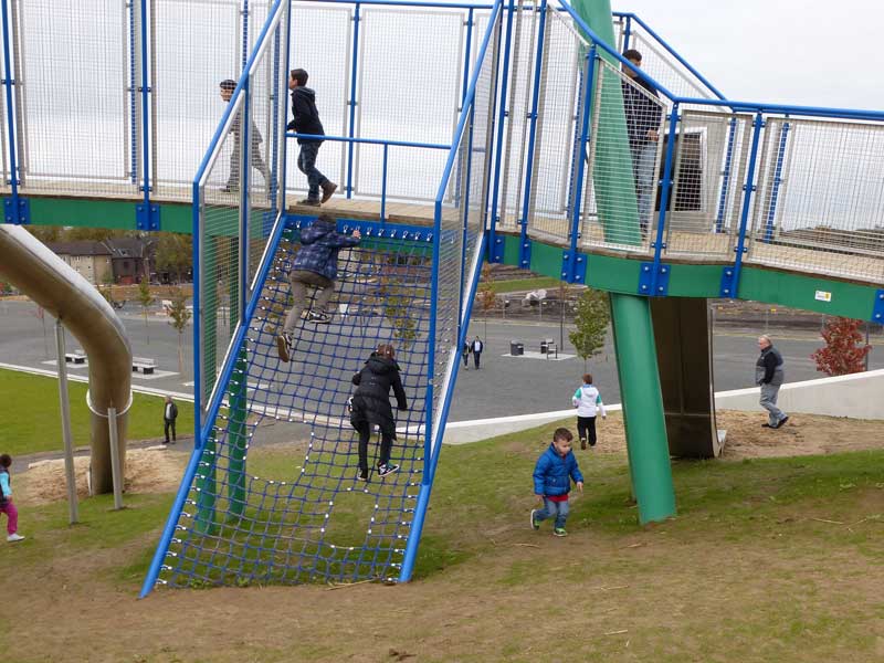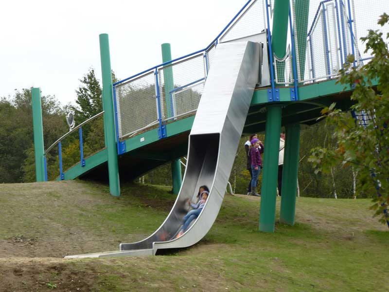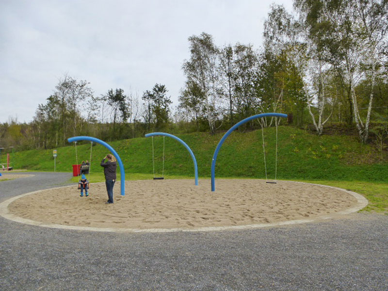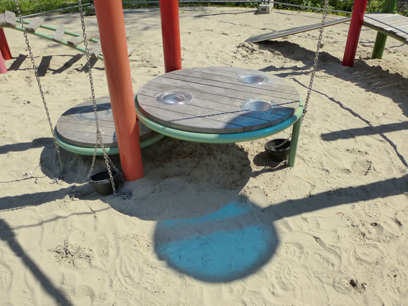 Wer danach schnell wieder die Erde unter den Füßen spüren will und Lust auf Nervenkitzel hat, nimmt einfach die rasante Freifallrutsche nach unten. Dort warten dann noch ein großer Sandbereich mit schwenkbaren Eimern und vielen weiteren Spielmöglichkeiten sowie Schaukeln.