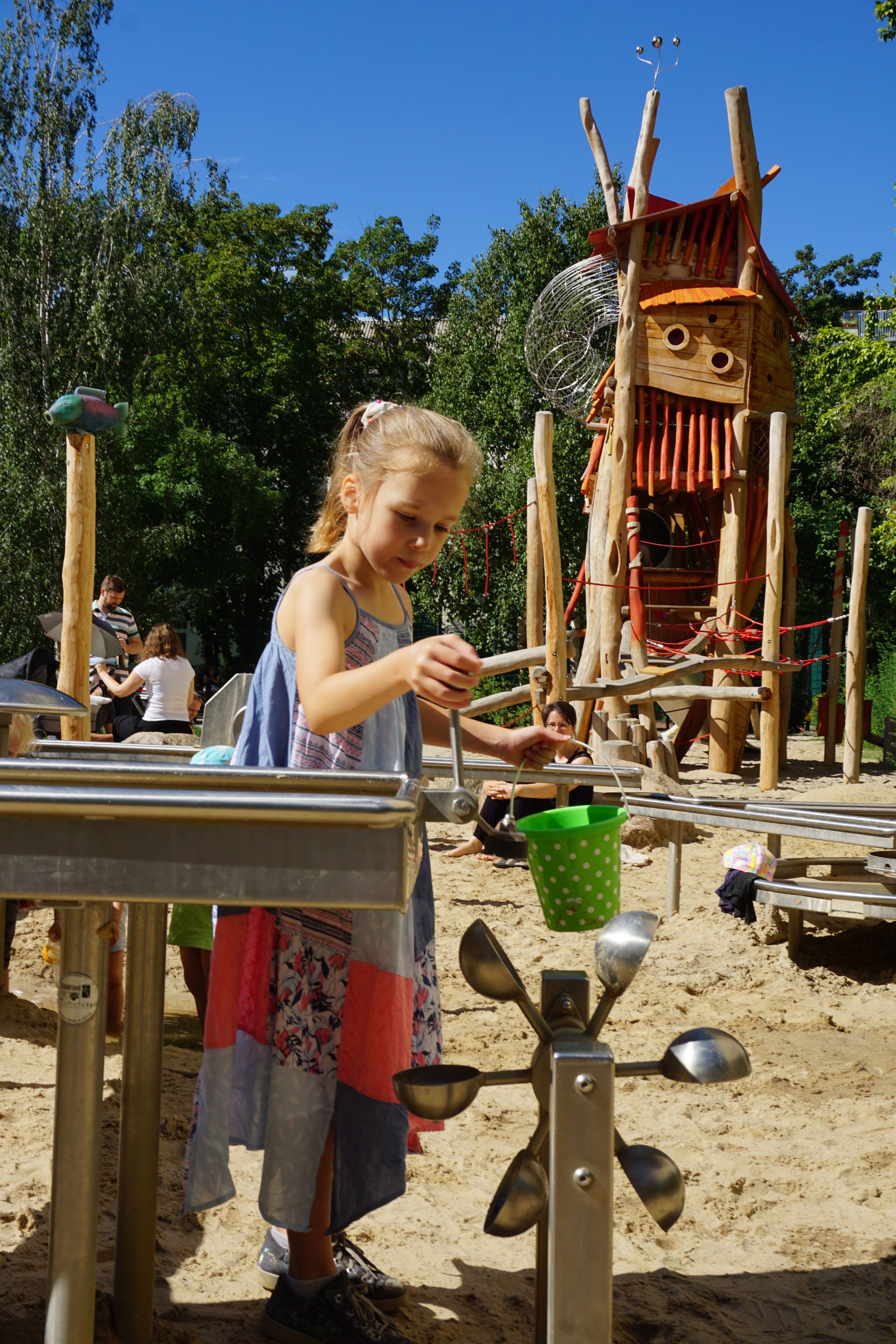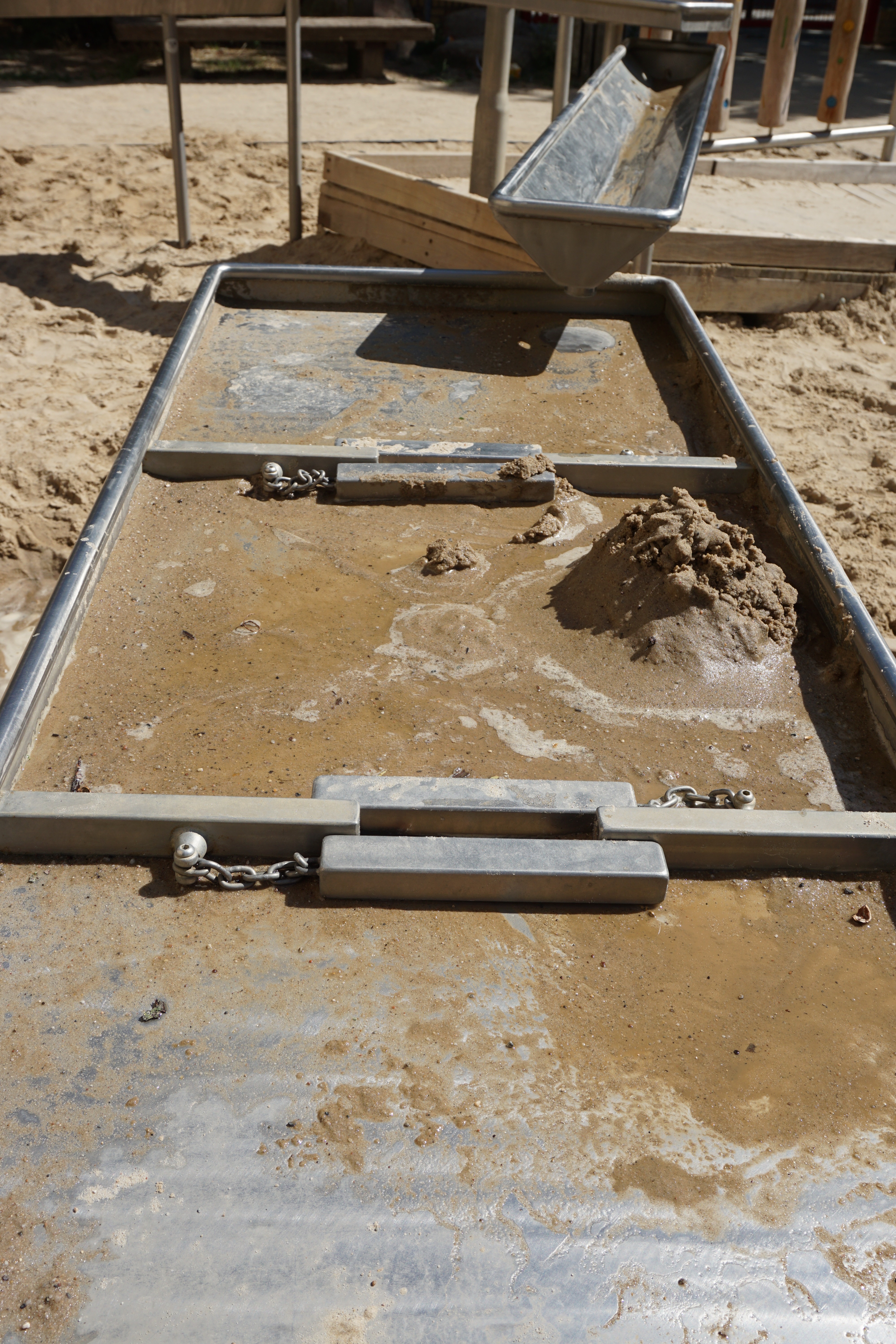 Verschiedene Pumpen die über ein Podest sogar mit dem Rollstuhl erreicht werden können laden alle Besucher zum munteren matschen ein. Von hier aus wird das Wasser über zahlreiche Wasserrinnen in unterschiedlichen Höhen zu den Matschtischen geleitet, in denen die Kinder kleine Burgen bauen können.