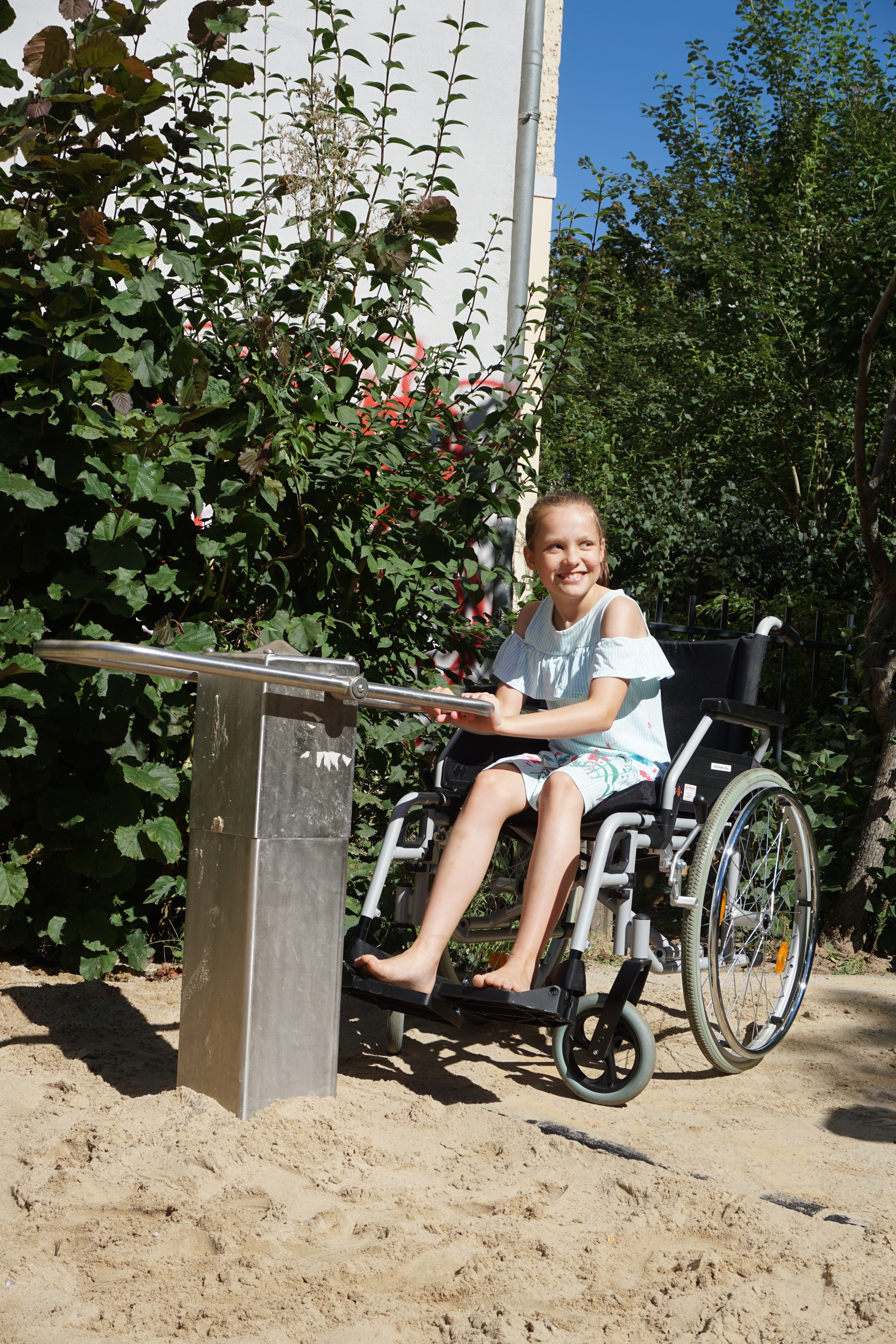 Hinweis: Die gezeigten Bilder dienen nur zur Veranschaulichung inklusiver Spielgeräte. Die gezeigten Personen stellen die Situationen nach und haben keine Beeinträchtigungen.