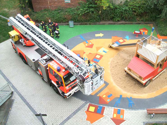 Schnell wird sich an das Steuer gesetzt oder auf die große Wagenfläche gesprungen und schon geht sie los, die wilde Fahrt durch die Straßen der Stadt. Mit blinkenden Lichtern erreichen alle „Feuerwehrmänner“ den Einsatzort. Im Eiltempo wird das Fahrzeug kletternd oder rutschend verlassen, um das brennende Gebäude zu löschen. Oder ist es doch nur eine Katze auf dem Baum?
