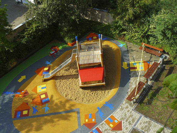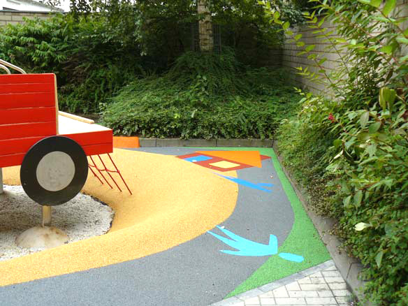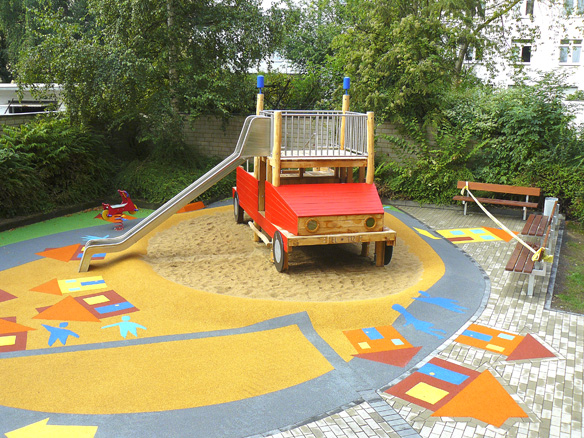 Mit Netzen, Lenkrad, Rutschmöglichkeit und viel Fläche, umgeben von Sand, lässt sich das Feuerwehrauto wunderbar bespielen. Landschaftsarchitekt Andreas Mark-Dammrich hat sich hier etwas Tolles und Fantasieanregendes ausgedacht.