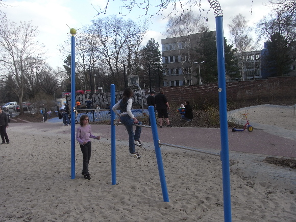 Thema des Spielplatzes in der Königin-Elisabeth-Straße ist "RAUMFAHRT". Dieses Thema ließ sich durch die Verwendung von Stahl aufgrund seiner Formbarkeit und gleichzeitiger Tragfähigkeit kreativ umsetzen.