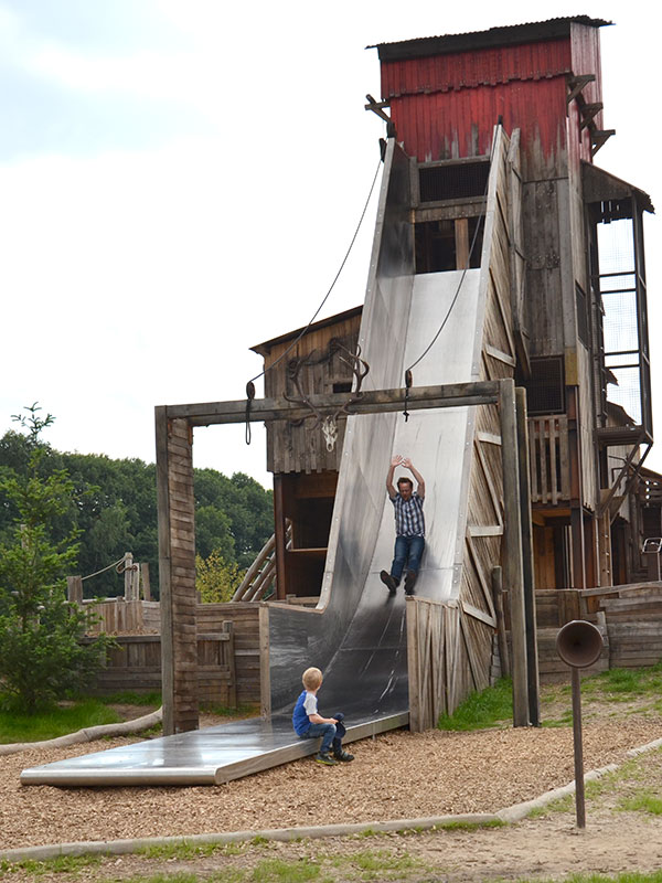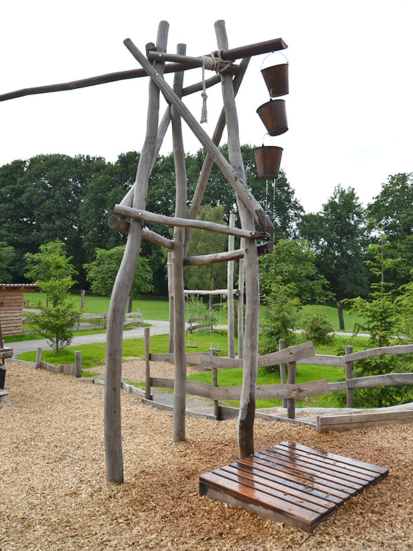 Die Kletterfertigkeit der Kinder kann auch auf dem hohen Förderturm bewiesen werden. Er hat mehrere Ebenen, die erklommen werden wollen. Am Turm ist eine große „Baumstammrampe“ in Form einer großzügigen Wasserrutsche. Sie ist extra breit und hat einen verlängerten Auslauftisch.