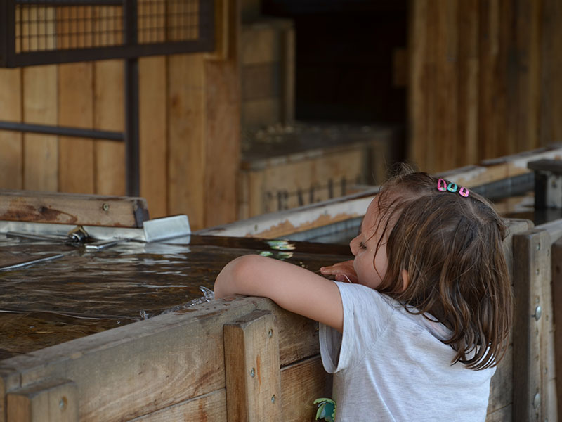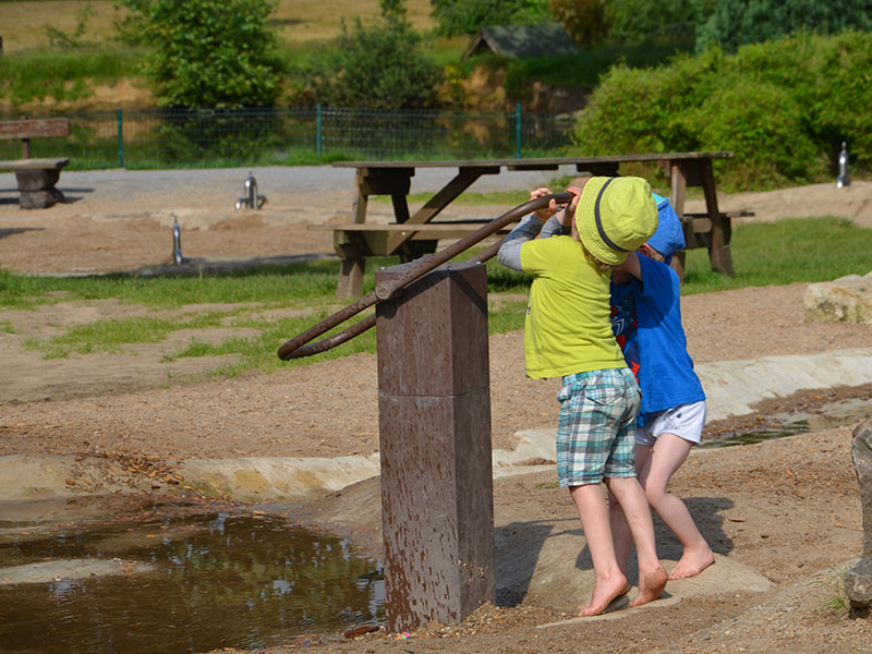 Zum Gebäudekomplex gehört auch eine Goldwaschanlage, die mit 2 Pumpensystemen ausgestattet ist. Die Feuerwehrpumpe pumpt Wasser auf ein Wasserspiel mit Eimern, welches am Ende ein Wasserrad antreibt. Die Drehpumpe versorgt eine Vielzahl von Wasserrinnen und Goldwaschrinnen mit Wasser und sorgt dafür, dass an Wasser- und Matschtischen nach Herzenslust gespielt und gespritzt werden kann.