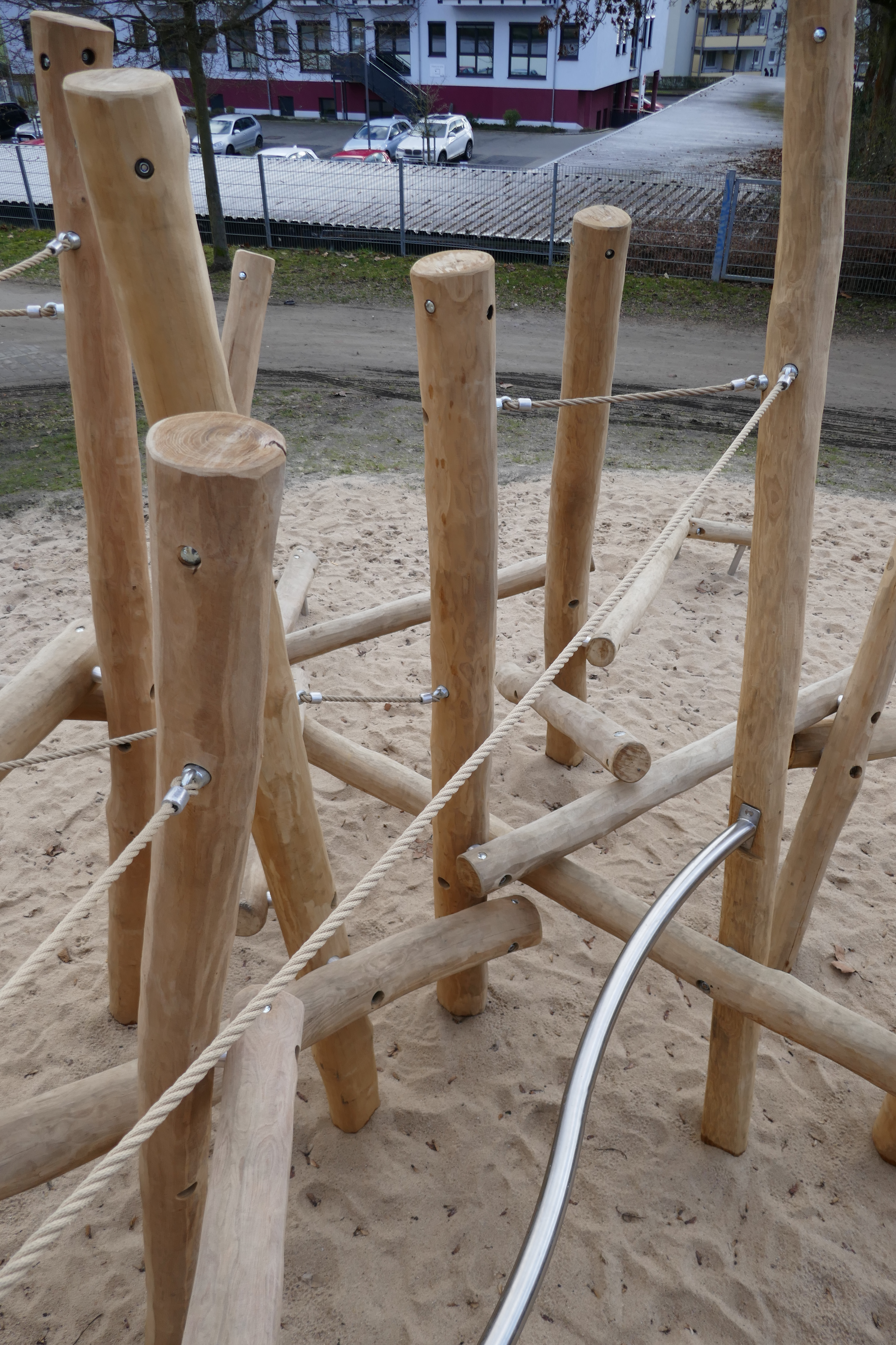 Das außergewöhnliche Balanciermikado fällt dem Besucher sofort ins Auge. Es verfügt aber unzählige Aufstiegsmöglichkeiten und mit seinen verschiedenen Balancierbalken und Standpfosten mit Trittkerben werden die Kinder auf unterschiedlichste Weise beansprucht.
