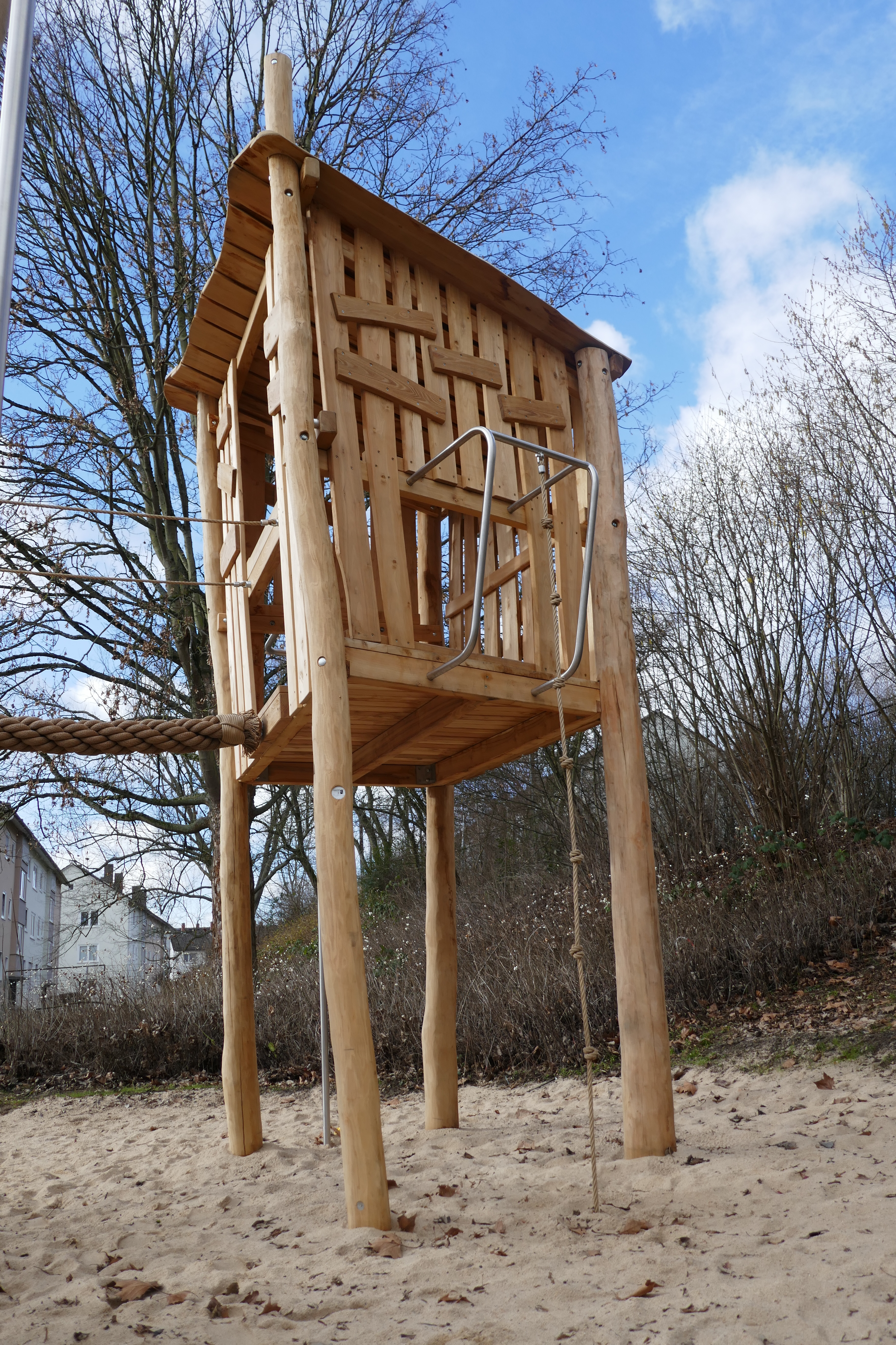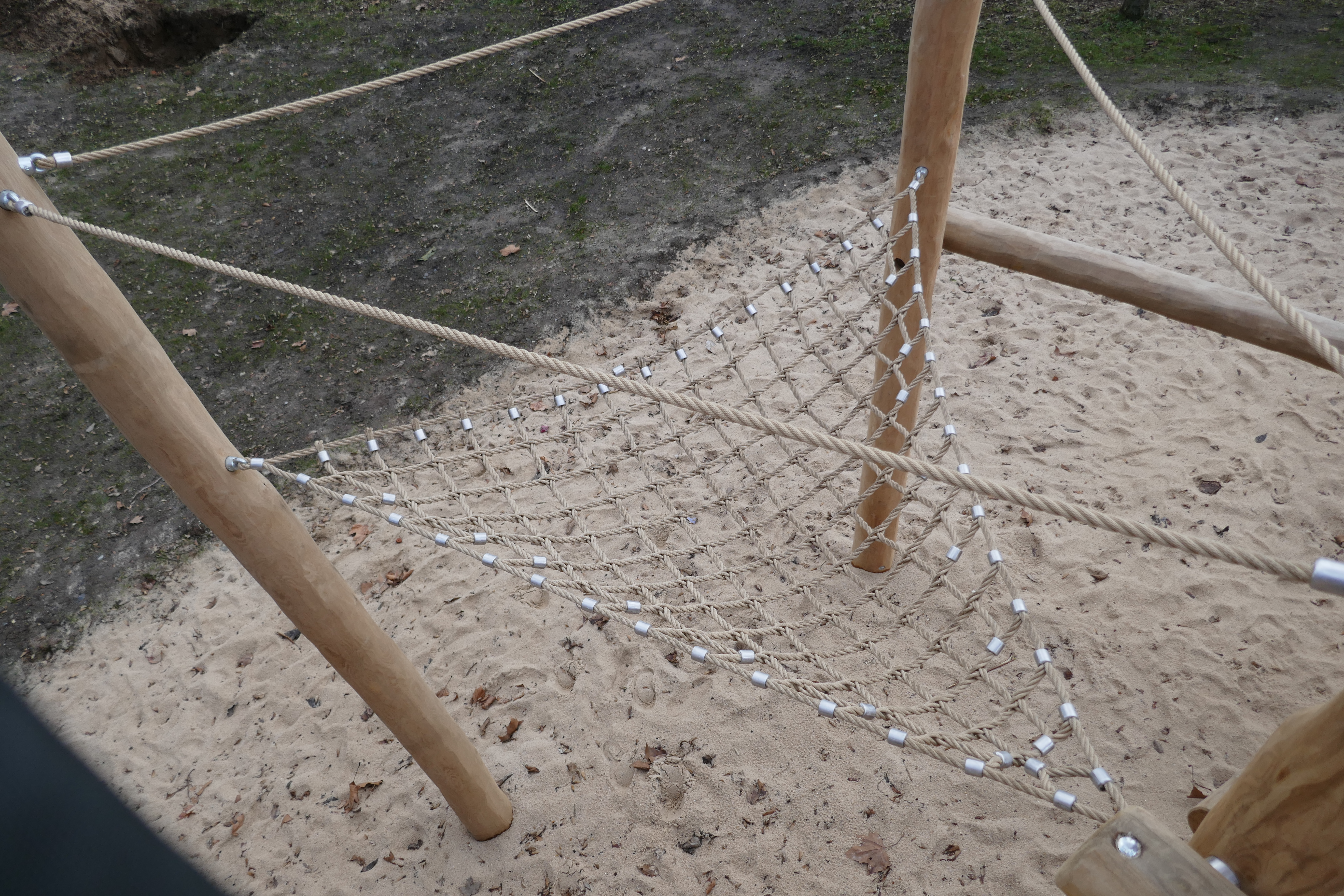Sobald man das Balanciermikado erklommen hat, gelangt man über die Tampenbrücke zum Baumhaus, aus dem man den gesamten Spielplatz überblicken kann.