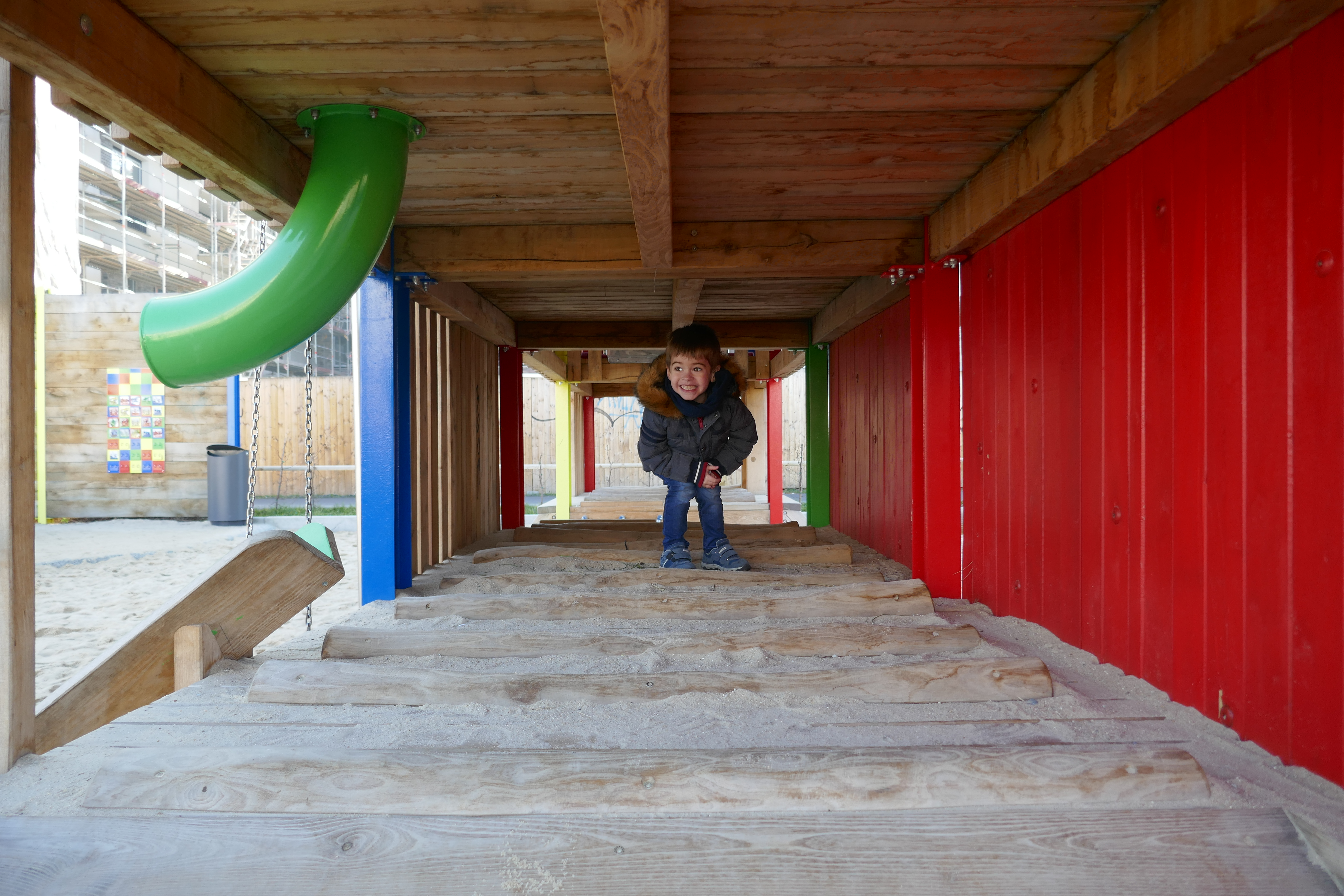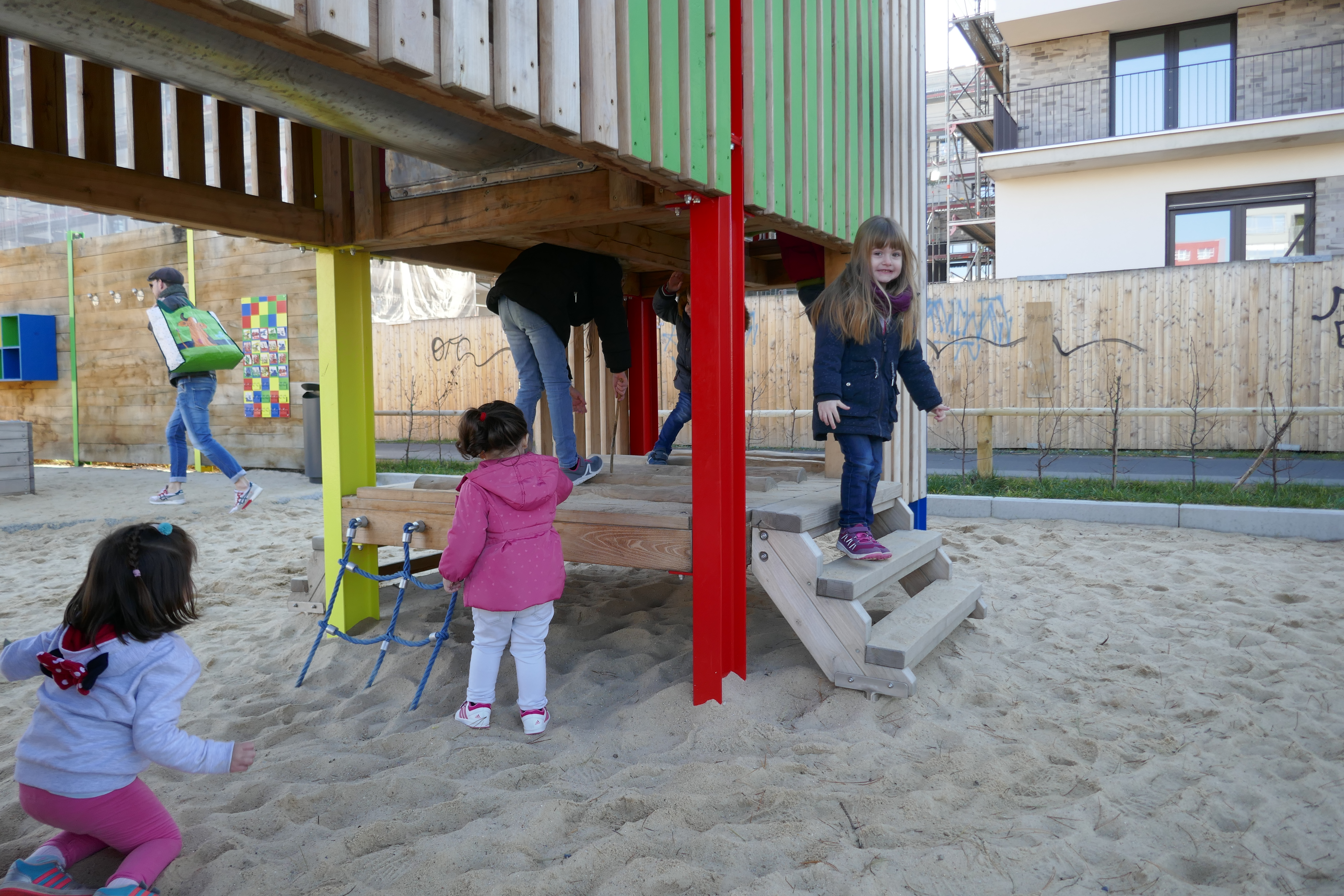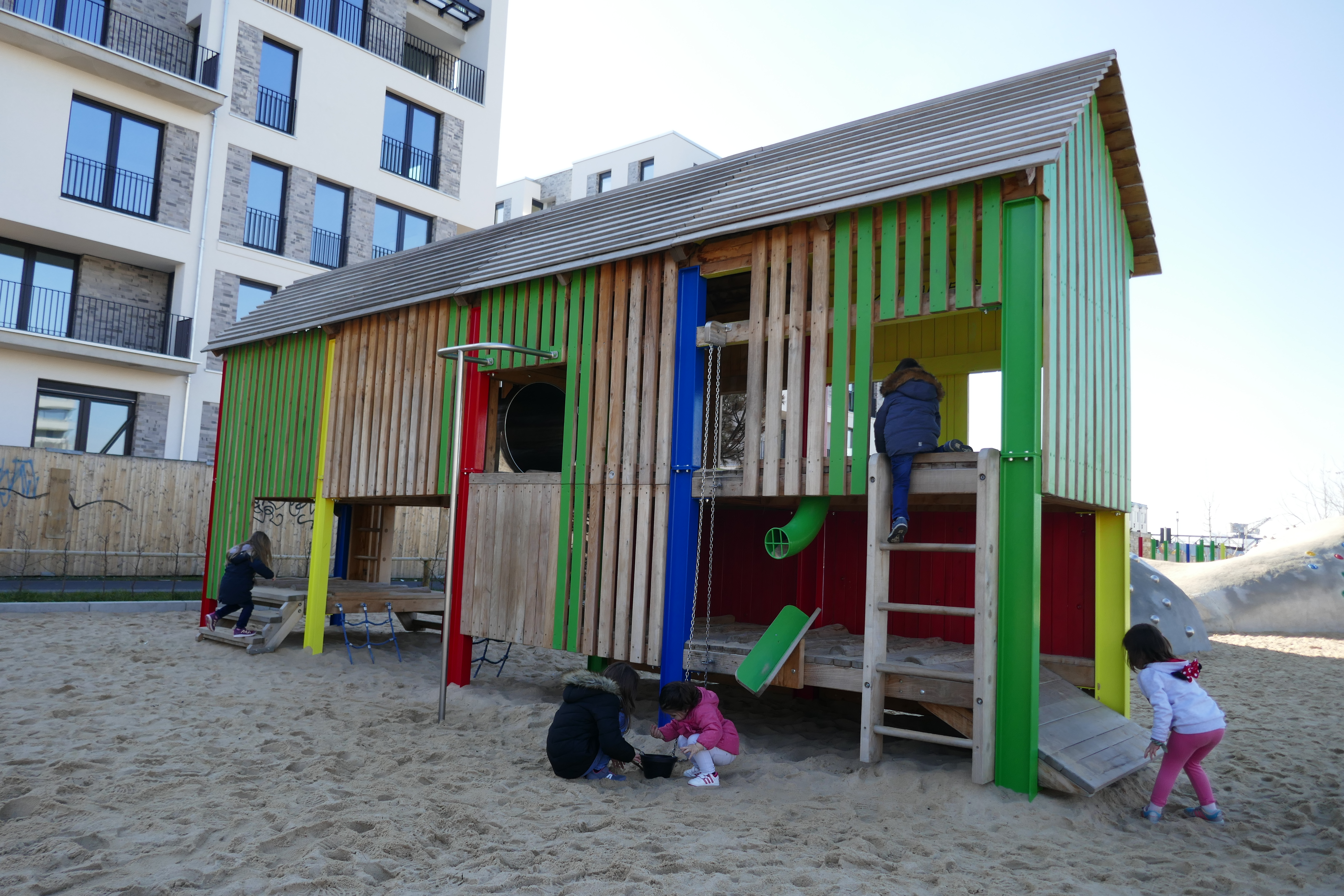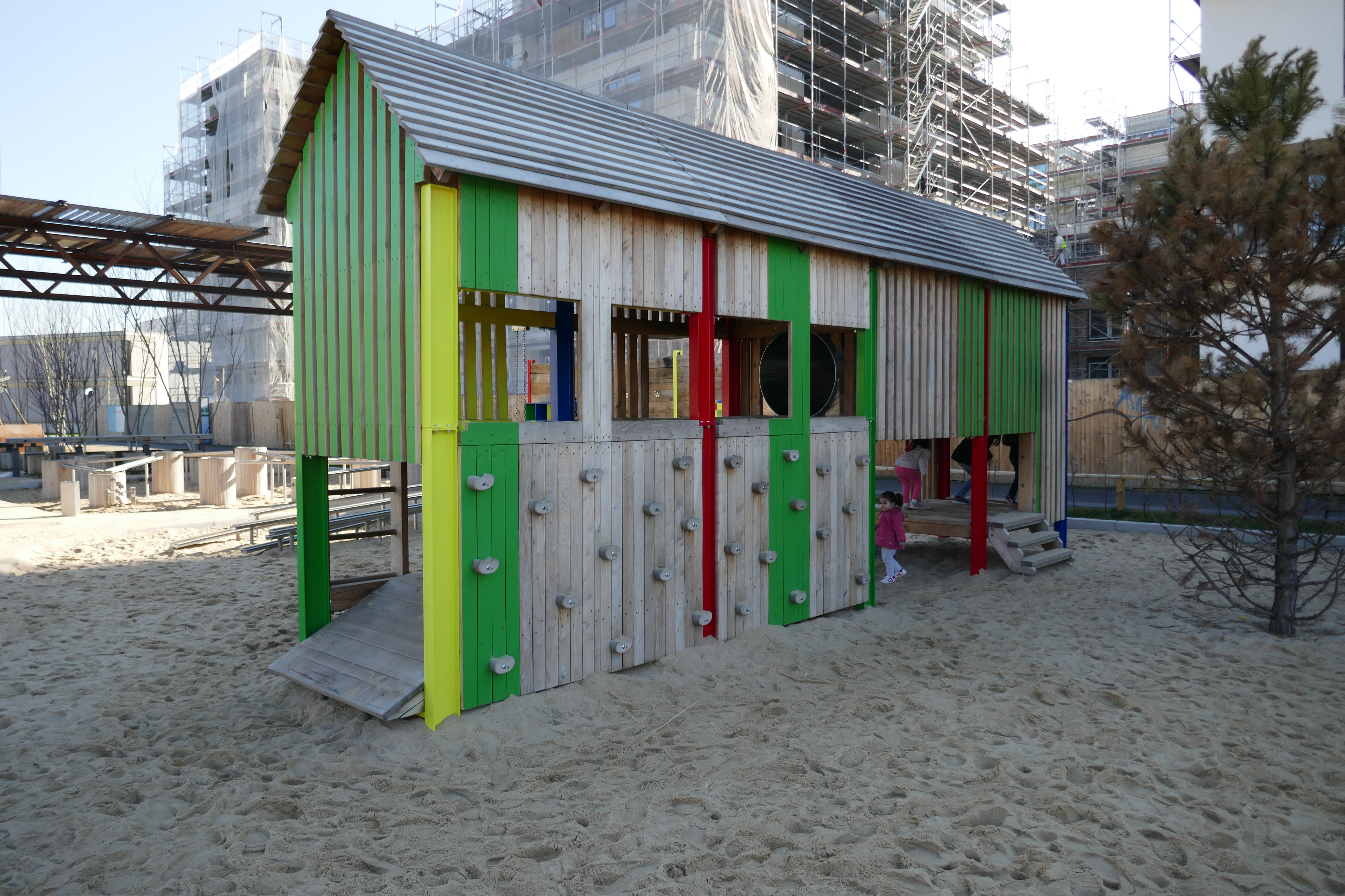 Das große Spielhaus mit seinen kunterbunten Kletterwänden und Durchgängen bietet Spielspaß für jedermann